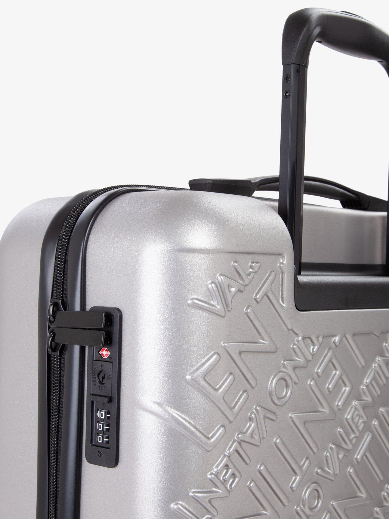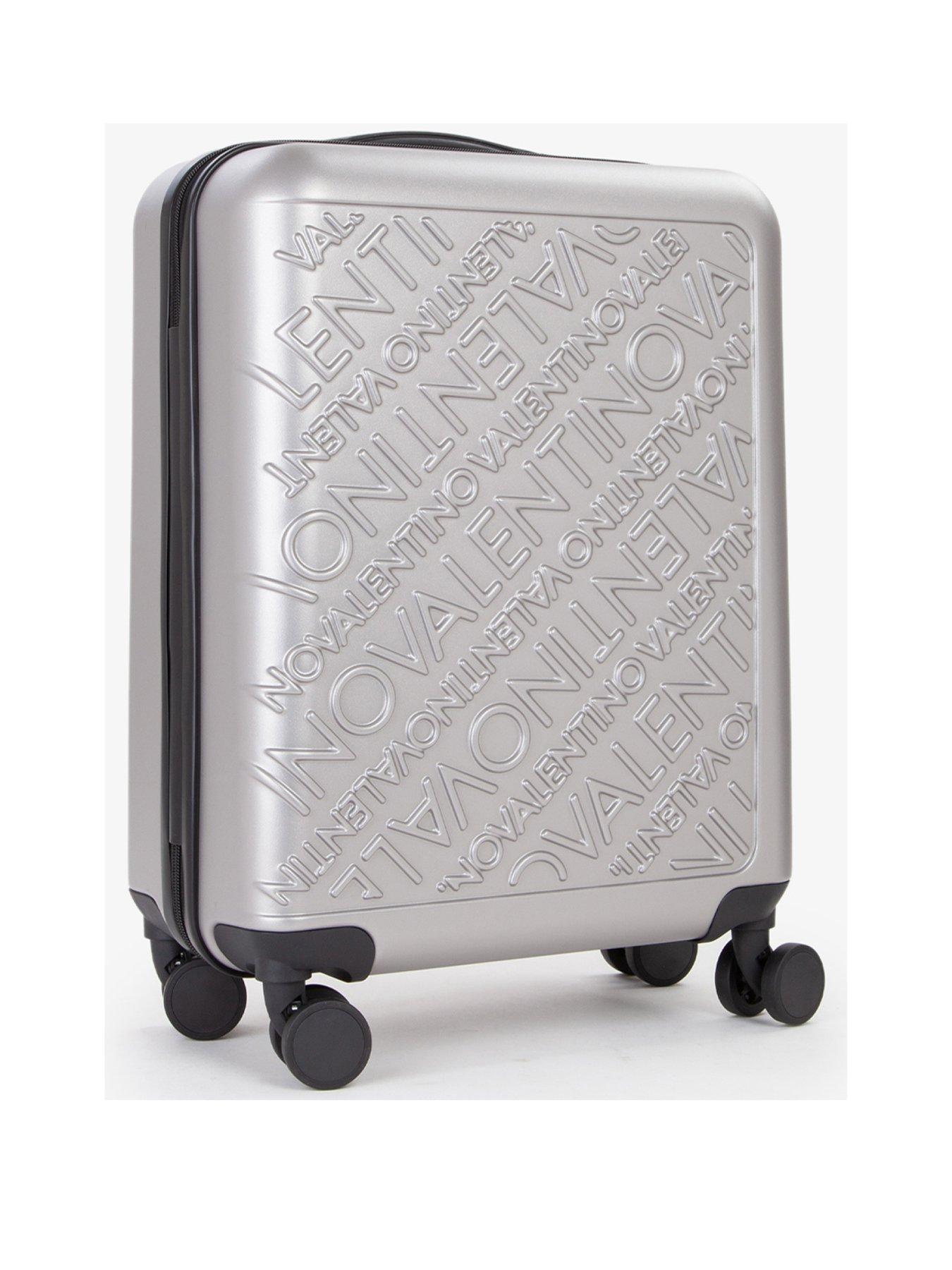 VALENTINO MARS SMALL-SIZE CARRY ON SUITCASE - SILVERVALENTINO Mercury carry-on gunmetal suitcase is cabin size freindly, perfect for weekends away or short trips. Made from hard-wearing polycarbonate. The interior is kitted out with a mesh, smaller zipped pockets to organise your belongings, both top handle, and adjustable drawbar, four spinner wheels, which makes for a very smooth journey.