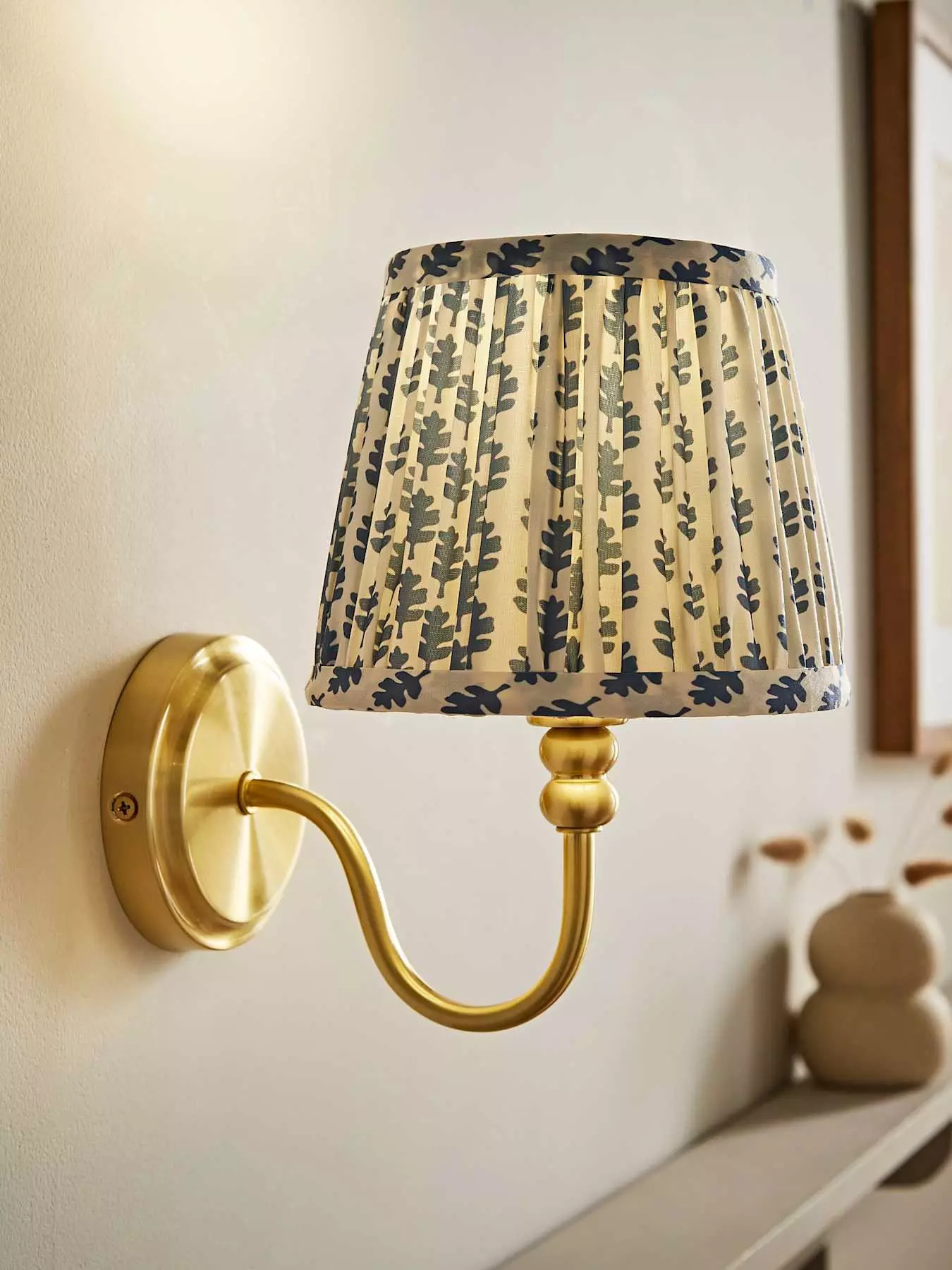 ValueLightsBinky Rechargeable Brushed Gold Wall Light with Blue Floral Pleated Shade