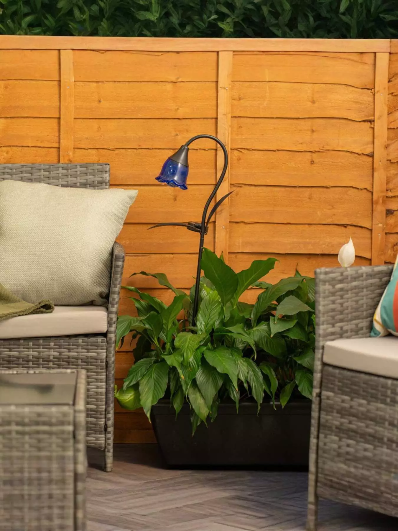 Illuminate any pathway or outdoor area with this large stake light. This light features an integrated solar panel with features a blue tulip on a black metal curved stem. Embrace the beauty of the night and transform your garden into an elegant retreat with this stunning lantern light. Simply place in a sunlit area during the day, and watch it come to life as the sun sets.- Depth: 100 MM