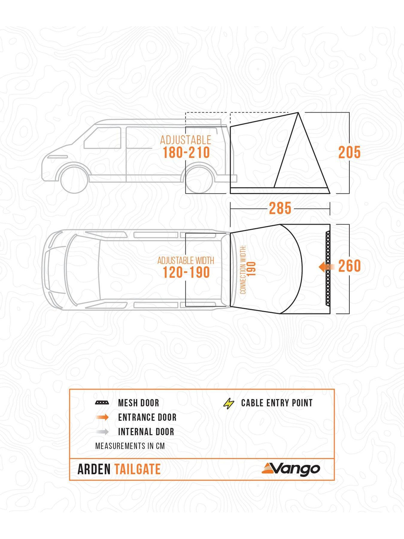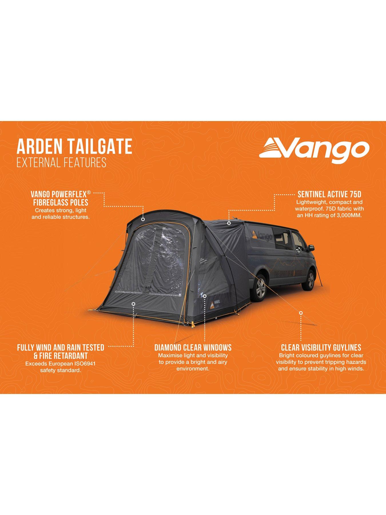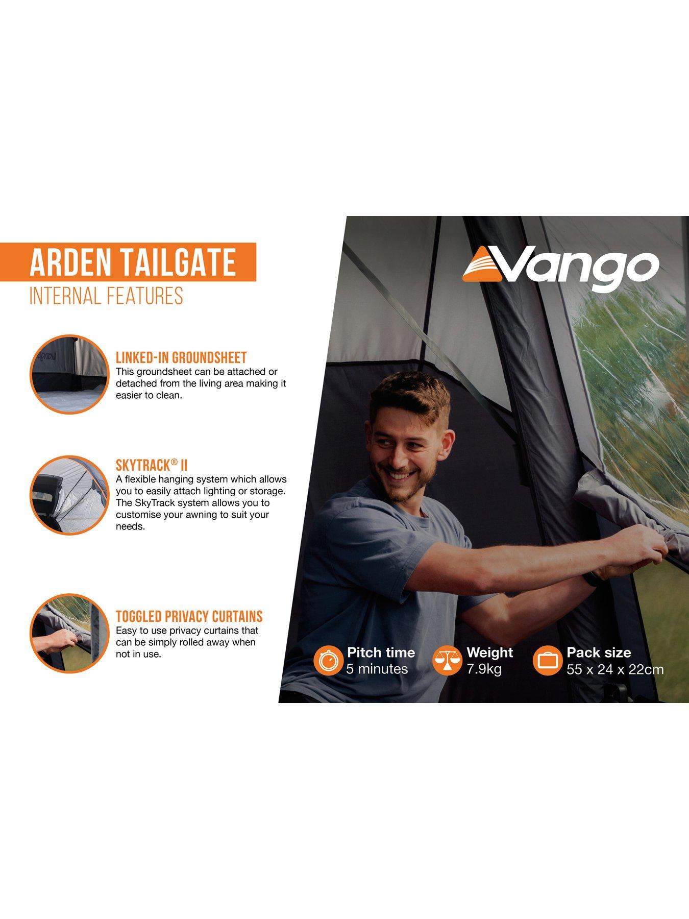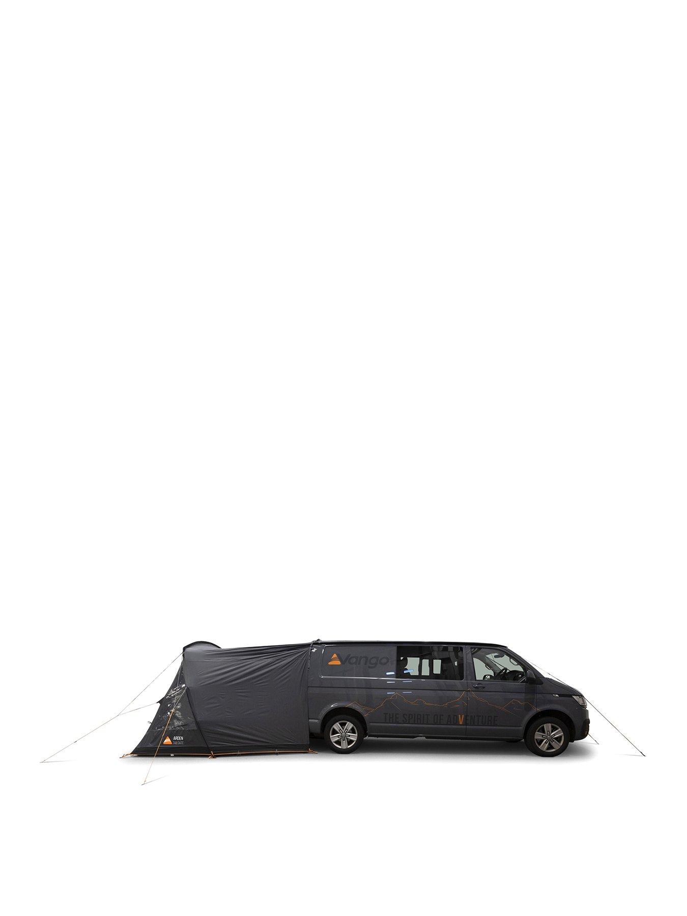 The Vango Arden Tailgate Drive Away is a compact, versatile, and easy-to-pitch awning for your low-height van or SUV.Set up your awning quickly and easily, knowing you have a reliable and comfortable shelter for your adventures. The Vango Arden Tailgate Drive Away Awning is designed to enhance your outdoor experience and provide peace of mind.Adjustable Tunnel Width This awning is designed with adjustable tunnel width, ensuring it fits perfectly onto low-height vans and SUVs. Effortless Attachment With pegging straps at the front of the vehicle and tunnel area, it attaches neatly without the need for kador rails. Traditional attachment options like roof bar attachment tabs and kador are also included. Compact and Portable Weighing just 7.9kg and featuring a compact pack size, it's easy to transport and store away when not in use. Spacious Design The awning offers a spacious area for relaxation and storage, with 2 doors in the connecting tunnel for convenient access. Durable Fabric Made from Vango's reliable and lightweight Sentinel Active 75D fabric, it ensures durability and a bright, airy environment with diamond clear windows. Privacy and Convenience Toggled privacy curtains can be rolled away when not needed, and there are lantern hanging points for added convenience. Wind and Rain Tested Fully tested to the European standard EN5912, it provides stability and protection in adverse weather conditions.