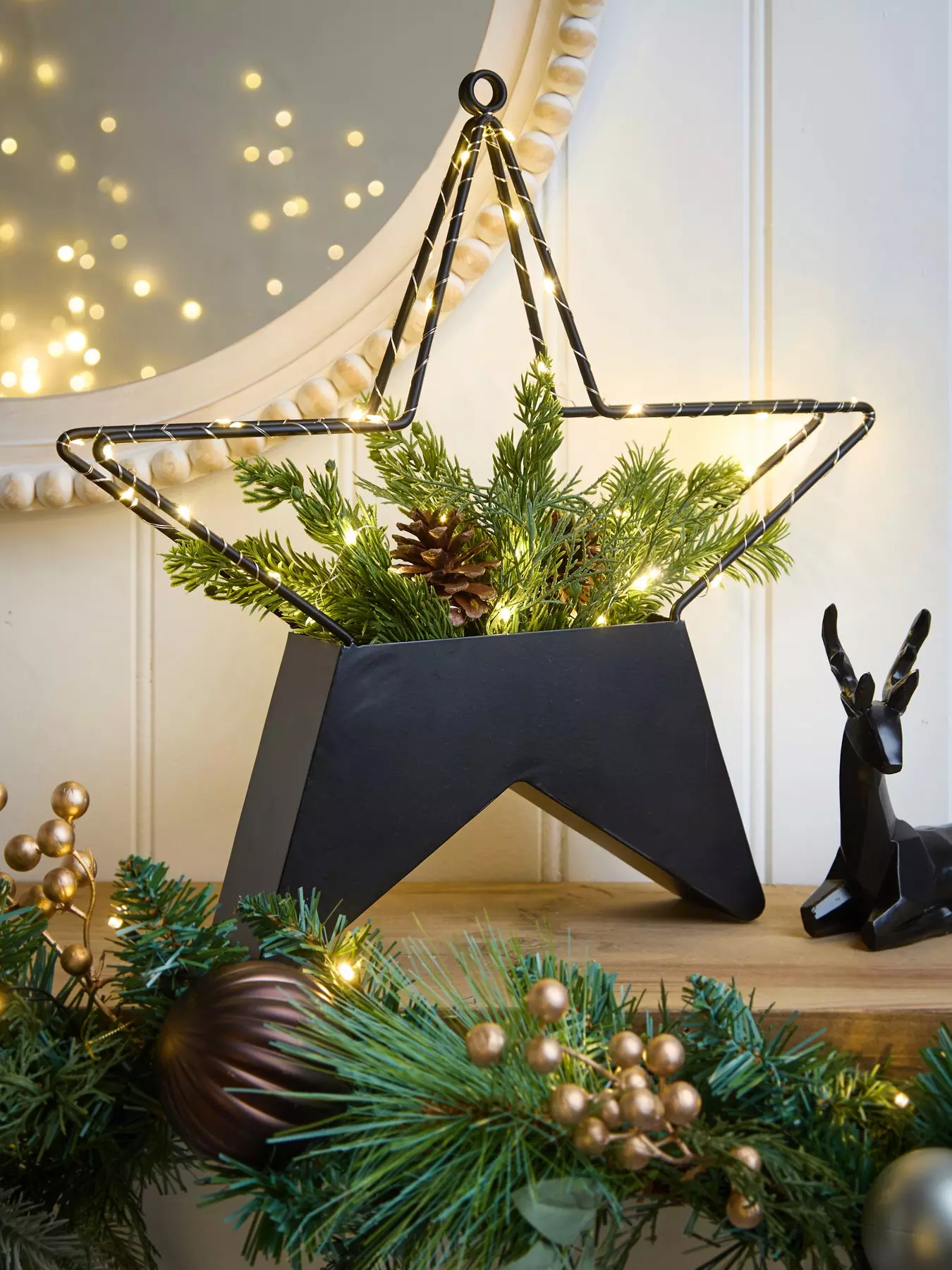 This 39 cm star features foliage detail and lights up with 40 LEDs - perfect for sitting on a shelf or sideboard... even the centre of your festive dining table! Requires 3x AA batteries (not included).- Depth: 390 MM