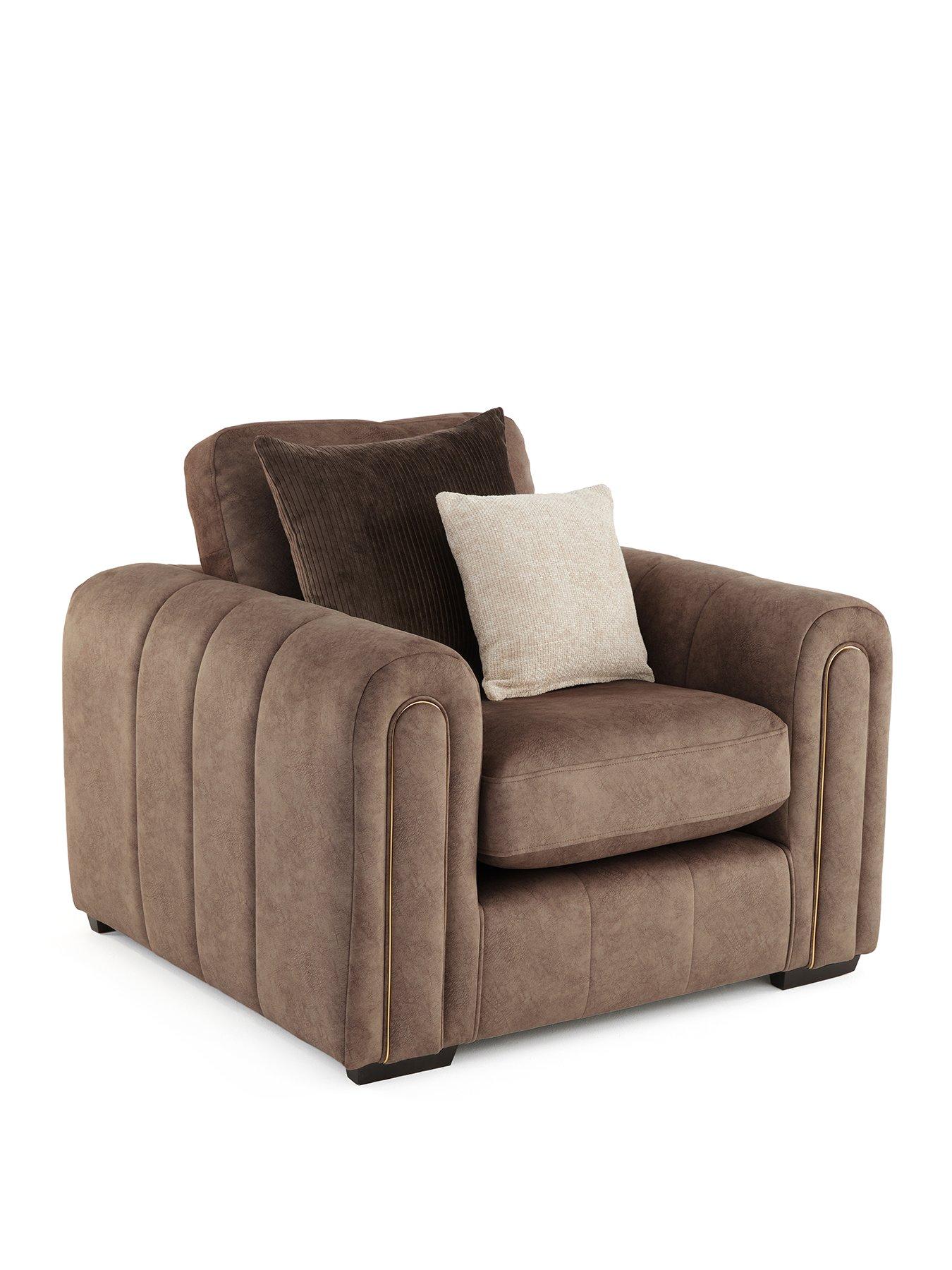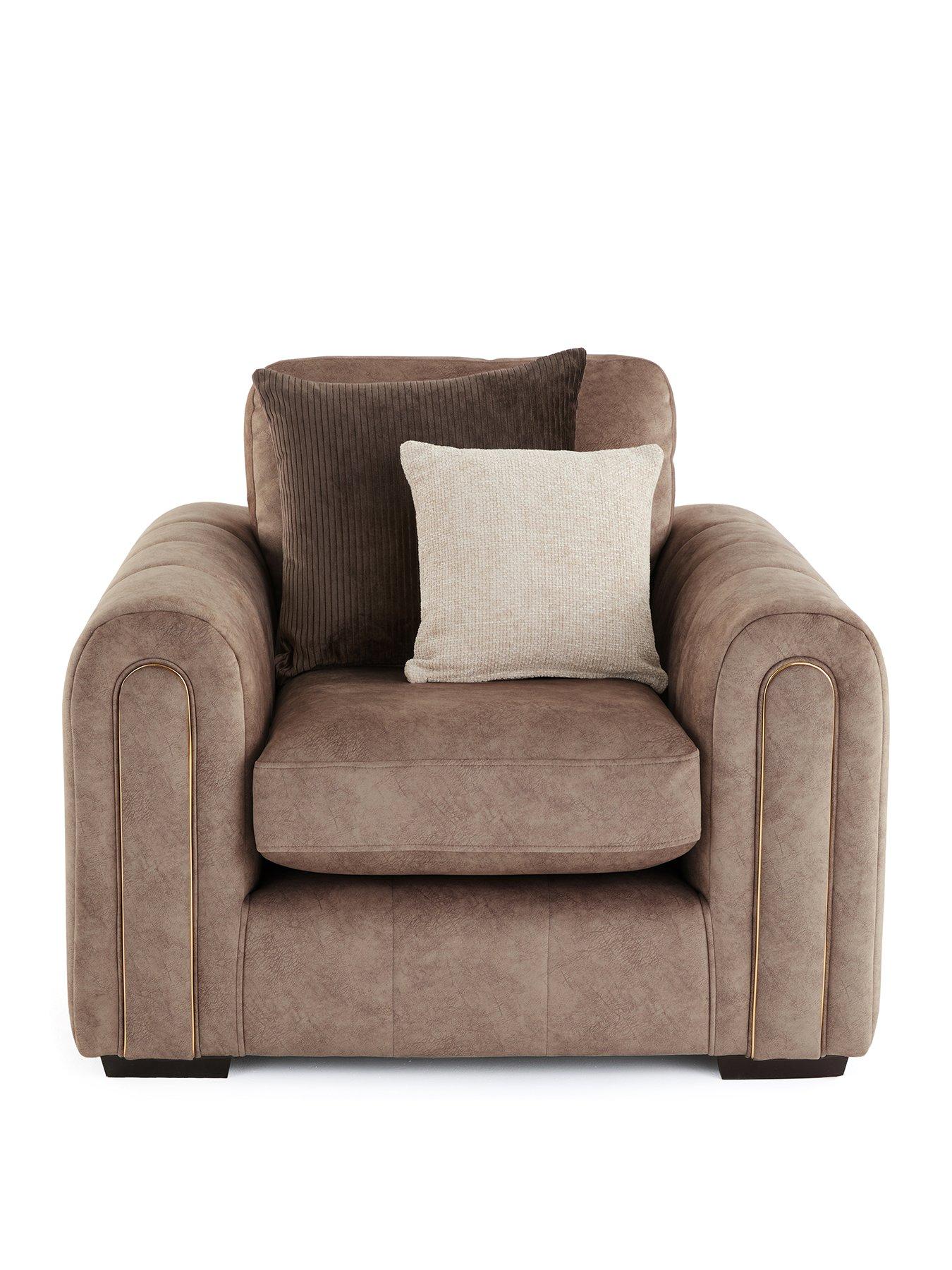Very Home Amara Armchair in Charcoal, Chocolate or Stone - Made to Order in the UKArt Deco inspoInspired by the Art Deco designs of the 1920s, the Amara is characterised by stunning curved arms with arch-shaped detailing to the front. This shaping is given added standout style with silver embellishment to the charcoal option and gold to the chocolate and stone versions. Wrapped in a wonderfully textured fabric, the sofa gets added good looks from the panels to the arms and fascia. All about the extras To make things even more indulgent, the armchair comes complete with a pair of accent cushions in contrasting fabrics and shades. Free Swatch Service Get a feel for this fabric before you buy with our FREE swatch service. Simply email SwatchOrder@ClickSpares.co.uk with your name and address, along with the sofa range name, item number, colour choice and the name of the retailer’s website you’re ordering from. Your swatches will be delivered within 5 working days (subject to availability). Please remember to measure your available space before ordering. Dimensions: Height 85, Width 108, Depth 95 cm