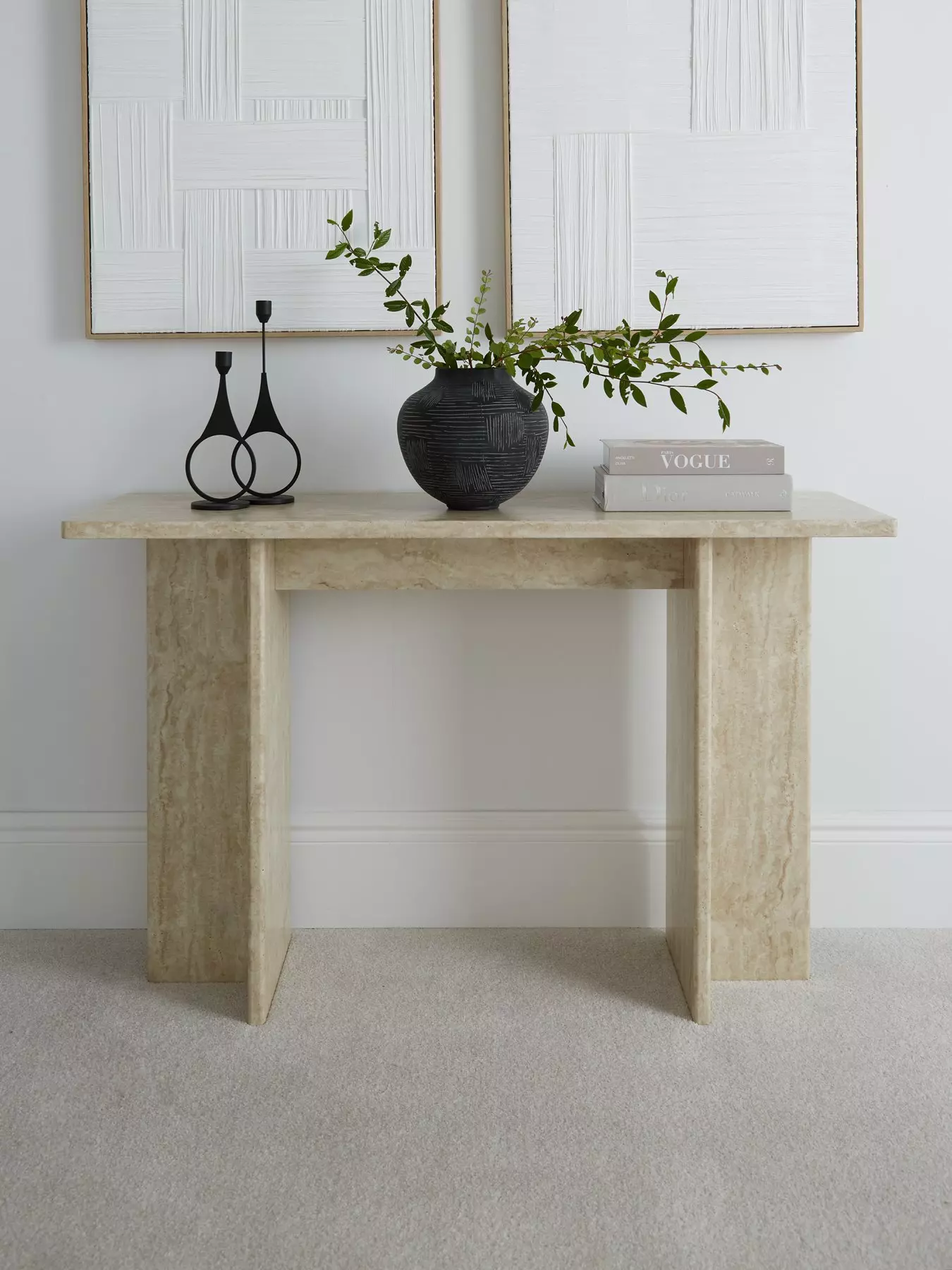 Give your entranceway or lounge a taste of the Med with this stunning side table from Very Home's Bloc collection.Simply styled, the eye-catching look comes from a warmly coloured travertine stone-effect which features an intricate collection of patterns. Rounded corners and edges give it a smooth finish, while the table top is supported by a stylish right angle legs.