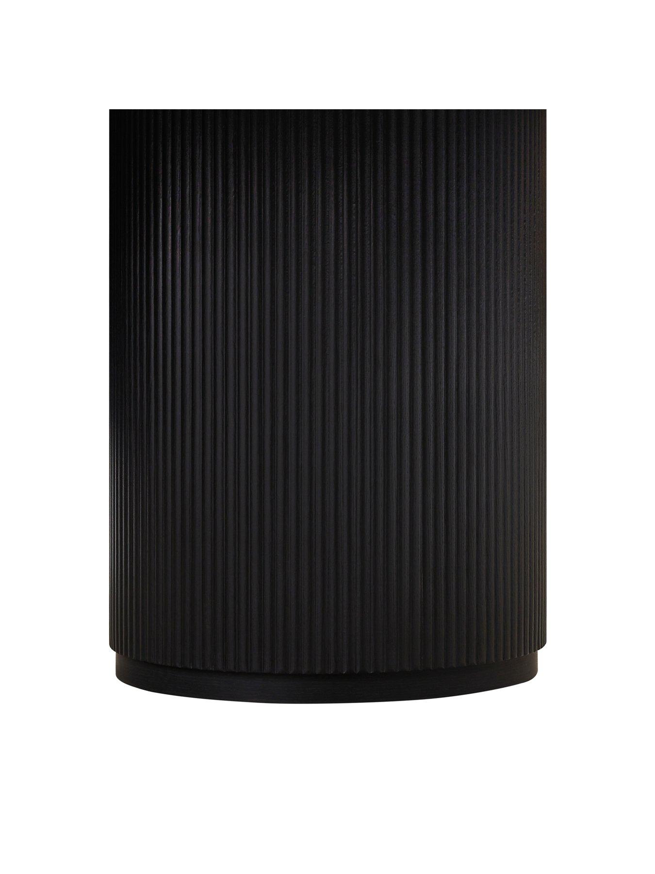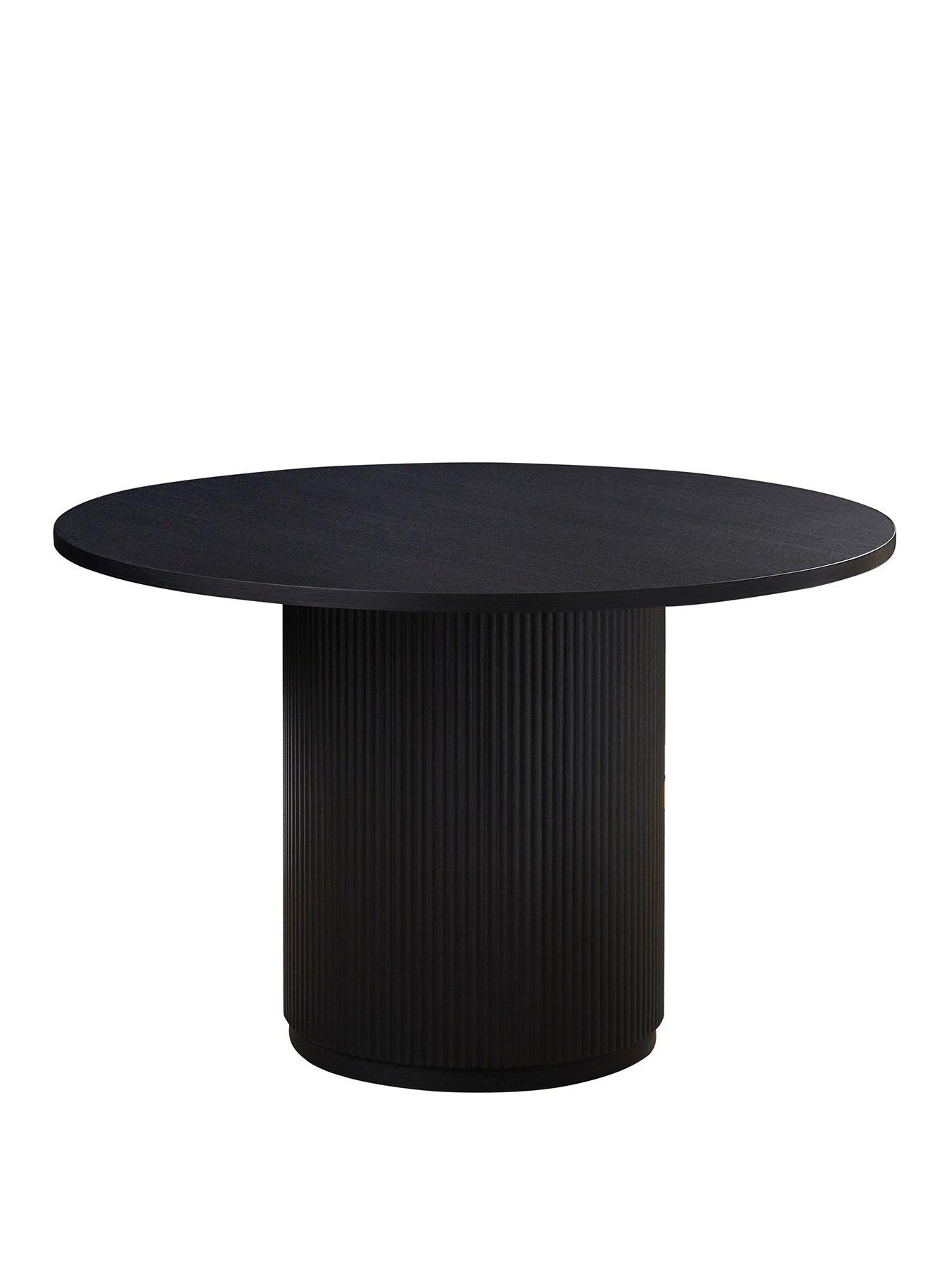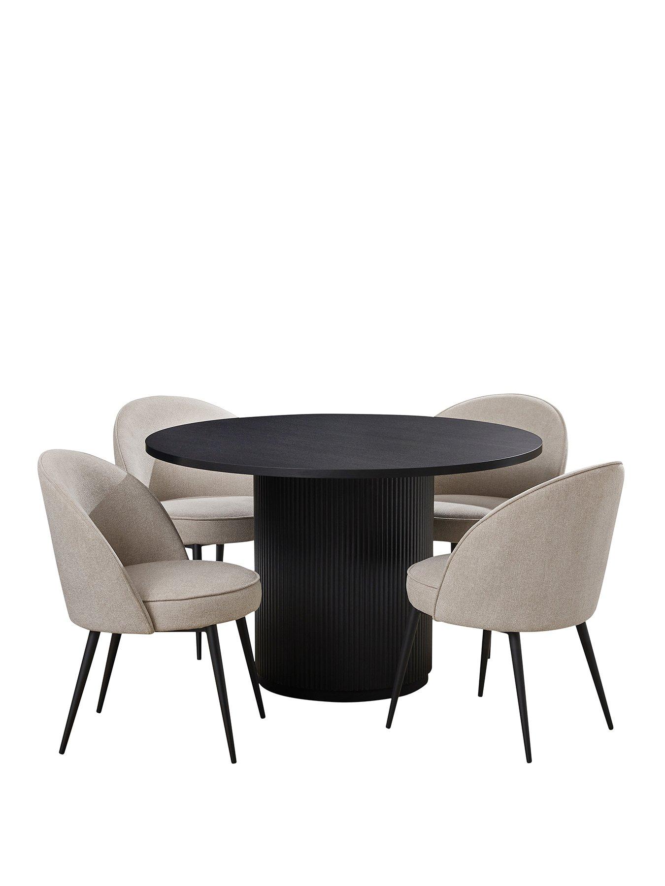 Very Home Carina Round 120 cm Dining Table and 4 Chairs - Black/Grey - FSC® CertifiedThis modern Carinia dining set by Very Home will create a contemporary eating area in your space.The stylish circular table features a 120 cm diameter top and sits on a chunky pedestal. It's finished in a bold black shade and comes complete with four stunning chairs. Upholstered in a textural grey fabric, they're padded for comfort during all three courses, while a curved seat and back echo the round edges of the table. The chairs sit on black slimline spindle legs which are splayed for a Scandi-style finish. Please remember to measure your available space before ordering. Dimensions: Table - Height 76, Diameter 120 cm Chairs - Height 80, Width 48, Depth 48 cm