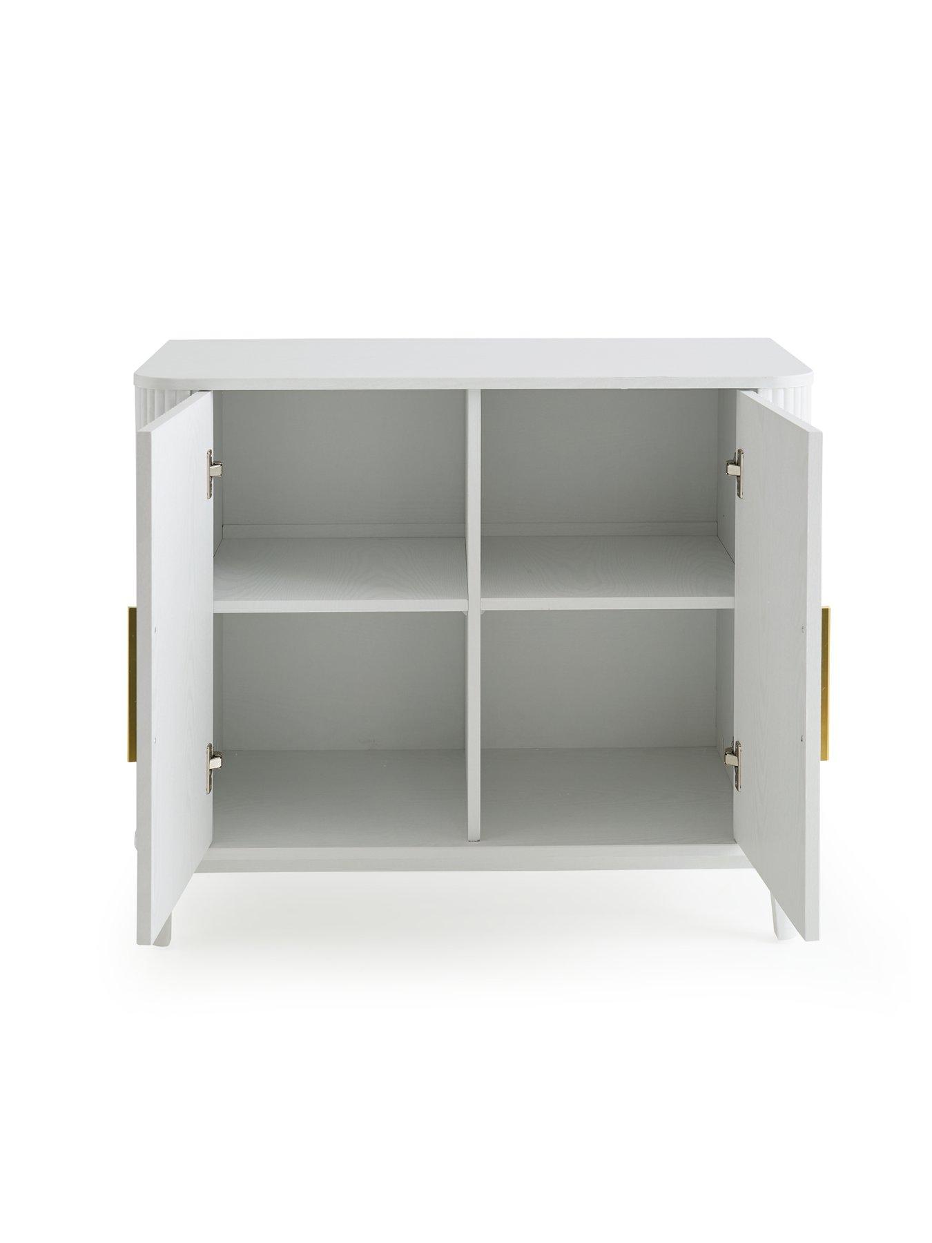 Very Home Carina Small 2 Door Sideboard in White - 90 cm wide - FSC® CertifiedThe Carina collection from Very Home gets its eye-catching good looks from the curved corners which are detailed with textural ribbing that also covers the sides and doors.This small sideboard comes in a clean white hue you can match with all kinds of decors, and it features an internal shelf for neat organisation of all your things. It sits on smartly curved feet and is accented with gold coloured metal handles. You can add a range of matching furniture from this collection, which is all available separately. Please remember to measure your available space before ordering. Dimensions: Height 75, Width 90, Depth 45 cm