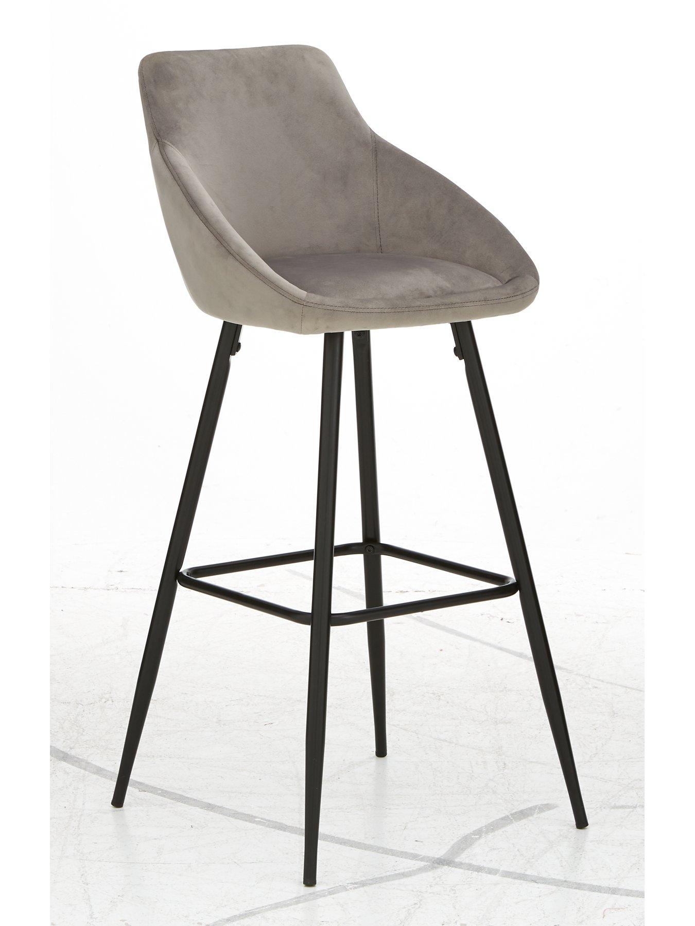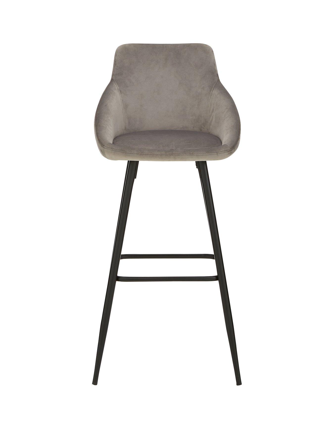 Dahlia Fabric Bar Stool in Grey/Black - FSC® CertifiedIdeal for adding a modern, comfy finish to a bar, breakfast counter or kitchen island, this Dahlia stool is lightly padded for softness and upholstered in a textural grey fabric.It sits on Scandi-style legs in a contrasting black finish, and the foot rests makes it extra relaxing. Please remember to measure your available space before ordering. Dimensions: Height 102, Width 46, Depth 50 cm