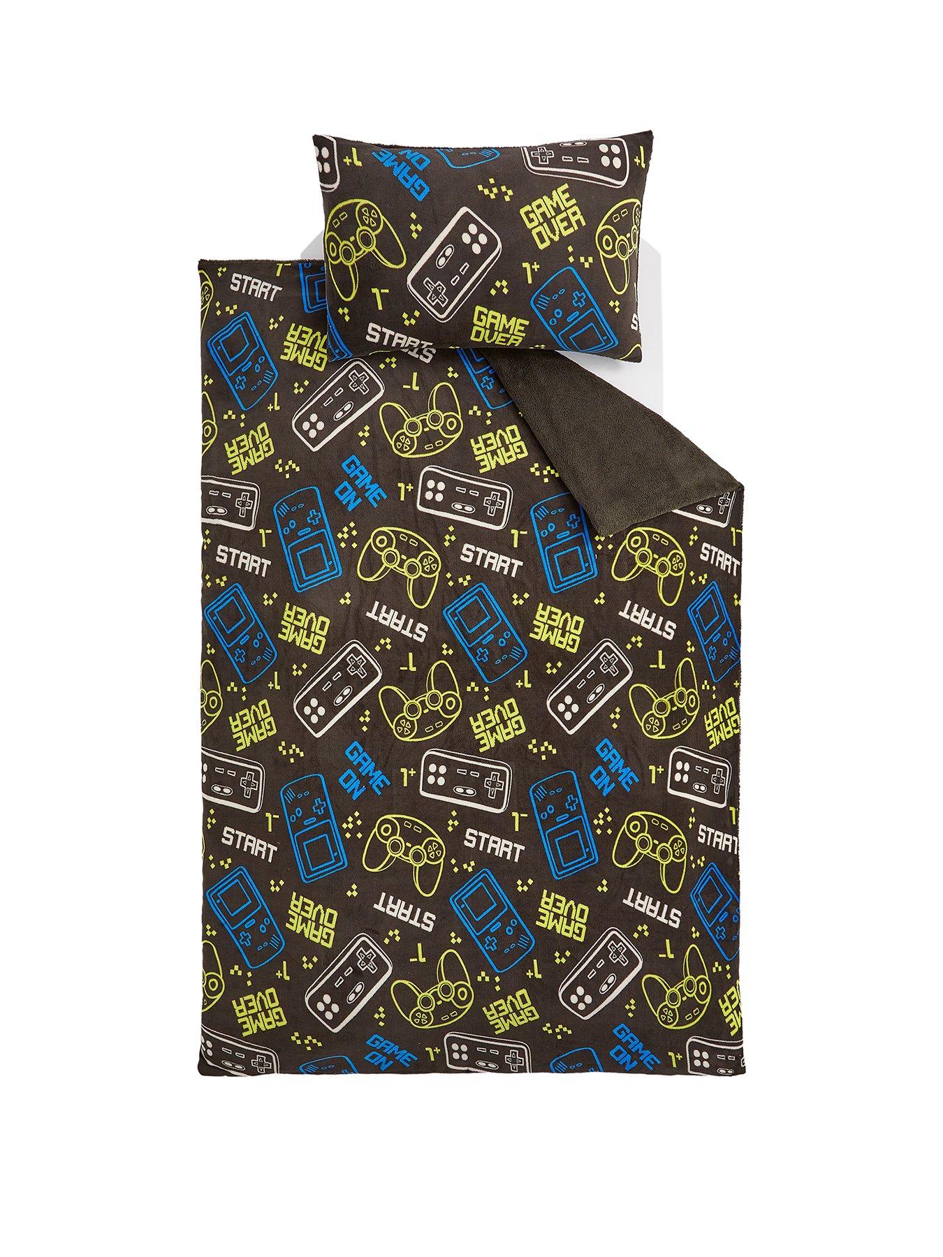 Very Home Game On Printed Fleece Duvet Cover and Pillow Case Set in Single and Double SizesPerfect for gamers, this duvet cover set is covered in controllers and features bright neon colours that will brighten up their bedroom. The underside of the cover is fleecy to keep them warm in the wintertime.A set comprises 1 duvet cover plus 1 pillowcase with the single size and 2 pillow cases with the double size.