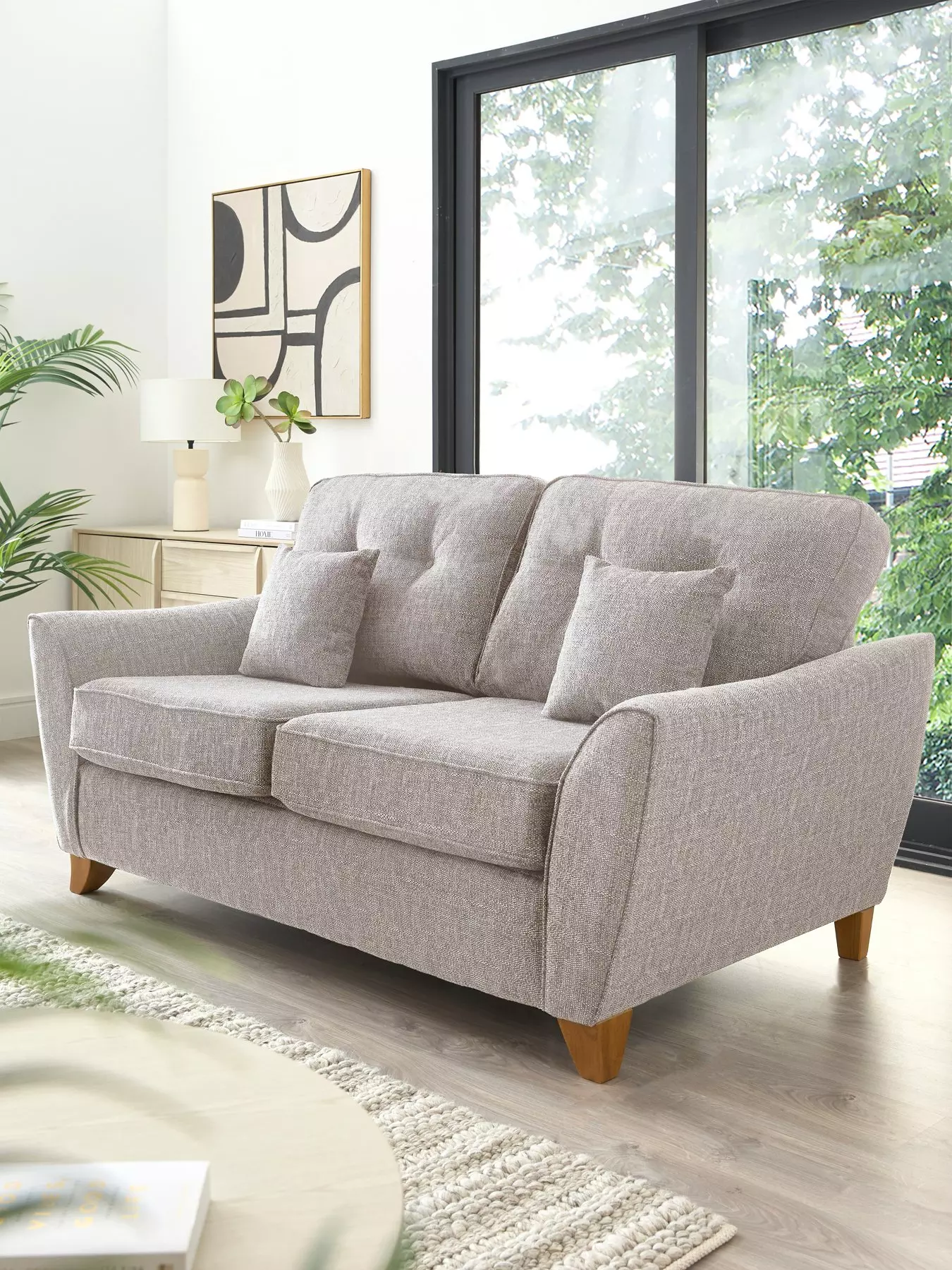 Affordable styleThis great value sofa bed from Very Home's Halstow collection is wrapped in a wonderfully woven fabric that features a silver colourway. Styled with button-back cushions, stunning sloped arms and wooden feet that sit at an opposite angle, it comes complete with two accent cushions.