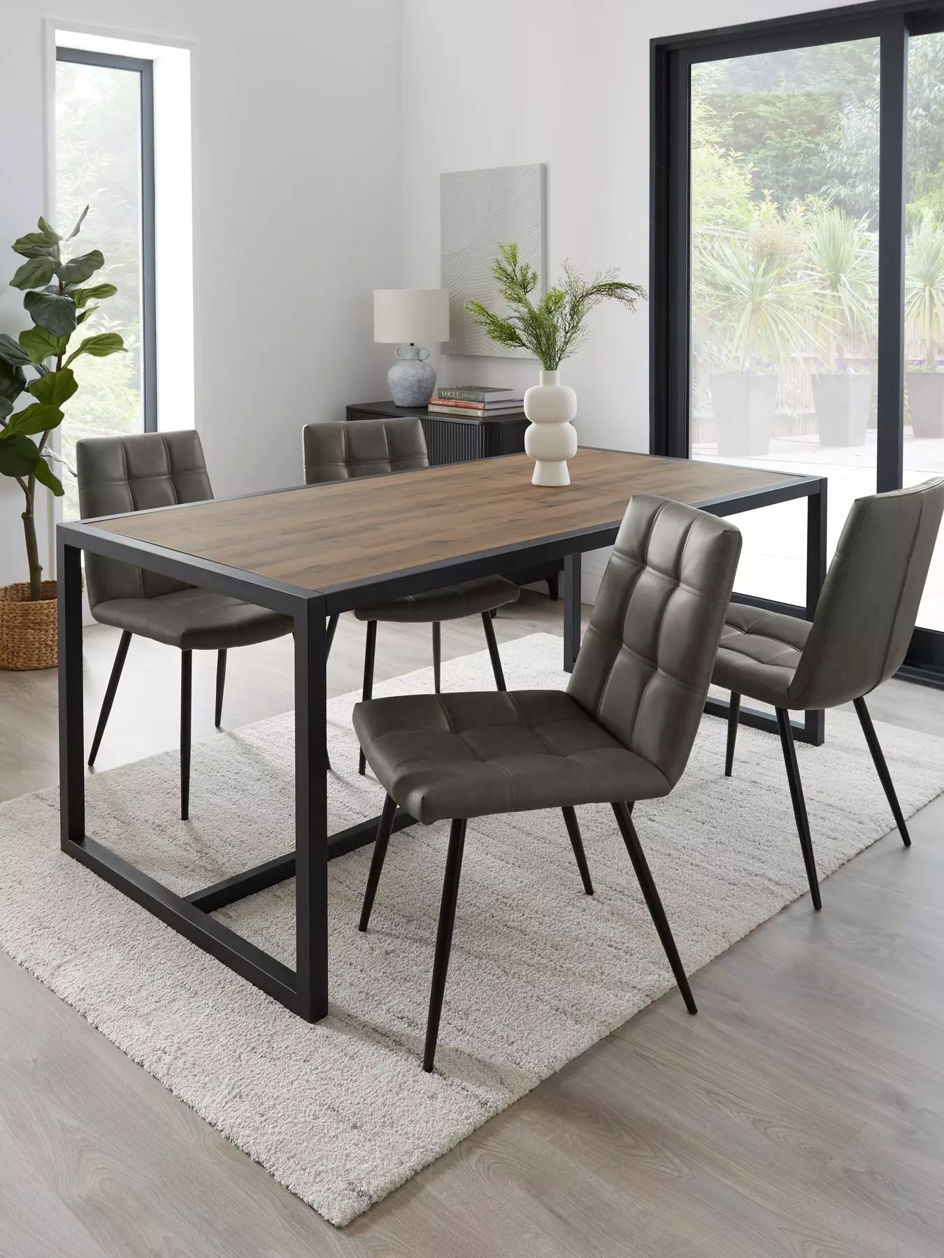 Mixing rustic charm with the popular industrial theme, the Harlem dining table from Very Home flaunts a fashionable blend of materials. The black metal frame helps highlights the furniture's straight lines and clean profile, while the table top that's set into it is finished with a smartly grained mid oak-effect.It measures 180 x 90 cm, offering plenty of room for the 4 Harlem chairs that come with it. These are wrapped in a stylish grey faux leather fabric that will add a modern finish to the table.