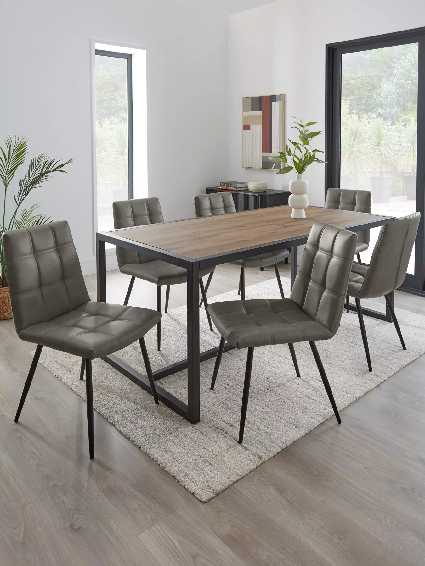 Mixing rustic charm with the popular industrial theme, the Harlem dining table from Very Home flaunts a fashionable blend of materials. The black metal frame helps highlights the furniture's straight lines and clean profile, while the table top that's set into it is finished with a smartly grained mid oak-effect.It measures 180 x 90 cm, offering plenty of room for the 6 Harlem chairs that come with it. These are wrapped in a stylish grey faux leather fabric that will add a modern finish to the table.