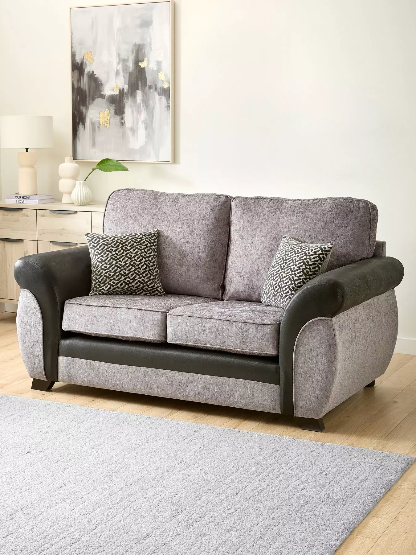 This Marino sofa is upholstered in a modern mix of fabrics, with softly piled grey chenille pairing with black faux leather that highlights the curved arm and fascia.