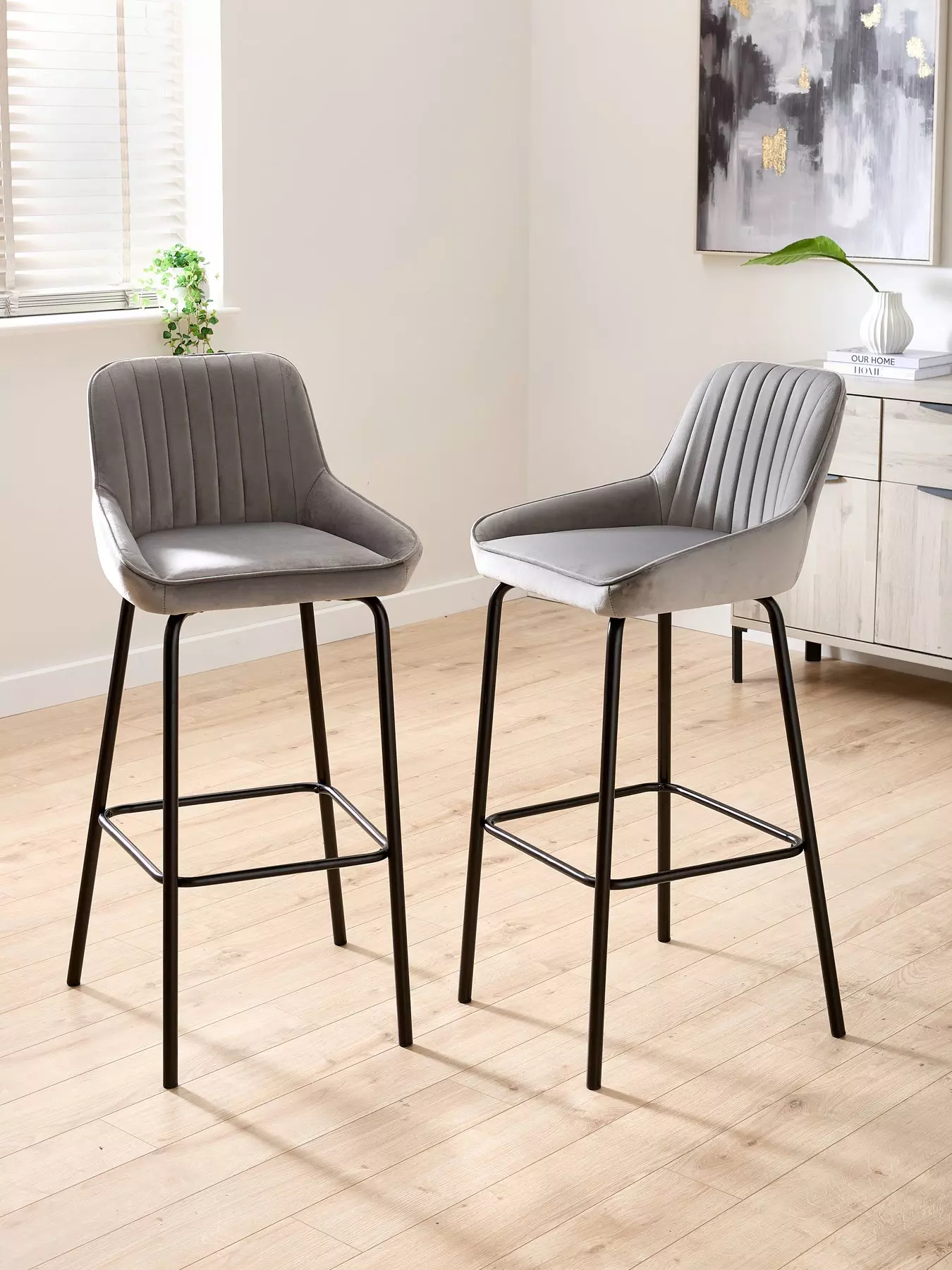 Give your breakfast bar a touch of classic elegance with this set of 2 comfortable Marlow stools.Beautifully designed, they're wrapped in a textural velvet fabric that comes in a grey hue. The backs boasts beautiful vertical stitching detail, and they sit on Scandi style black metal legs with a foot rest for support.