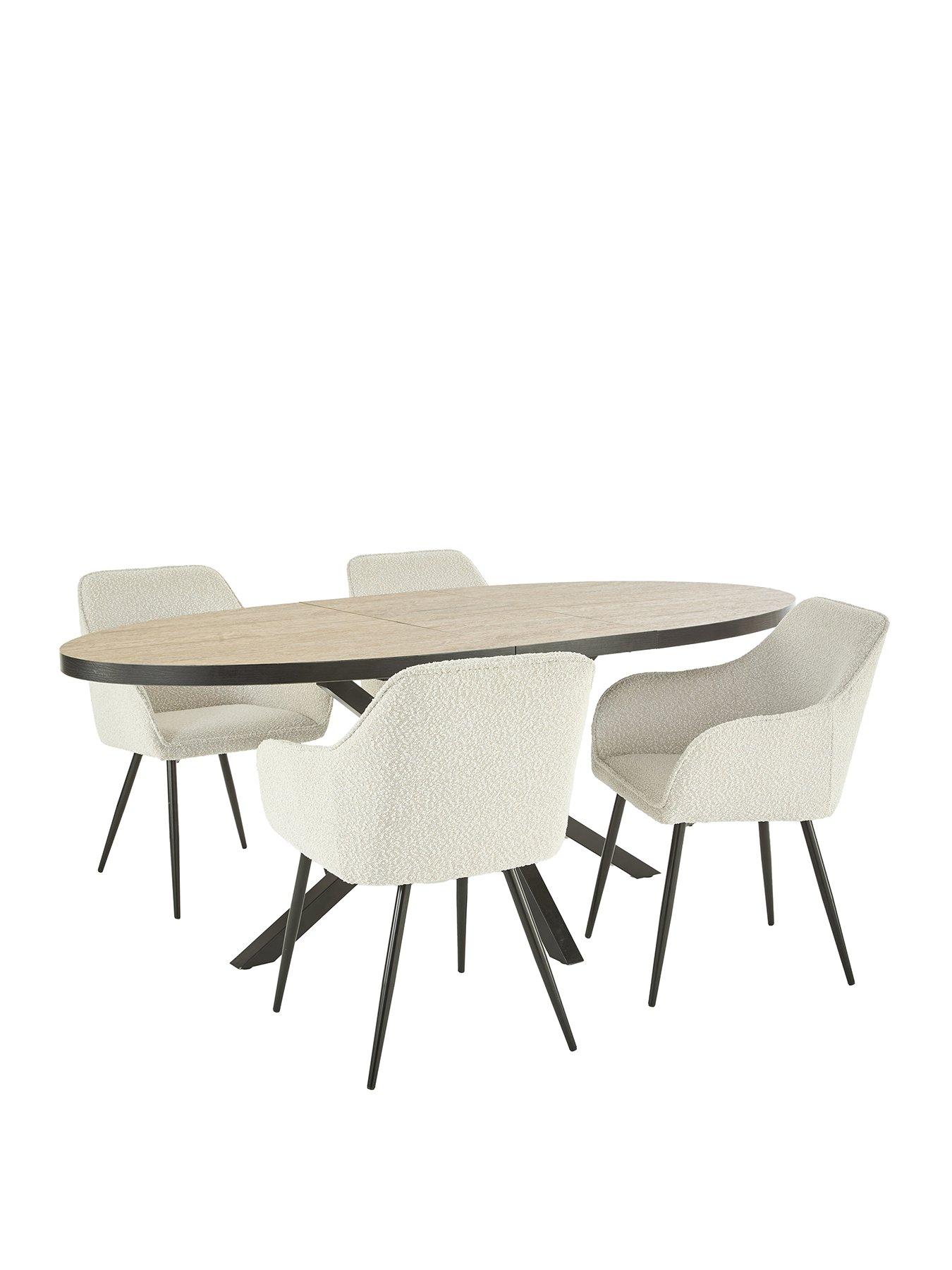 Very Home Oslo Extending 160-200cm Dining Table & 4 Alisha Boucle ChairsOslo Extending Dining TableThis ultra modern dining table from Very Home's latest collection of furniture is ideal for creating a contemporary eating area in smaller spaces, while still having a special trick up its sleeve to create more room when extra guests come to dinner. It has a smooth wood-effect top that measures 160cm in length and can be extended to 200cm for special occasions and dinner parties. In addition, the Oslo Extending Dining Table is strikingly supported by bold black chopstick legs which give this table the eye-catching contemporary appearance that will wow your friends and family every time. 4 Alisha Boucle Chairs Wrapped in a wonderfully textured boucle fabric, their sumptuous cream hue is contrasted by the trendy Scandi-style black legs that give them an eye-catching mid-century modern vibe. Please remember to measure your available space before ordering. Dimensions: