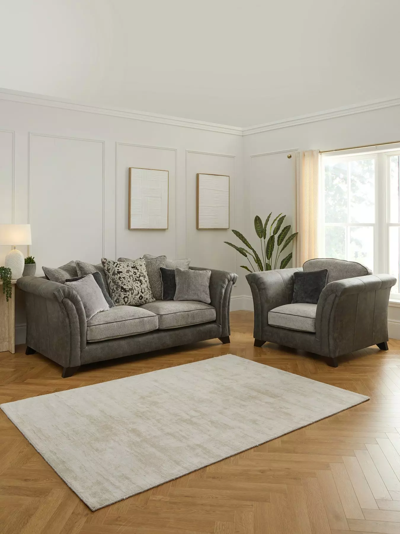 Old school eleganceStyled with a classic design that will add some regal charm to your living room, the Regent sofa and armchair set by Very Home flaunts a sumptuous fabric upholstery. The silver inner contrasts with a charcoal outer, helping to highlight the flared arms and wooden feet. The scatter cushions to the sofa include a range of colours, as well as a patterned version with a plain reverse that lets you flip it for a different look, while the armchair comes with a single accent cushion.