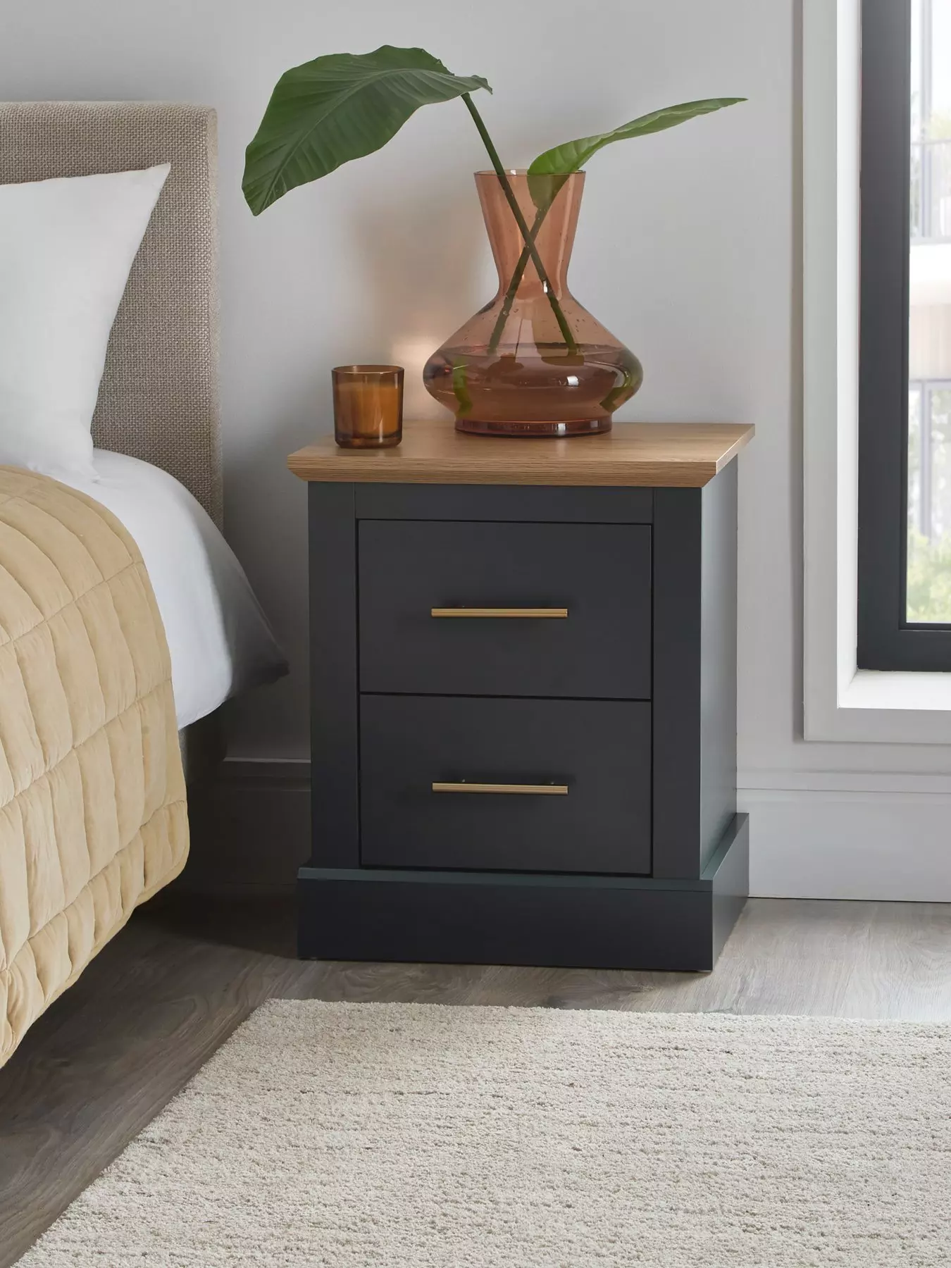 This stunning bedside chest comes from Very Home's Shenfield collection of furniture. Standing on a chunky plinth, it's finished in a graphite colourway and boasts a contrasting wood-effect top. Two storage drawers are accented with metal bar handles and glide open on metal runners.Please remember to measure your available space before ordering.