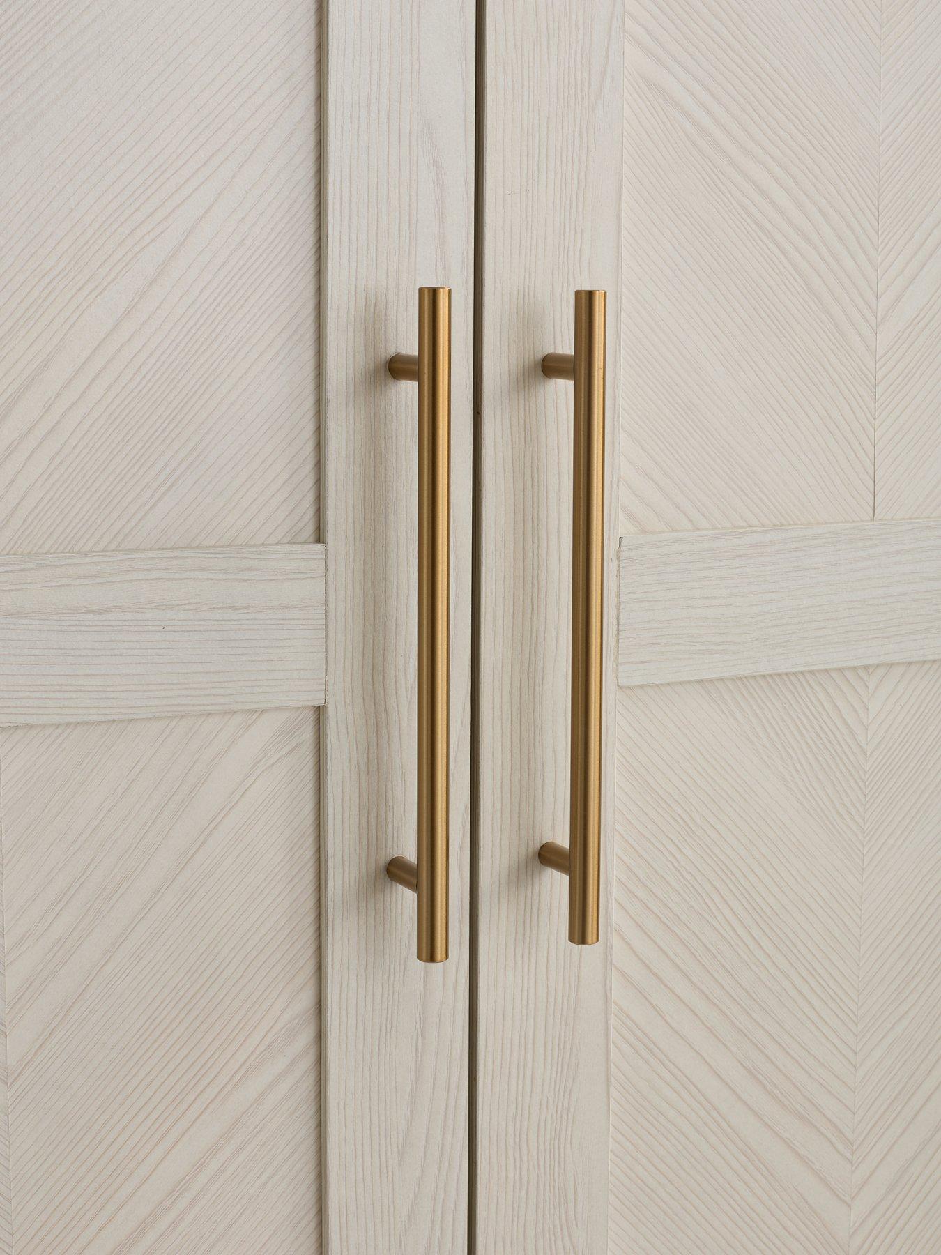 Very Home Tilbury 2 Door Wardrobe in White - FSC® CertifiedThis modern wardrobe from Very Home's Tilbury collection comes in a grained white wood-effect and features panelled doors with chevron detail. Finished with boldly coloured metal bar handles, the inside contains a hanging rail and high shelf.Please remember to measure your available space before ordering. Dimensions: Height 191.3, Width 78.5, Depth 58 cm