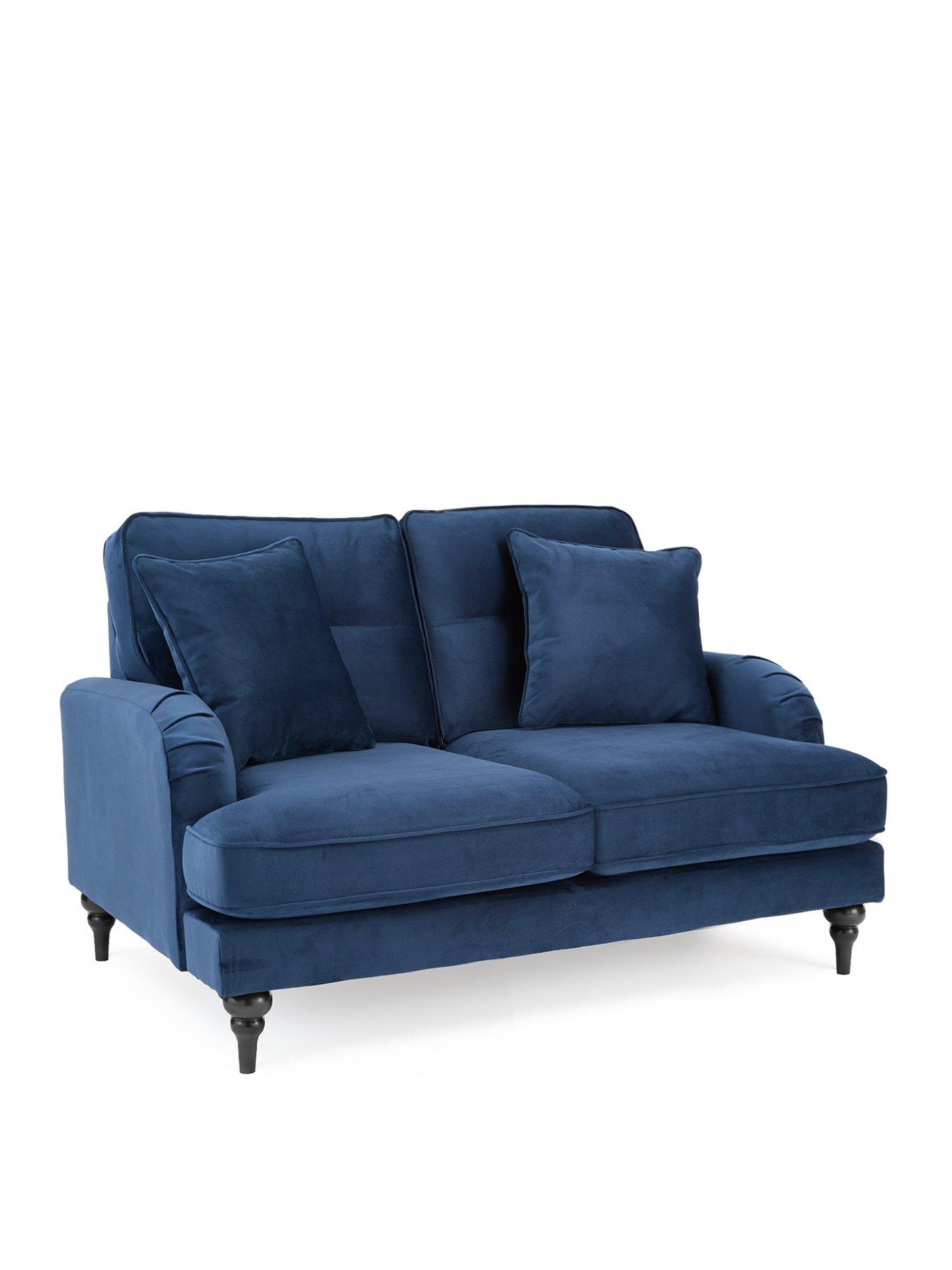 Very Home Victoria 2 Seater Fabric Sofa in Navy - FSC® CertifiedH 91 x W 150 x D 96 cmTrue velvet Buttery soft velvet fabric upholstery comes in a smart navy shade that's the perfect match for its elegant silhouette. Iconic shape Inspired by the classic bridgewater sofas, the Victoria has set-back arms that are rounded and detailed with pleated embellishment. It's detailed with contrasting dark turned feet that look great on carpet and laminate floors. Comfy cushions Fibre-filled back cushions have an attractive split design, while seats are foam-filled for support. The sofa comes complete with two accent cushions, and all the cushions are removable for easy plumping (make sure you do this regularly to maintain their shape). Get the look You can get more from Very Home's Victoria collection by adding co-ordinating pieces, which are available to separately. Search 'Victoria' to see the full range. Free Swatch Service Get a feel for this fabric before you buy with our FREE swatch service. Simply email SwatchOrder@ClickSpares.co.uk with your name and address, along with the sofa range name, item number, colour choice and the name of the retailer’s website you’re ordering from. Your swatches will be delivered within 5 working days (subject to availability). Please remember to measure your available space before ordering. Dimensions: Height 91, Width 150, Depth 96 cm