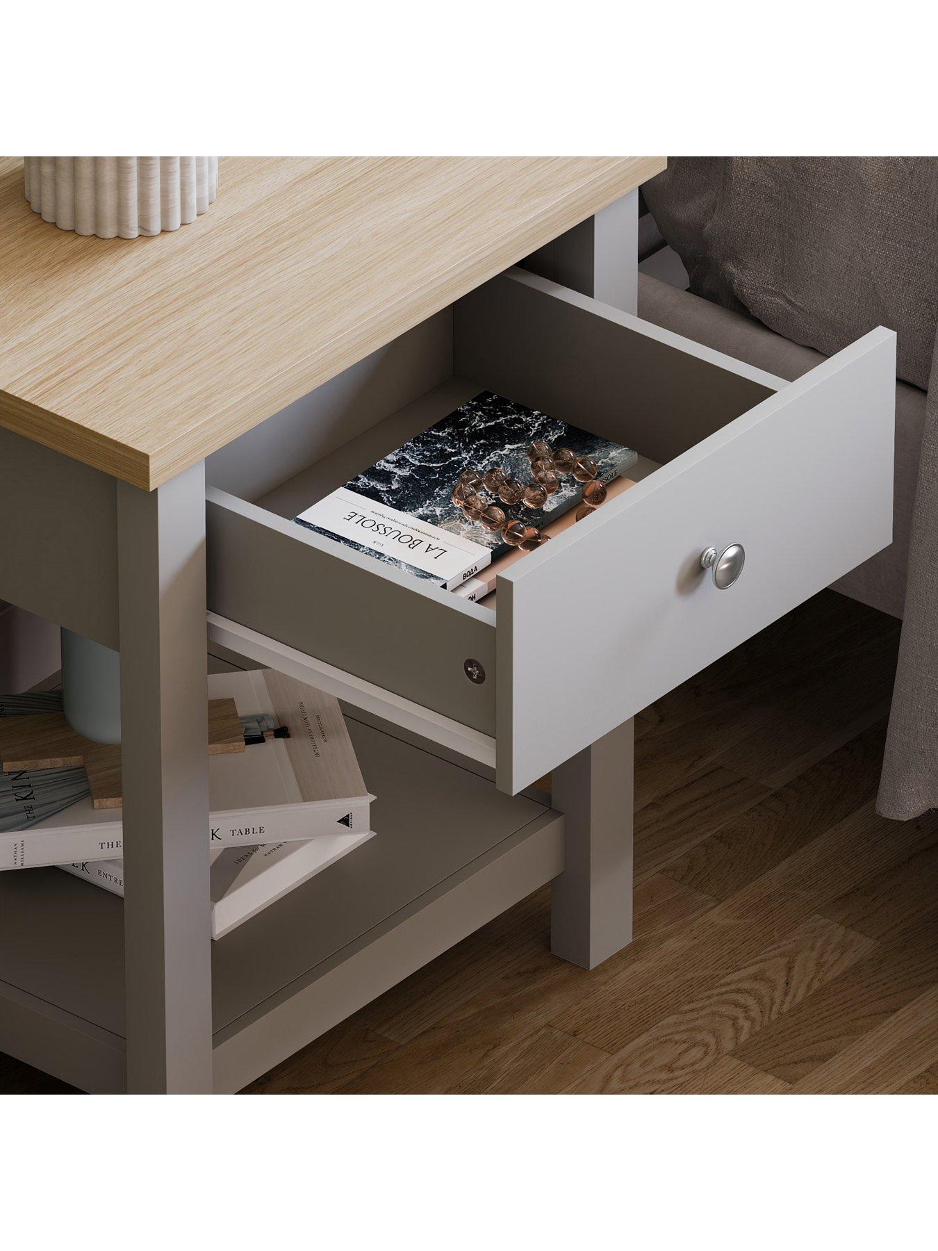 Vida Designs Arlington 1 Drawer Side Table in GreyPart of Vida Designs' Arlington collection, this side table features a smooth grey finish that's contrasted by a wonderfully grained oak-effect top - ideal for creating a country cottage feel in your room.Styled with chunky legs for a substantial look, its single drawer is a handy hideaway for clutter. It's finished with metal knob handles and easy-glide metal runners that result in a smooth open/close action. Please note: this product will be delivered flat packed and will require self-assembly, easy to follow instructions will be provided. Please remember to measure your available space before ordering. Dimensions: Height 55, Width 45, Depth 40 cm