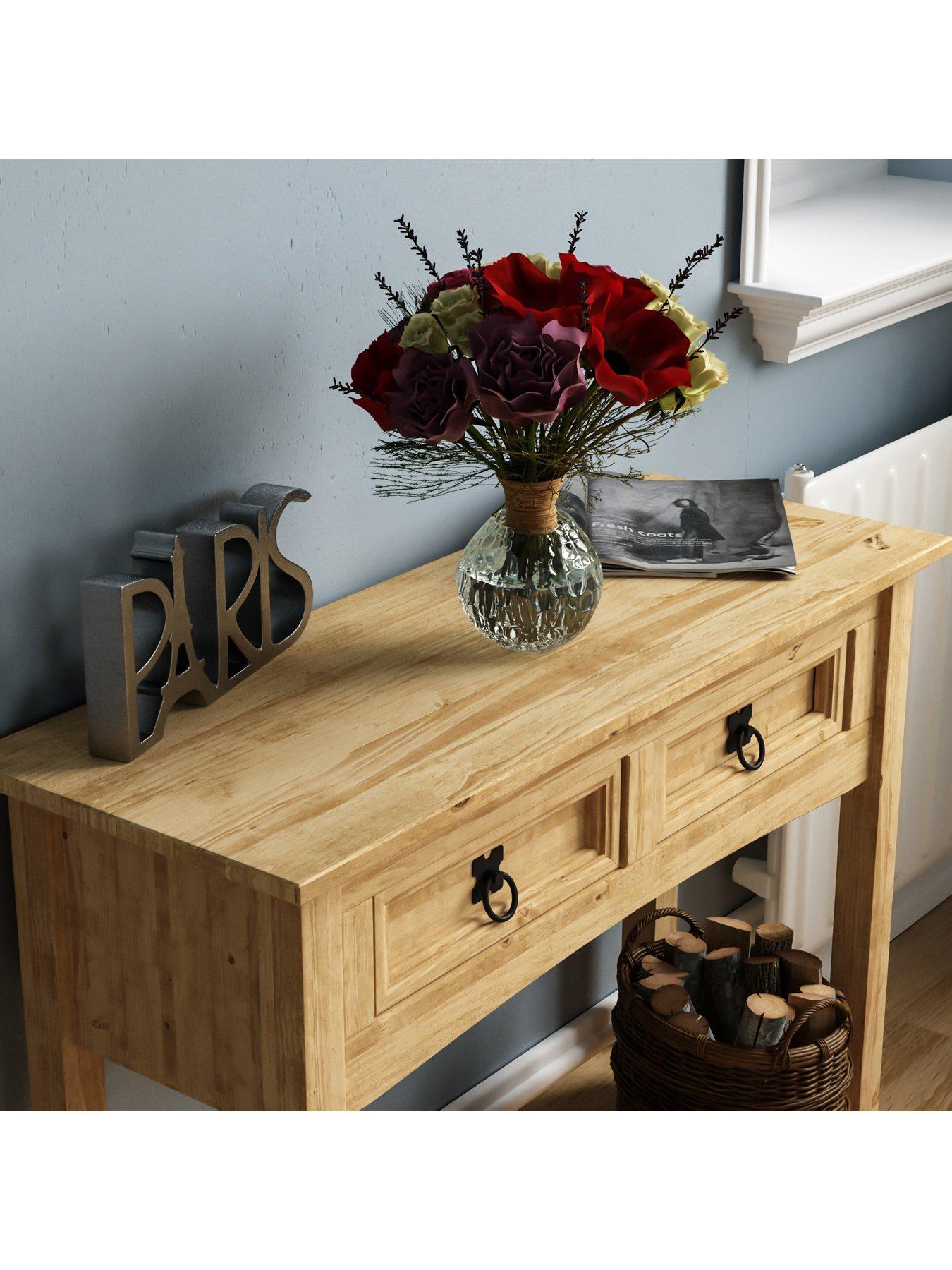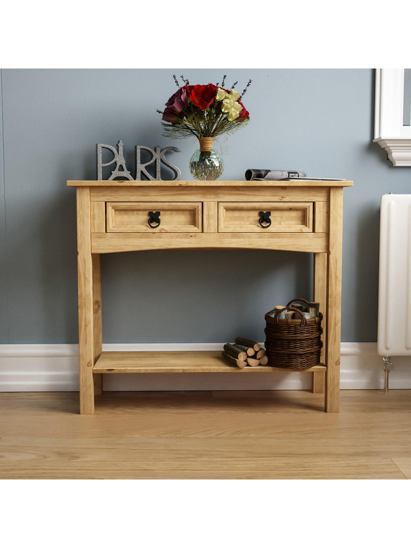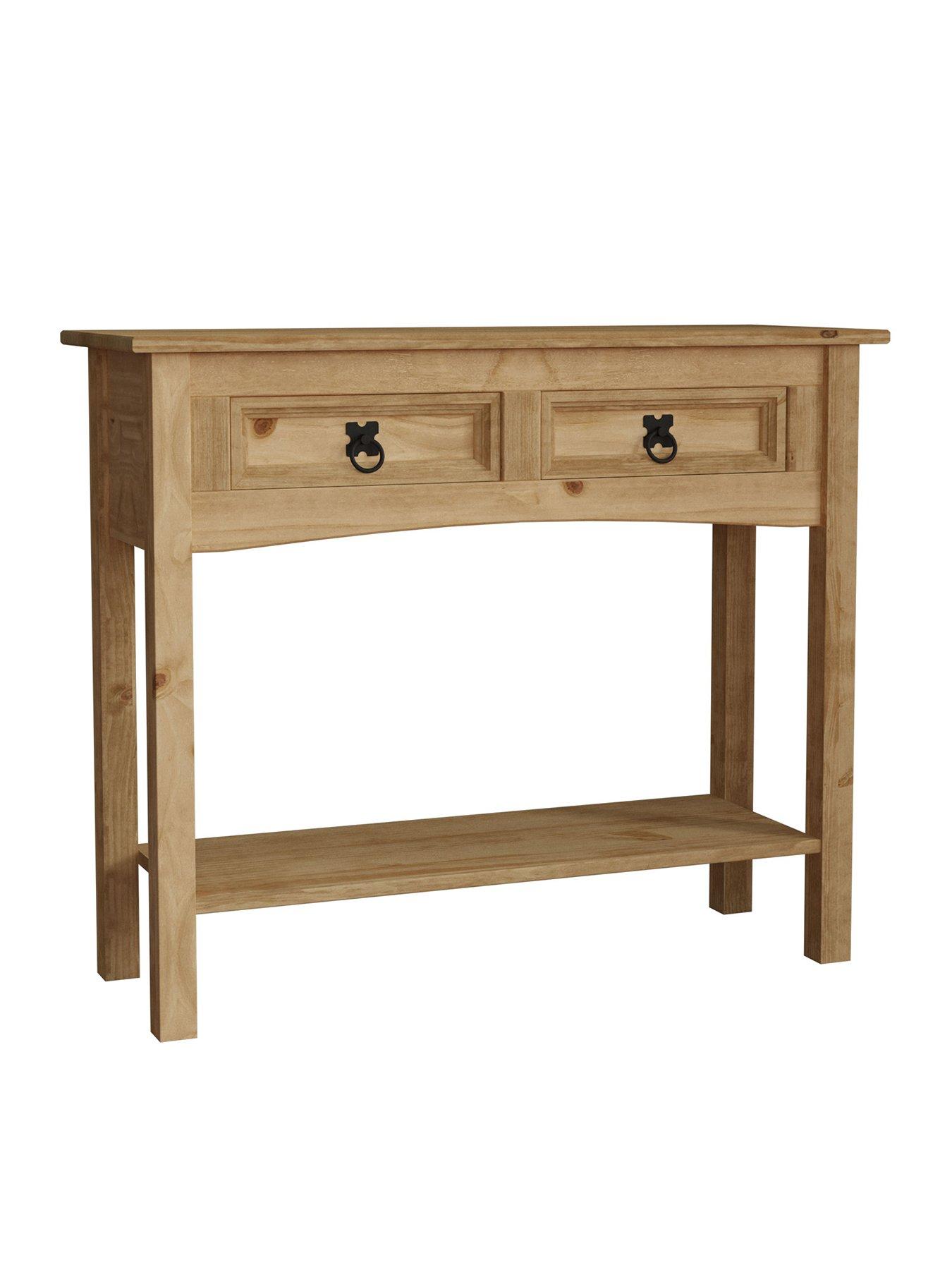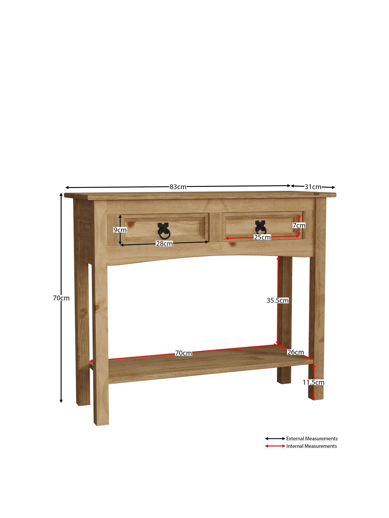 Vida Designs Corona 2 Drawer Console Table in Solid PineThis console table from Vida Designs' Corona collection is wonderfully crafted from a strong pine wood. This has been distressed for added authenticity, then waxed to both protect the wood and draw out its breathtaking pattern of grain and colour shades.Ideal for various rooms in the home, we absolutely love it in the hallway, as it gives you a place to store away clutter in its two drawers, as well as a handy space for display thanks to its 83 cm wide top. The fab framed drawers are detailed with black metal hardware for a final touch of tradition, while a low shelf can be used for even more display or for keeping some wicker storage baskets to give you added organisation. Please remember to measure your available space before ordering. Dimensions: Height 70, Width 83, Depth 31 cm