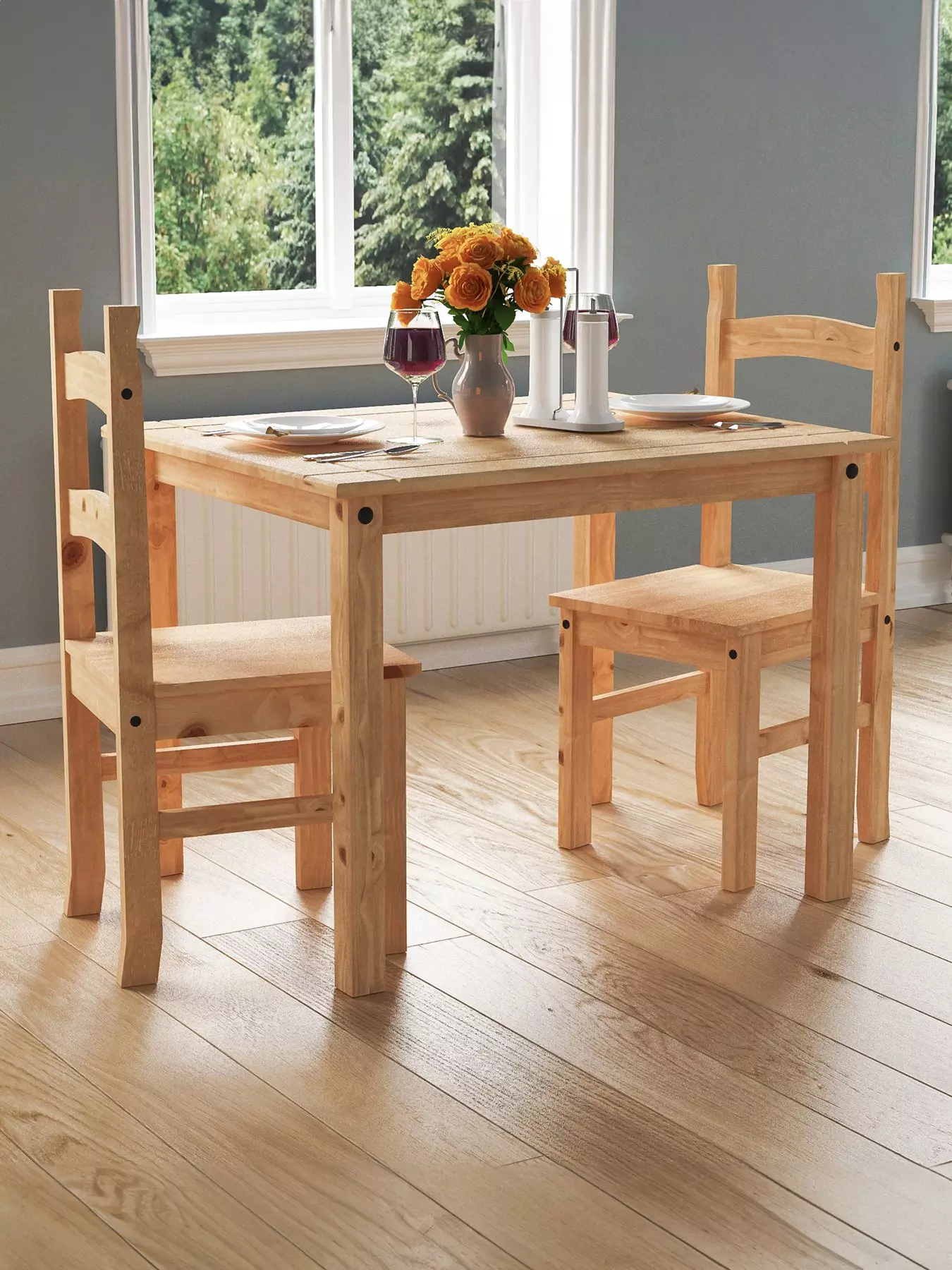 This stylish dining set is a perfect solution for smaller kitchens and dining rooms. This expertly crafted Mexican style dining set features a waxed wood finish and ornate black detailing to go with it. The table is square shaped and has crafted grooves that add to the tables traditional Mexican style. The table comes with 2 dining chairs with backrest. The whole set is made of strong and durable pine wood which is waxed. The item is very easy to clean with a dry or damp cloth. Please note that this item is flat packed and will require self-assembly, easy to follow instructions are provided.- Assembly: Self Assembly