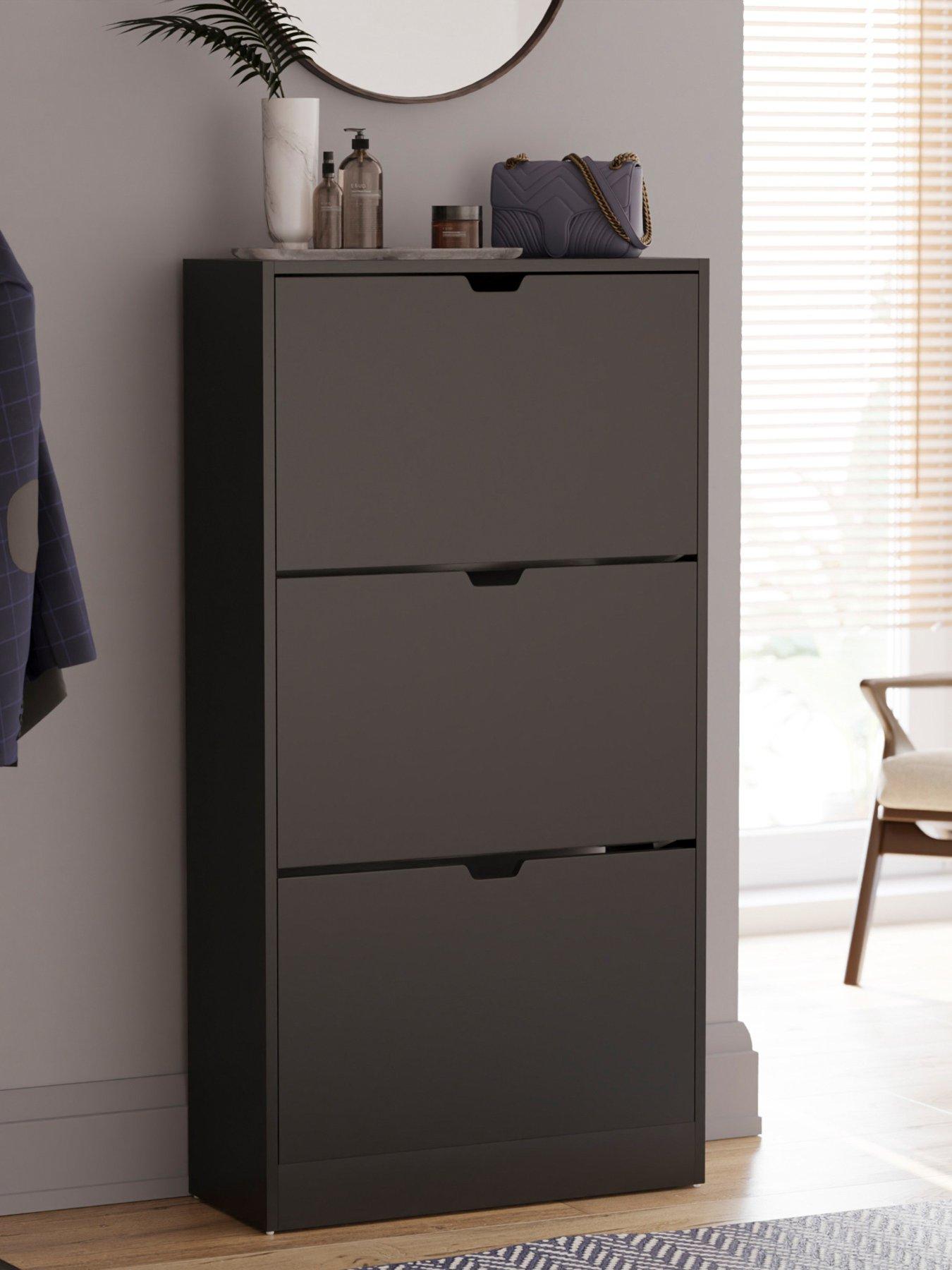 Finished in a contemporary black shade, its handle-free design offers a sleek, minimalist look and makes it easy to open and close the drop-down drawers smoothly. Each drawer holds 3 to 4 pairs of shoes (depending on size), offering ample storage for your footwear faves.