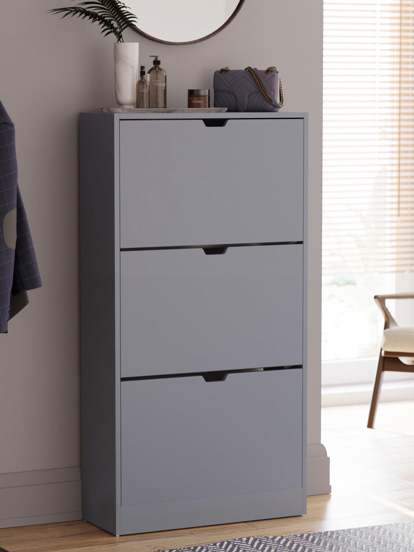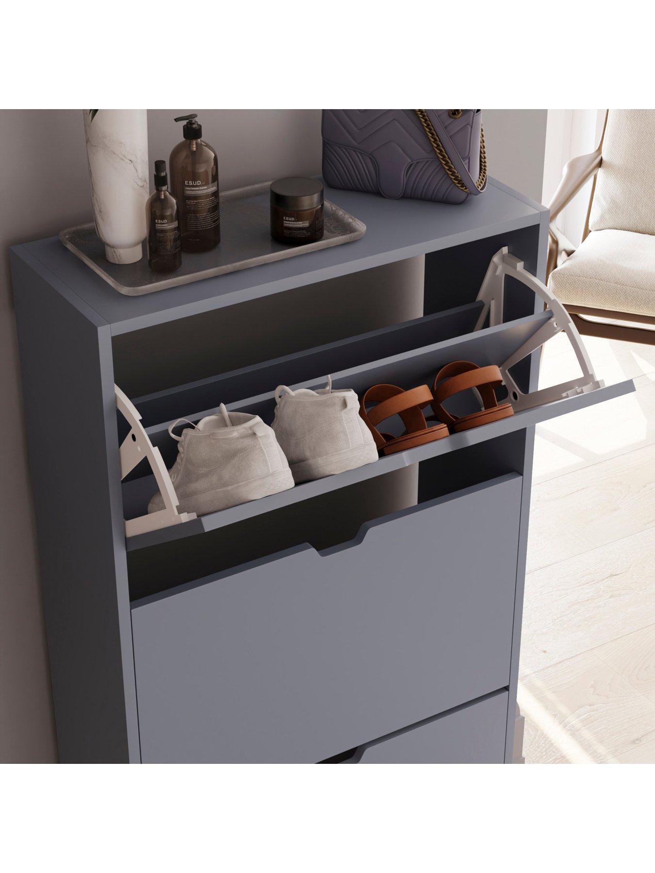 Finished in a contemporary grey shade, its handle-free design offers a sleek, minimalist look and makes it easy to open and close the drop-down drawers smoothly. Each drawer holds 3 to 4 pairs of shoes (depending on size), offering ample storage for your footwear faves.