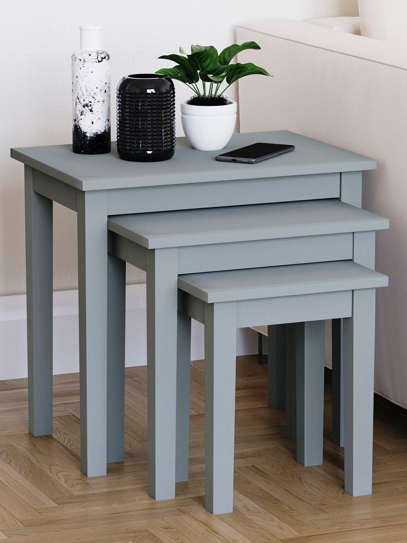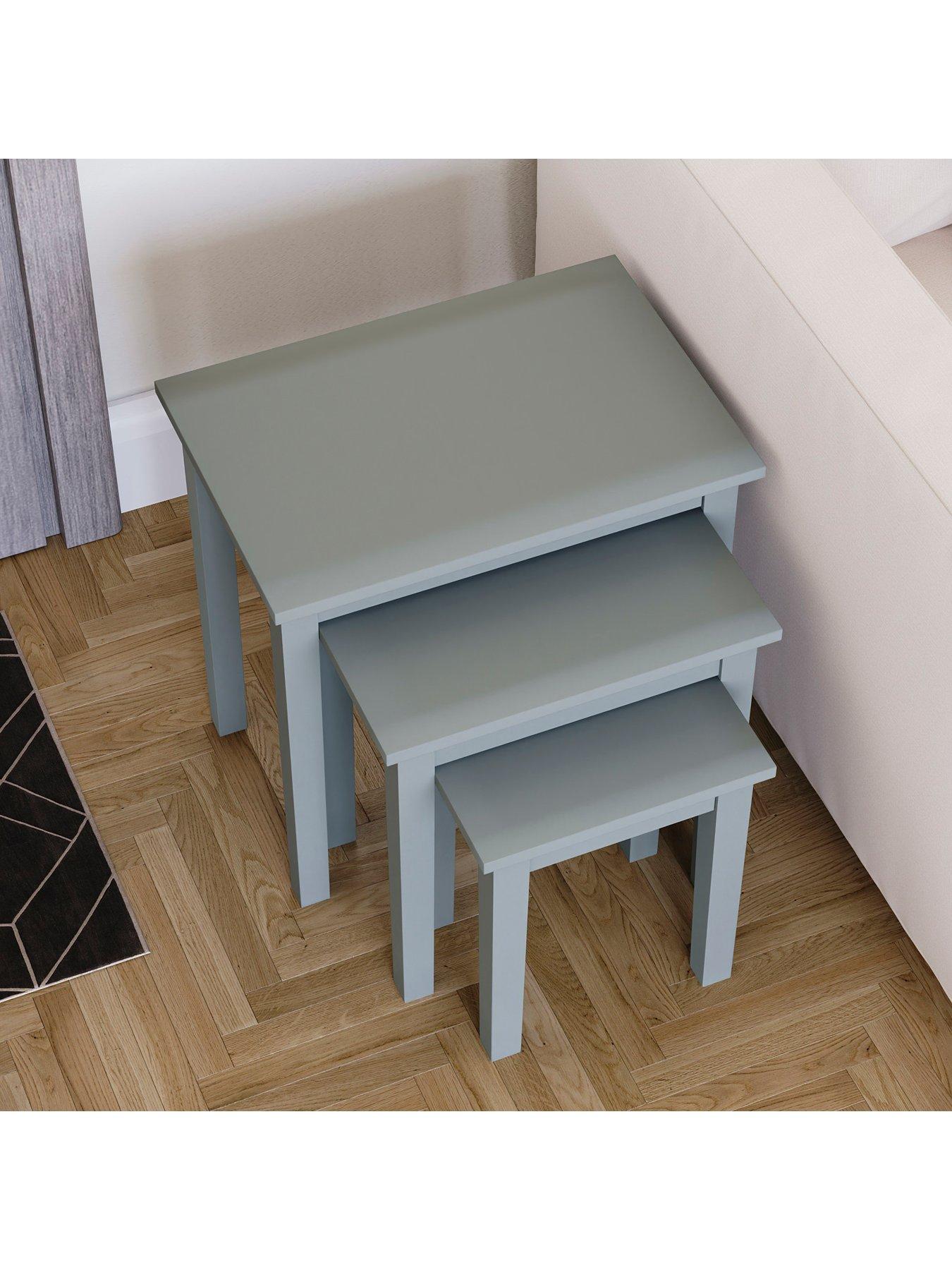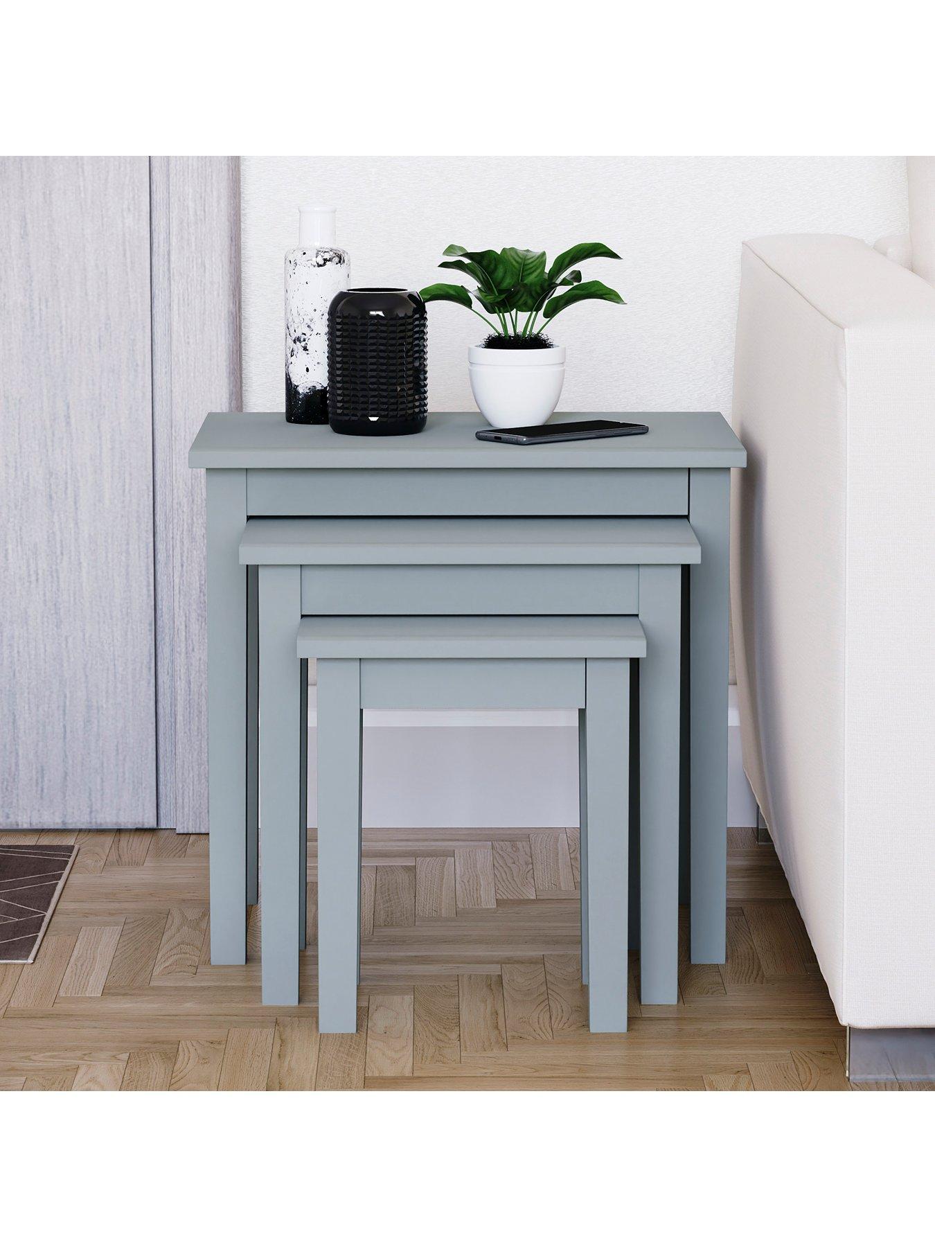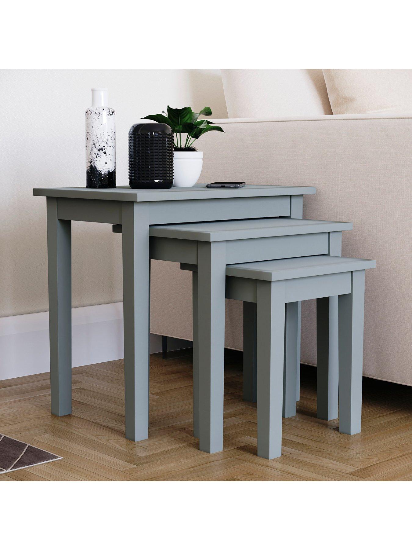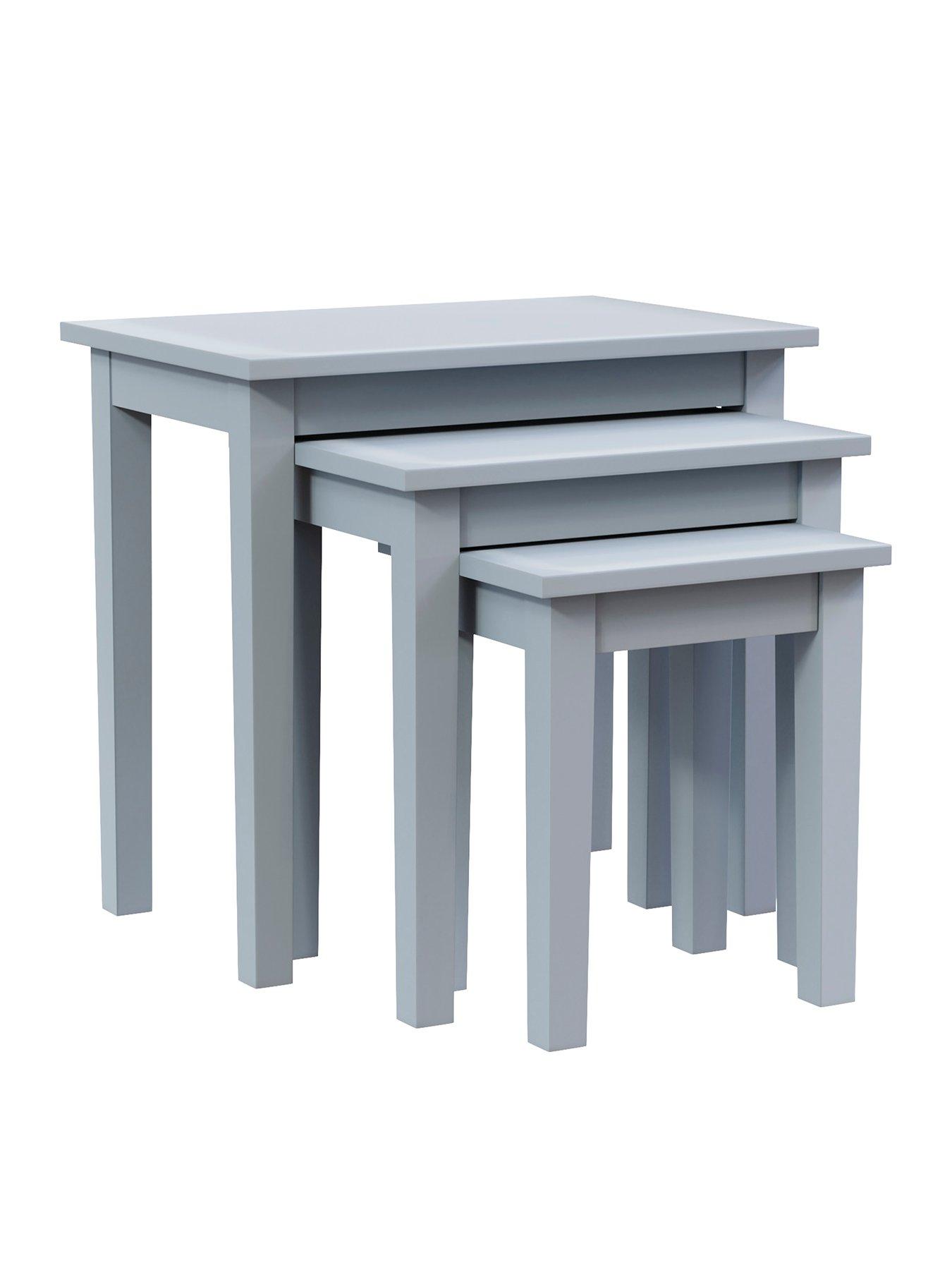 Vida Designs Yorkshire Nest of 3 Tables in GreyCrafted from high quality materials, this Yorkshire nest of tables from Vida Designs flaunts a traditional aesthetic that's been given a twist of modern style by the all-over grey finish.Clean, straight lines incorporate the legs and overhanging tops, while the largest table is the perfect place for a lamp, vase and other decorative essentials thanks to its generous 48 cm wide top. The smaller two tables slide neatly under so you can display the iconic nested style when not in use, then take them out when friends call round and need a place to sit their coffee cup or wine glass. This nest of tables is also available in alternative colour options (search 'Yorkshire' to see the full range). Please remember to measure your available space before ordering. Dimensions: Large Table: Height 46, Width 48, Depth 33 cm Medium Table: Height 39.5, Width 37, Depth 29 cm Small Table: Height 33.5, Width 27, Depth 25 cm Weight Limit: Small - 10kg / Medium - 20kg / Large - 30kg Material: MDF Finish: Painted Please note: This item requires self-assembly with easy-to-follow instructions provided. The actual colour of the product may vary slightly as your screen display setting and lighting with your home environment may differ from our own.