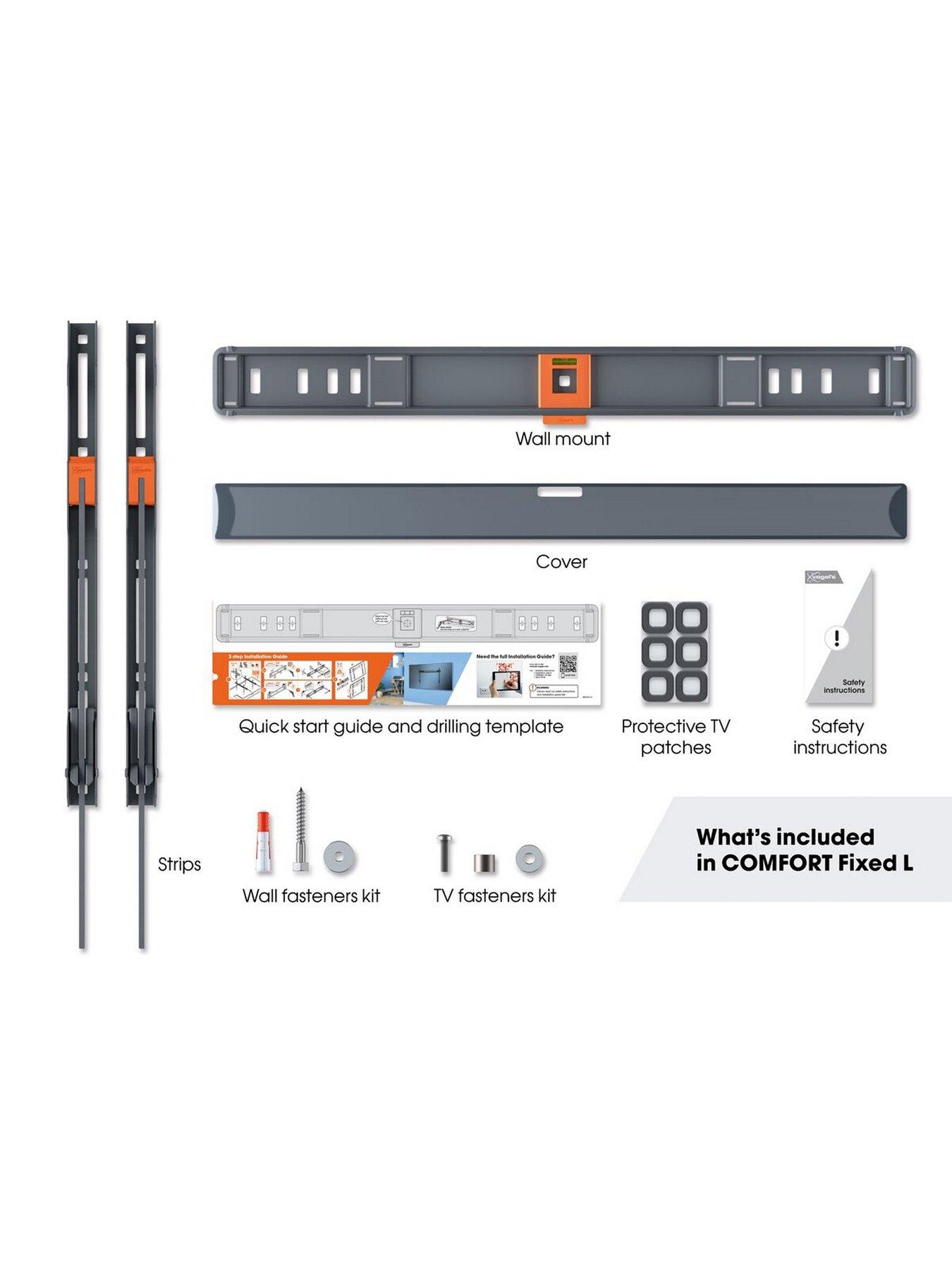 Vogels Flat display wall mount - 40-100"A busy family home is not always the safest place for a TV. Fortunately, your TV will be mounted beautifully and securely with this Vogel's COMFORT Fixed wall mount. The perfect solution if you sit directly in front of your TV. Turning or tilting is not possible. The wall mount is specially designed for TVs from 40 to 100 inches and weighing up to 75 kg.The Vogel's COMFORT Fixed TV wall mount is TUV certified and tested to three times its maximum weight capacity. This wall mount also features Vogel's unique ClickLoc security system. The click tells you that your TV is safely locked in place. Special patches protect the back of your TV during installation. Extra convenient: a drilling template, screws and Fischer DuoPower plugs are included in the packaging. A spirit level is built into the wall mount. Is your TV mounted, but you need access to the cables? Thankfully, you don't have to remove everything from the wall. The wall mount has a special maintenance position, making it easy to access the rear. Warranty: 10 years.