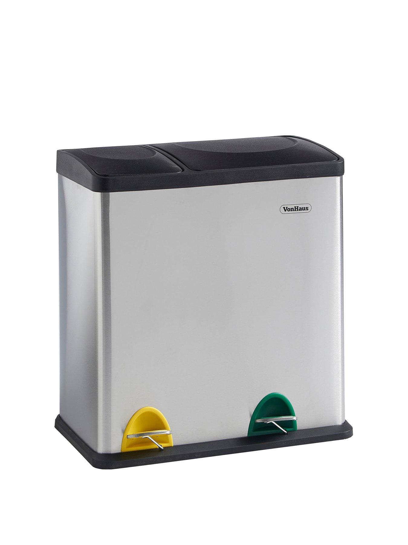 Vonhaus Double Compartment Pedal Recycling Bin - 36lVonHaus 36L Double Recycling Bin | 12L & 24L Compartments.Streamline your recycling today. While we all try to keep on top of recycling, sometimes we just don't have the time to sit and divide our waste into endless piles. Sort your waste the easy way and separate as you go with the VonHaus dual recycling bin. Colour-coded pedals ensure simple use that the whole family can keep track of. Dual Kitchen Bin with Colour Coded Pedals | 2-in-1 Recycling Bins for Kitchen. Streamline your recycling today. Both hygienic and convenient, this stainless steel twin recycling bin offers hands-free operation, so you can easily maintain a clean and tidy kitchen as you cook. The 12L and 24L compartments provide ample room for plastic bottles, metal cans, and general waste - whilst remaining compact. Once full, use the integrated handles to empty the removeable inner bins with ease. Designed to keep your waste in and pests out, the odour-resistant tight-seal lids take the ârubbish' out of ârubbish bin'! Waste separation, made simple and hygienic. Hands-Free Operation. Create an orderly recycling system and separate your waste from the get-go with the coloured pedals. Complete with collapsible metal handles. Removeable Inner Bins. Easily empty out your dual rubbish bin, or use the inner bins outside for BBQs and garden parties. Ensuring sturdy foot pedal operation. Non-Slip Base. Even in manic family kitchens, rest assured that the double kitchen bin will stay securely in place. Large capacity for your waste and recycling needs. 12L & 24L Compartments. Finished with metal carry handles, make taking out the trash less of a faff, and less frequent.