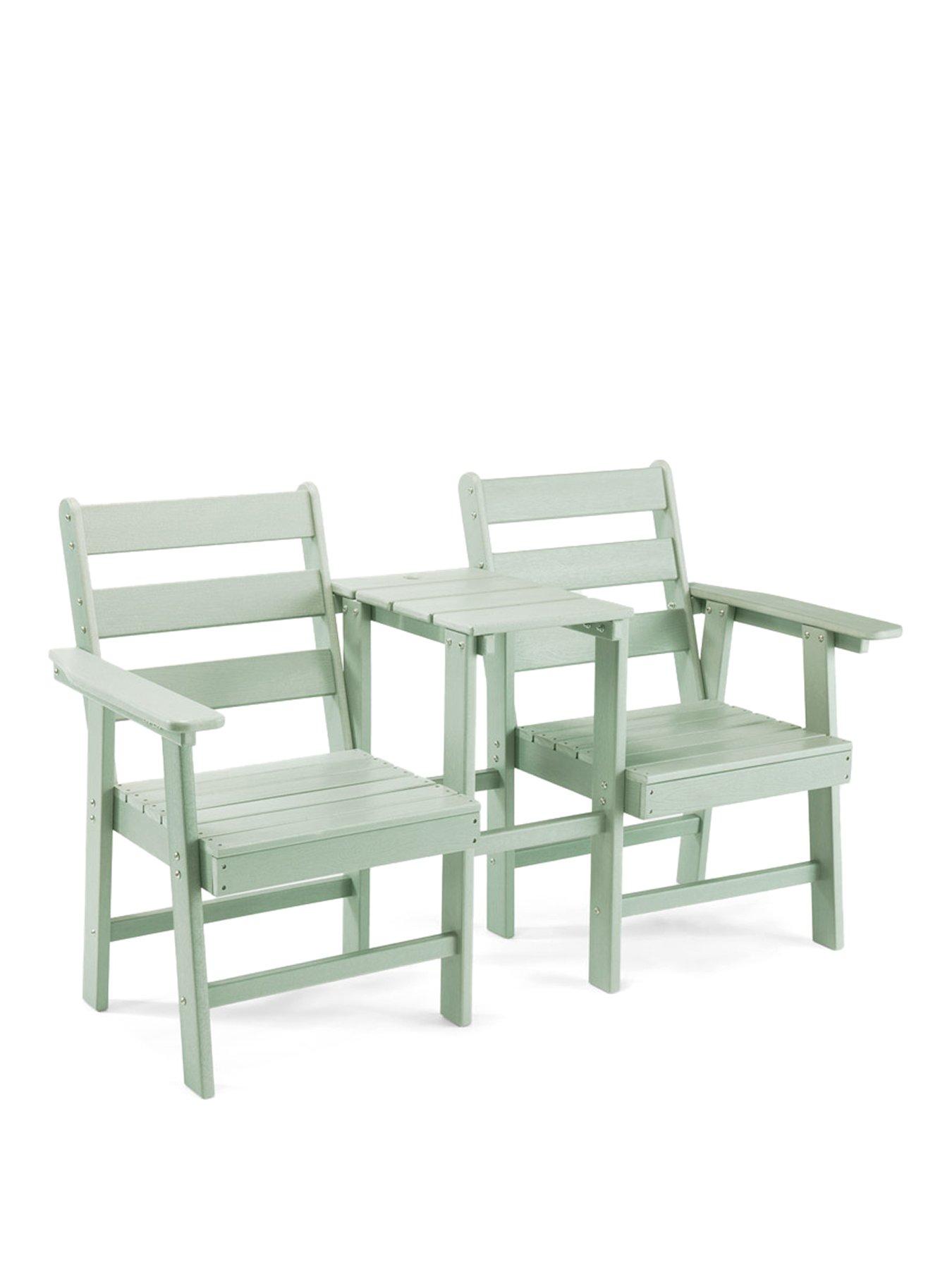 Vonhaus Westport Jack & Jill Seat- GreenVonHaus Adirondack Jack & Jill Seat, welcome classic charm into your garden Experience comfortable relaxation with the VonHaus Jack & Jill Adirondack seat, bringing contemporary charm to any garden. Complete with a small table, parasol hole, and wide armrests, our chair offers you and a loved one an inviting spot perfect for escaping the hustle-and-bustle of daily life. This companion set is the ultimate union of traditional style and modern durability thanks to the waterproof HDPE construction, providing resistance to fading, cracking, and splintering. Not only will its stylish sage green finish remain in top condition, but so will its strength; the generous 220kg capacity gives you complete peace of mind. Inspired by the rusticity of the Adirondack mountains, our Westport garden range offers an array of Adirondack chairs, slatted companion sets, and more.