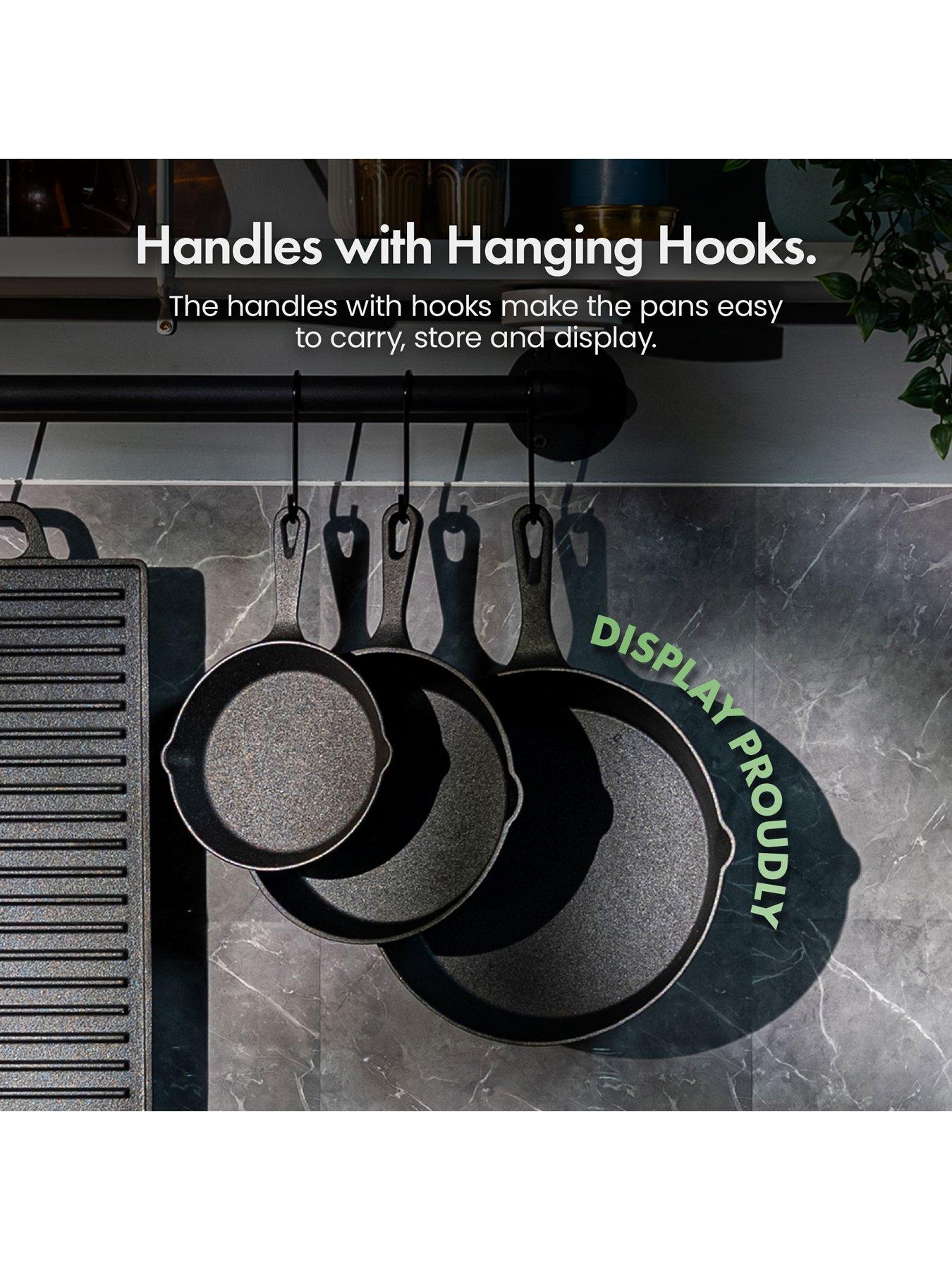 Vonshef Cast Iron Cookware Set - 3 PansCast Iron Skillet Cookware Set - 3 pans includedMade from pre-seasoned cast iron, this set of three VonShef cast iron skillet pans provides high quality durable cast iron cookware at the best price. This best-selling cast iron cookware set includes three pans for cooking various sized dishes: 6" - Small cast iron skillet pan 8" - Medium cast iron skillet pan 10" - Large cast iron skillet pan A HEALTHIER ALTERNATIVE TO NON-STICK PANS The cast iron seasoning process involves baking vegetable oil onto the surface at a high temperature, creating a naturally non-stick surface, without the need for any chemical coating. With pouring lips for mess-free fat drainage and serving, your VonShef set of 3 cast iron skillets will be your new go-to for whipping up guilt-free family feasts or smaller snacks. Ideal for cooking bacon, steaks and other meat, poultry and fish as well as vegetables. PRE-SEASONED & NON-STICK CAST IRON COOKWARE Your cast iron skillets have a naturally non-stick, chemical-free surface for easy cooking and cleaning, thanks to the process of pre-baking vegetable oil into the pans. SUITABLE FOR ALL HOBS At 6', 8', and 10', your long lasting cast iron pan set can be used on all hob types (induction, electric, gas, ceramic) as well as in the oven, making it compatible with whatever cooking method suits you. HANGING LOOP When not in use, simply use the durable hanging loops to store your black cast iron frying pans efficiently without clogging up your kitchen surface or taking up valuable cupboard space. THE VONSHEF PROMISE All our products are backed by a minimum 2 year warranty, so you can be safe in the knowledge that if anything happens we're here for you. Use our products with confidence.