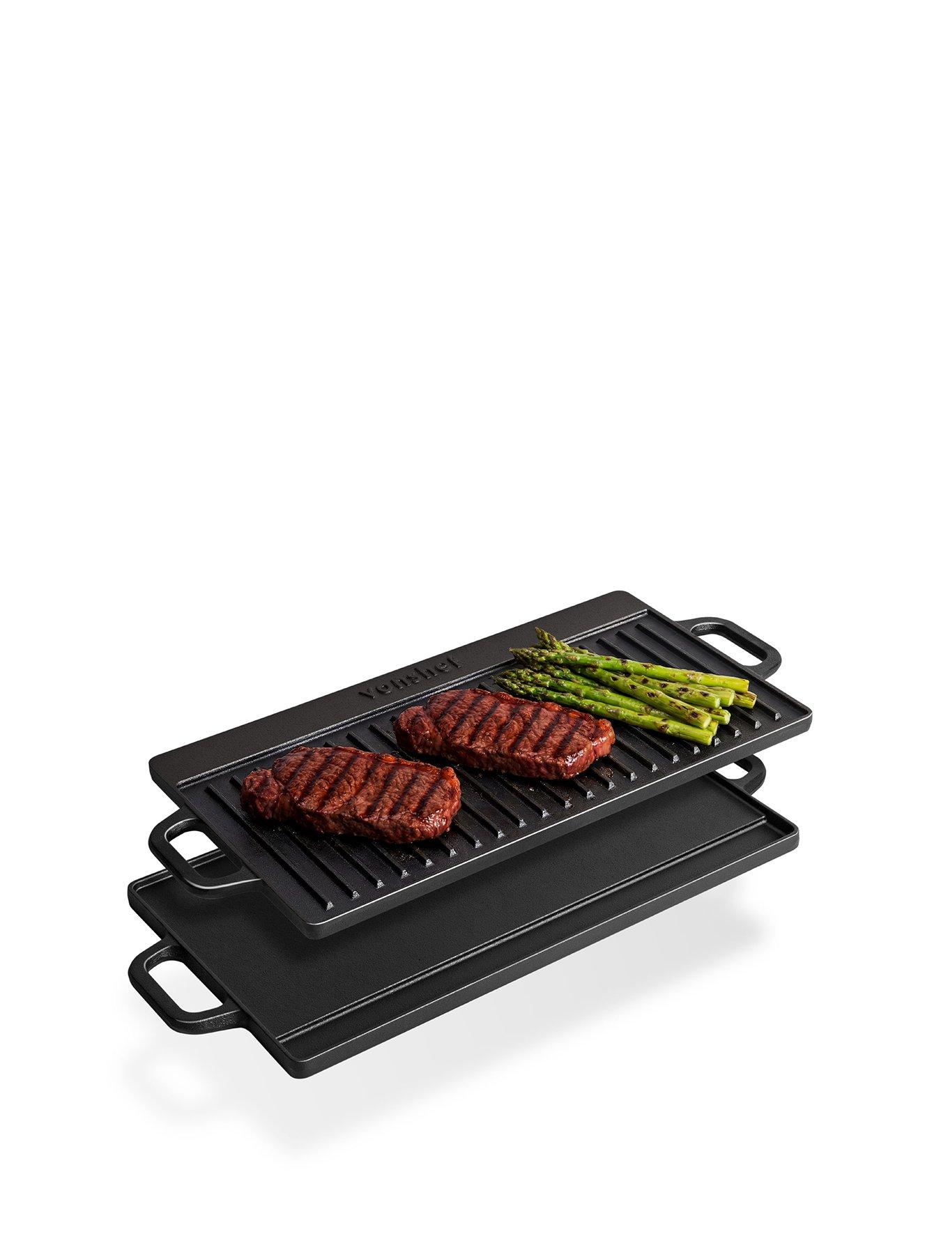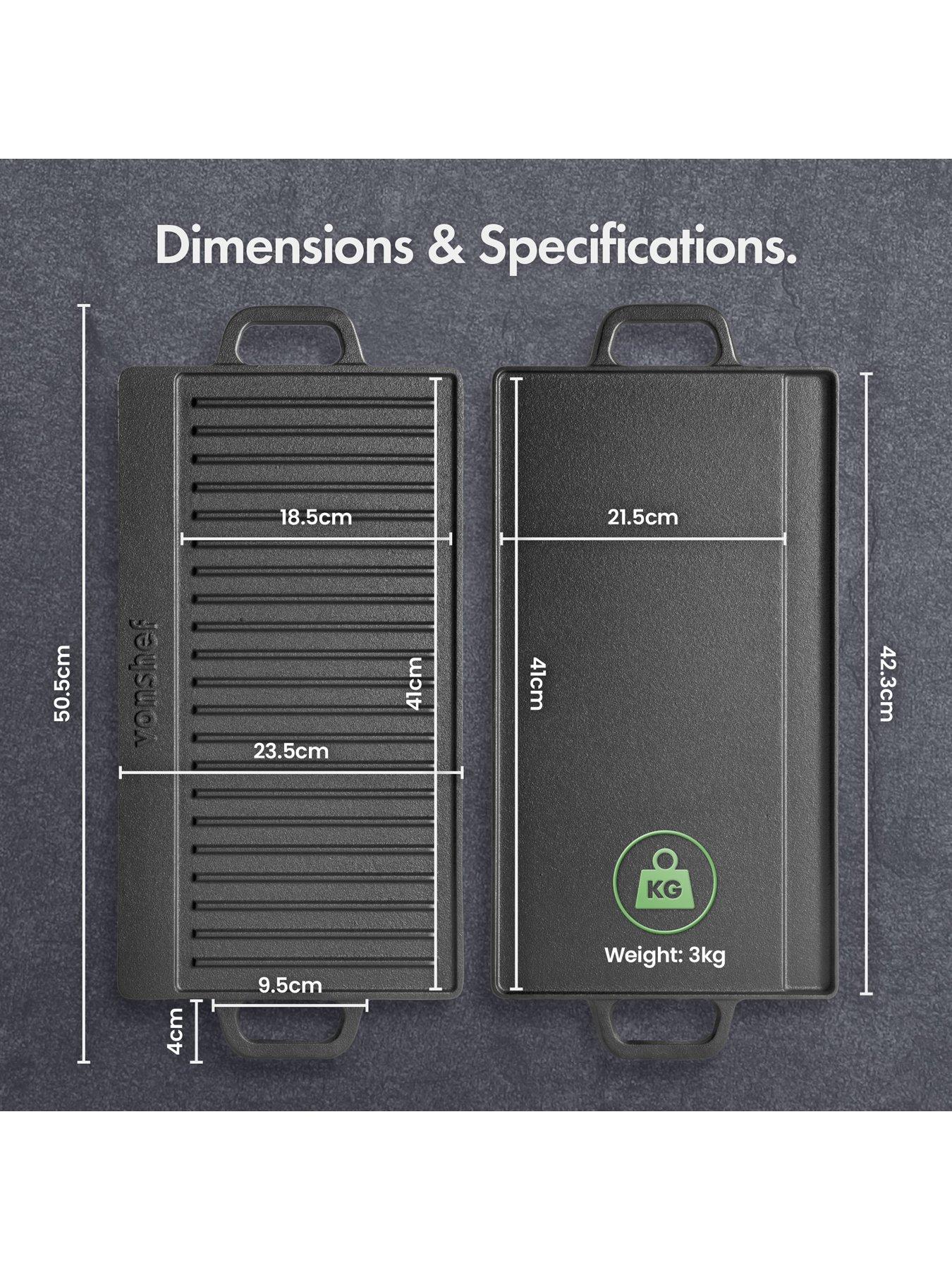 Vonshef Cast Iron Griddle - 50cm Double SidedCast Iron Griddle - 50cm Large griddleA versatile, multi-functional and a fun way to cook, the griddle is perfect for BBQs, camping, entertaining at parties and celebrations as well as day to day cooking on the hob. The VonShef Cast Iron Griddle opens up a new world of culinary possibilities, with its large non-stick cooking surface and double-sided design. At (L)50.5cm x (W)23.5cm, your heat retaining griddle plate can be used on all hob types (induction, electric, gas, ceramic) and in the oven. Or why not upgrade your outdoor cooking with a BBQ griddle plate? Reversible Plate Use the ridged side to cook the likes of meats, fish and grilled sandwiches to perfection - complete with an authentic seared effect. Flip over and use the flat side to rustle up scrumptious eggs, pancakes, fajitas, vegetables and much more! Constructed from ultra-strong cast iron with a black matte finish, the griddle boasts fantastic heat distribution and retention properties to ensure an even cook. Cast iron is also renowned for its ability to lock flavour and moisture into food, making this griddle even more of an attractive choice. Healthier Cooking It is ideal if you're looking for a healthier way to cook too, draining juices away to allow for tasty, low-fat cooking. Not only does the griddle offer a unique way to cook, it can also be used as a server, thanks to the heat retention properties of iron and integrated side handles. The handles can also be used to hang the griddle for convenient storage.