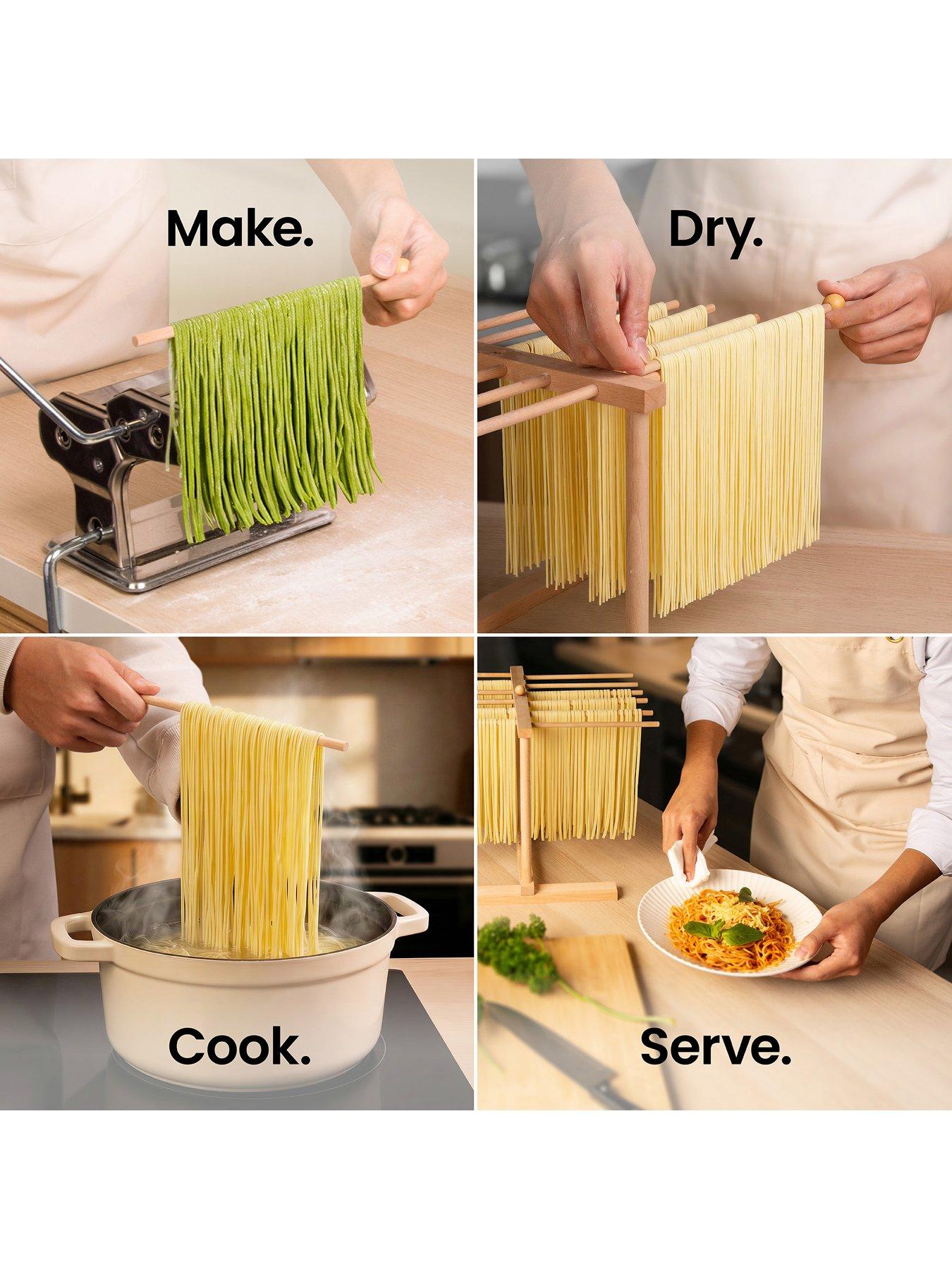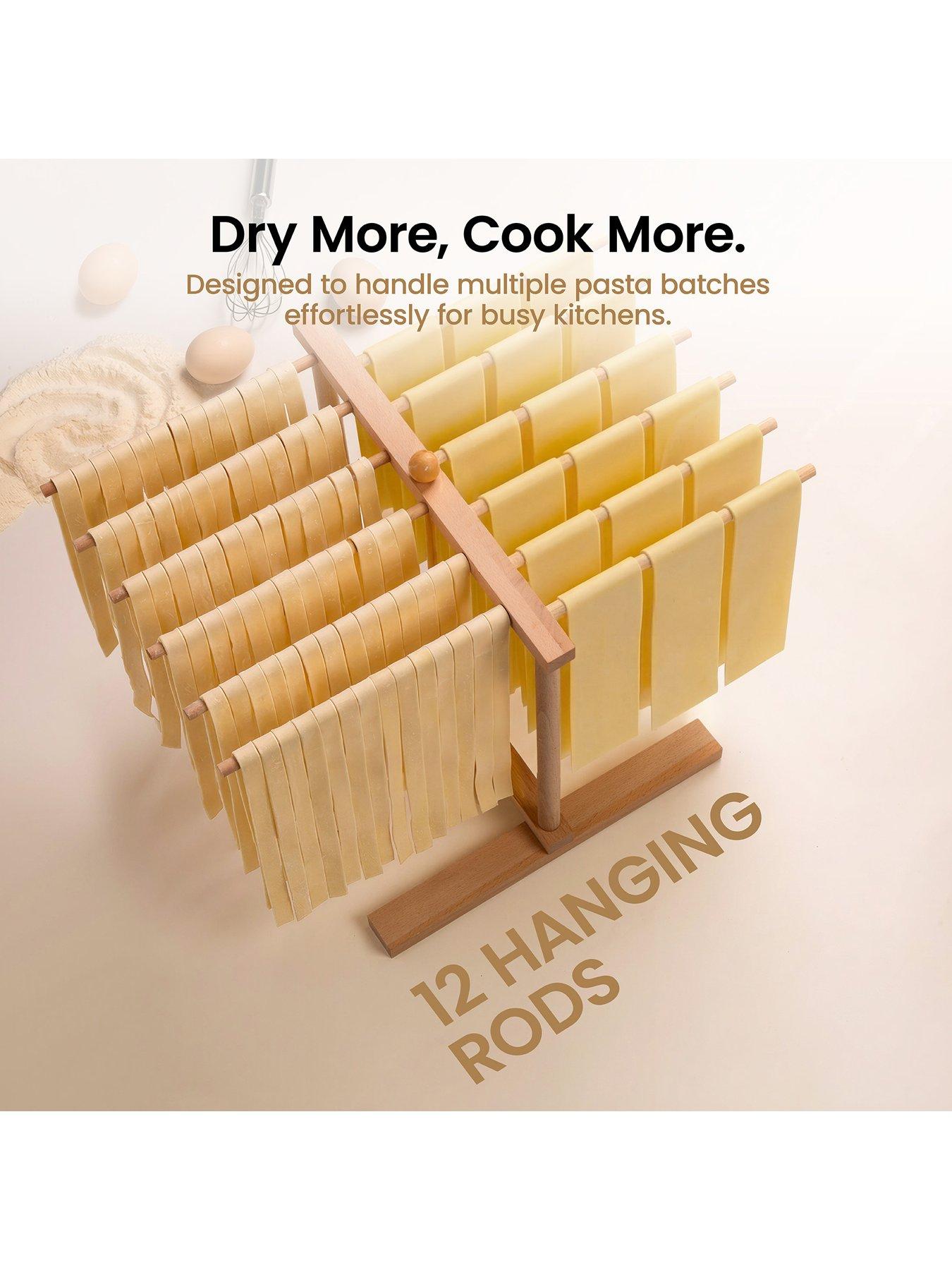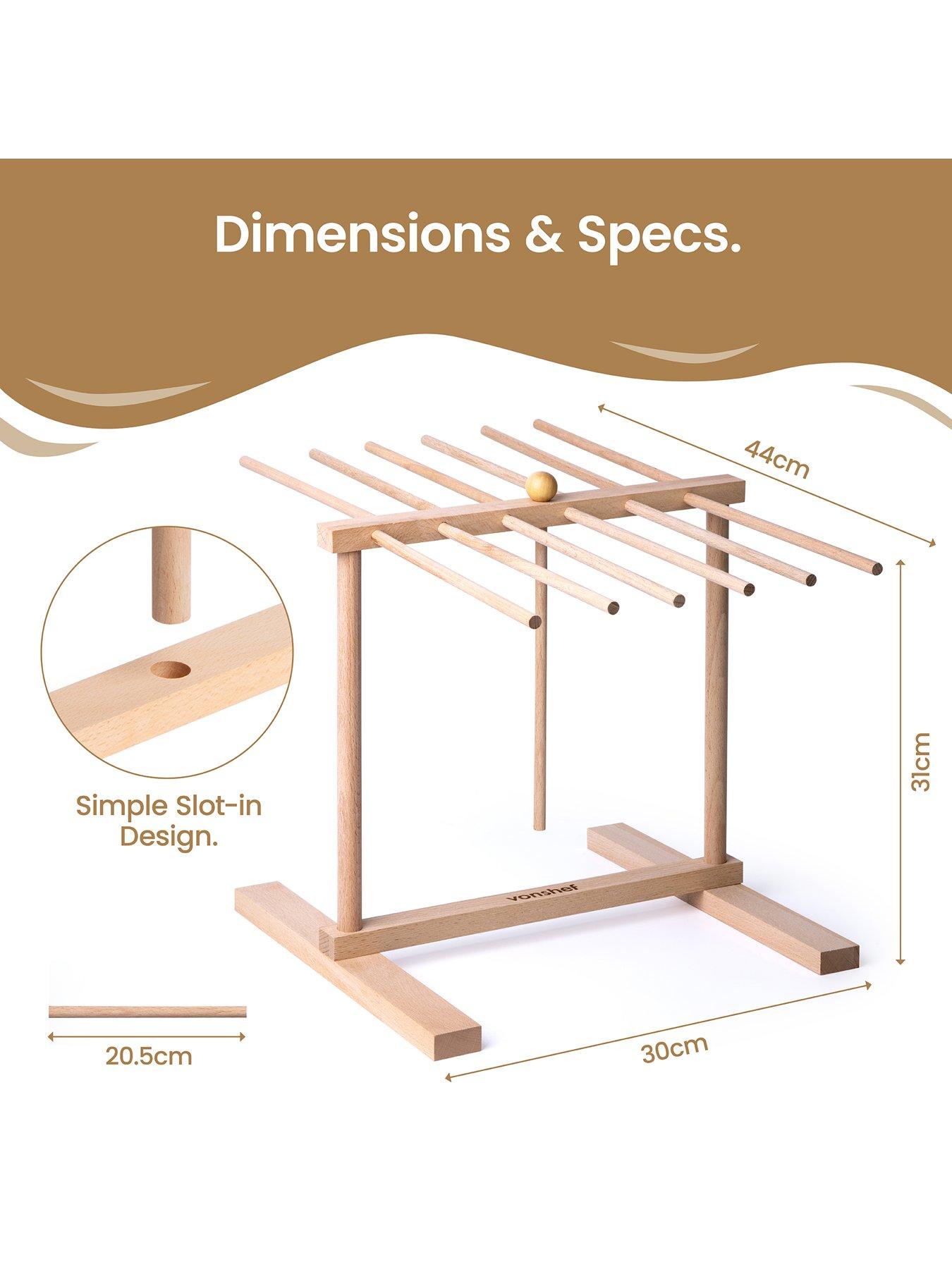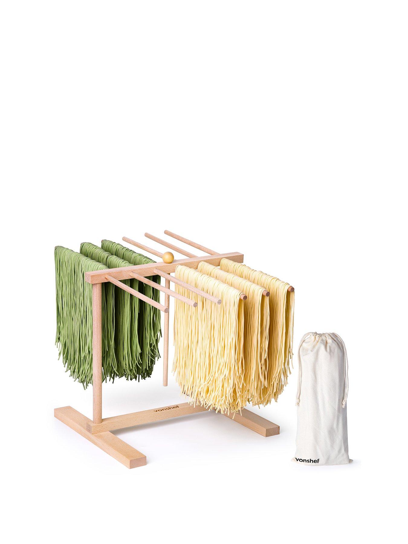 Vonshef Double-sided Pasta Drying RackBring the joy of fresh pasta into your kitchen with the Vonshef pasta drying rack. Perfect for any pasta shape from spaghetti and tagliatelle to lasagne sheets, this rack turns ordinary homemade pasta-making into a fun, stress-free experience every time.Looking for pasta gifts for pasta lovers? This rack features a double-sided design, with 12 sturdy rods providing over two metres of drying space, ideal for family meals, dinner parties, or meal prep. Made from solid beechwood, it's stable, stylish, and built to last, adding an elegant touch to your kitchen counter. The transfer wand makes lifting and hanging pasta effortless, while the collapsible design folds down in an instant. When not in use, store it neatly in the breathable hessian bag.