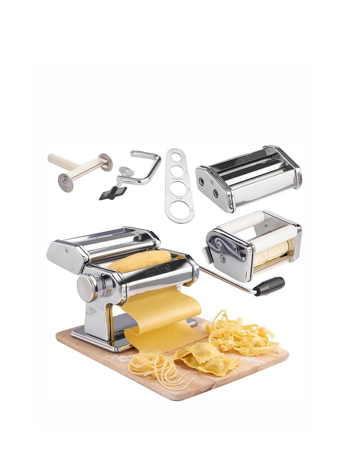Vonshef Manual Pasta Maker MachineEnjoy fresh pasta whenever you'd like with the VonShef Pasta Maker.Fresh ingredients can be easily transformed into an endless variety of homemade pasta dishes. Use one of the 4 Pasta Cutting Rollers to make fresh Spaghetti, Linguine, Tagliatelle or Fettuccine, or impress dinner guests with homemade Lasagne and Ravioli using the Roller attachment. The VonShef Fresh Pasta Maker also comes with a tabletop clamp fitting to hold the machine firmly in place when in use. The pasta maker can be adjusted to produce pasta at varying thickness for whatever your culinary needs - also can be used to roll out sugar fondant for use in cake decoration! Sturdy and stylish, the VonShef pasta maker is an attractive addition to any kitchen and great talking point with guests!