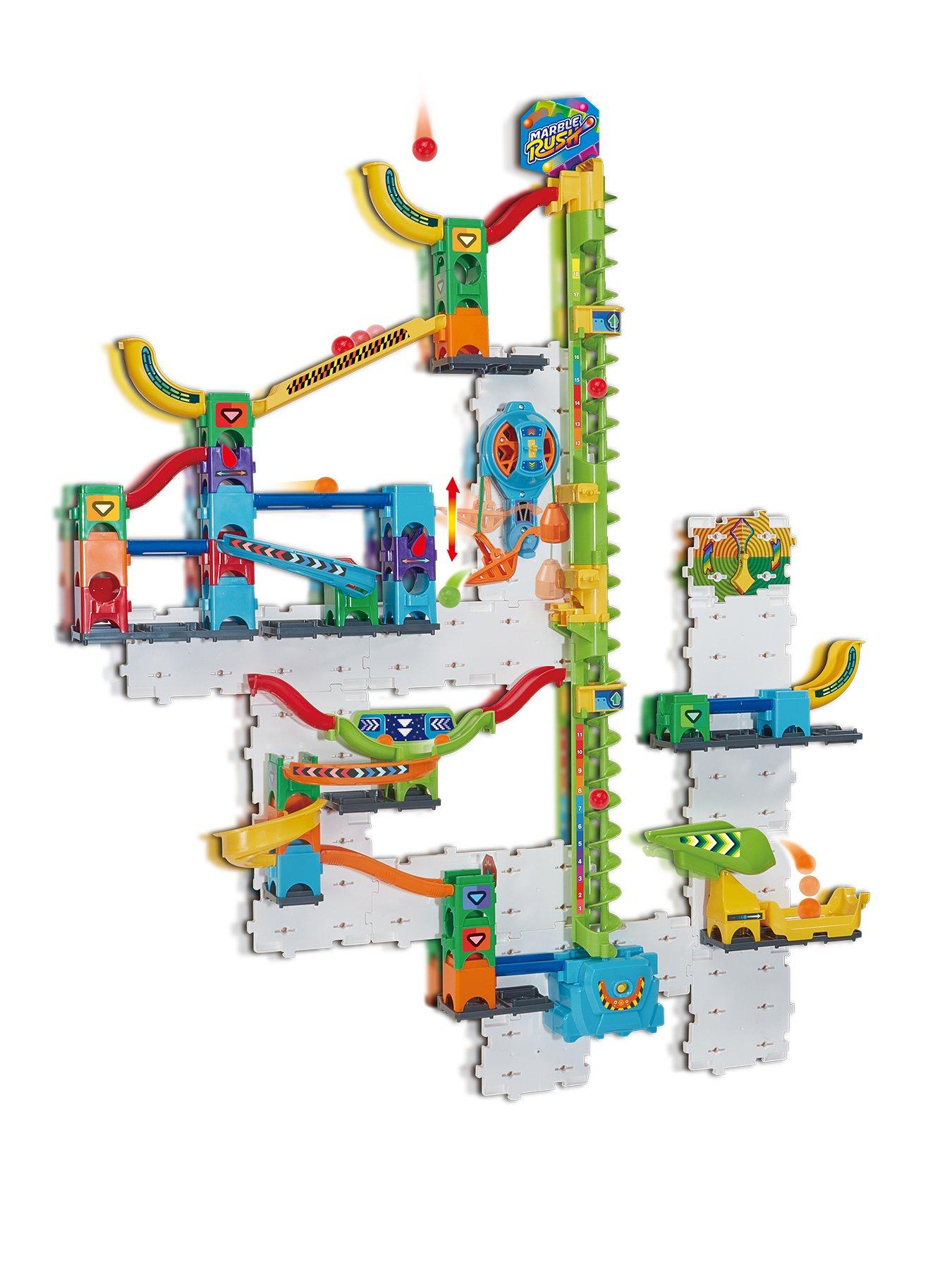 Watch in amazement as marbles free fall down this vertical surface mountable Marble Rush play set by VTech! The Free Fall Vertical Set features 93 pieces and 10 marbles! Attach the platform pieces to vertical surfaces using the 80 included reusable double-sided sticky pads. The motorised spiral lift elevates marbles to the top of the set for a continuous marble free fall! Features an Up & Down Pulley, Slowdown Slide, Fill & Tip Bucket and Merge Slide track pieces to add to the fun! Compatible with other Marble Rush play sets. Colour-coded levelled build guide makes assembly easy! Discover more at marblerush.com. Suitable for ages 6+ years.