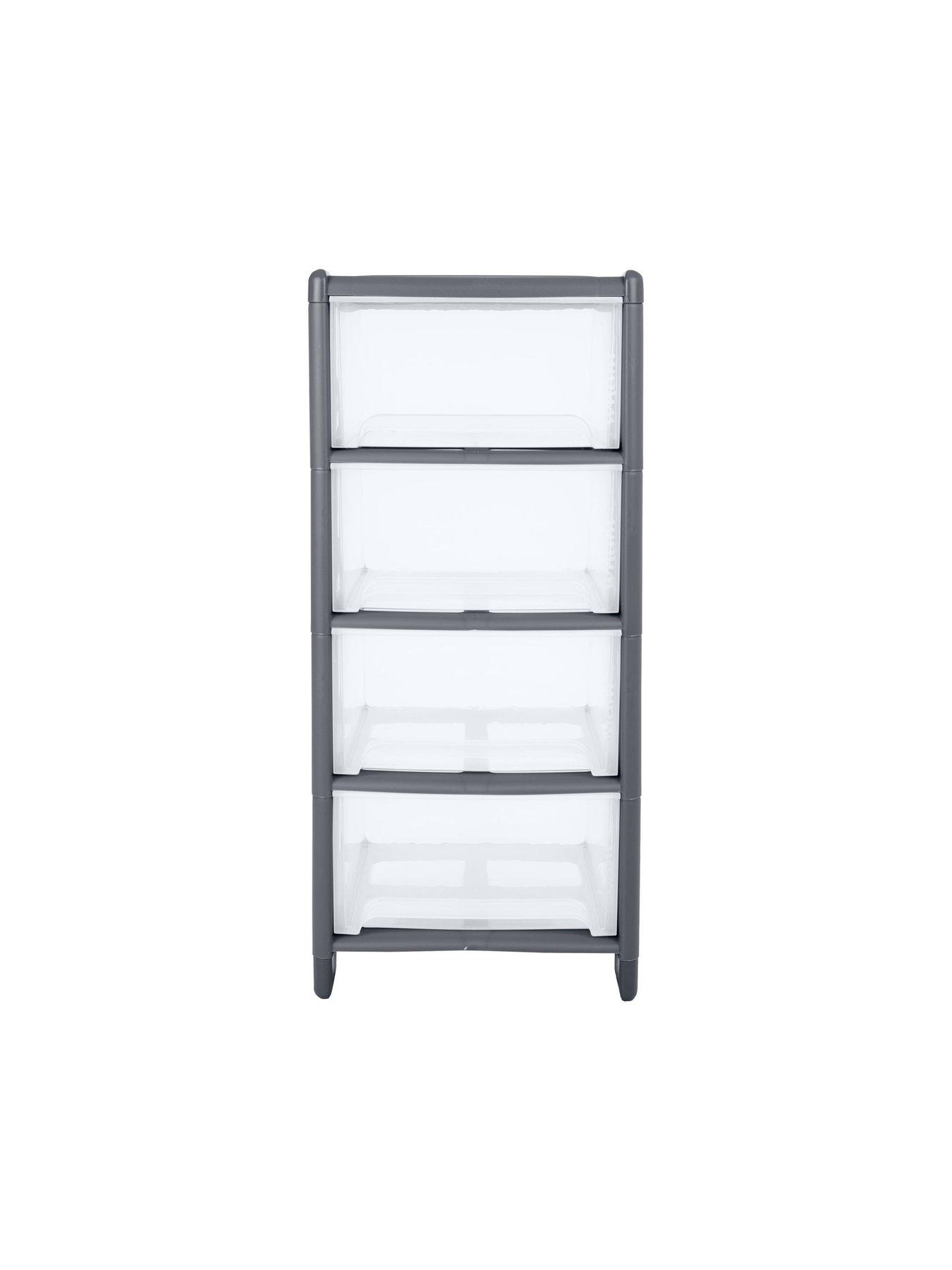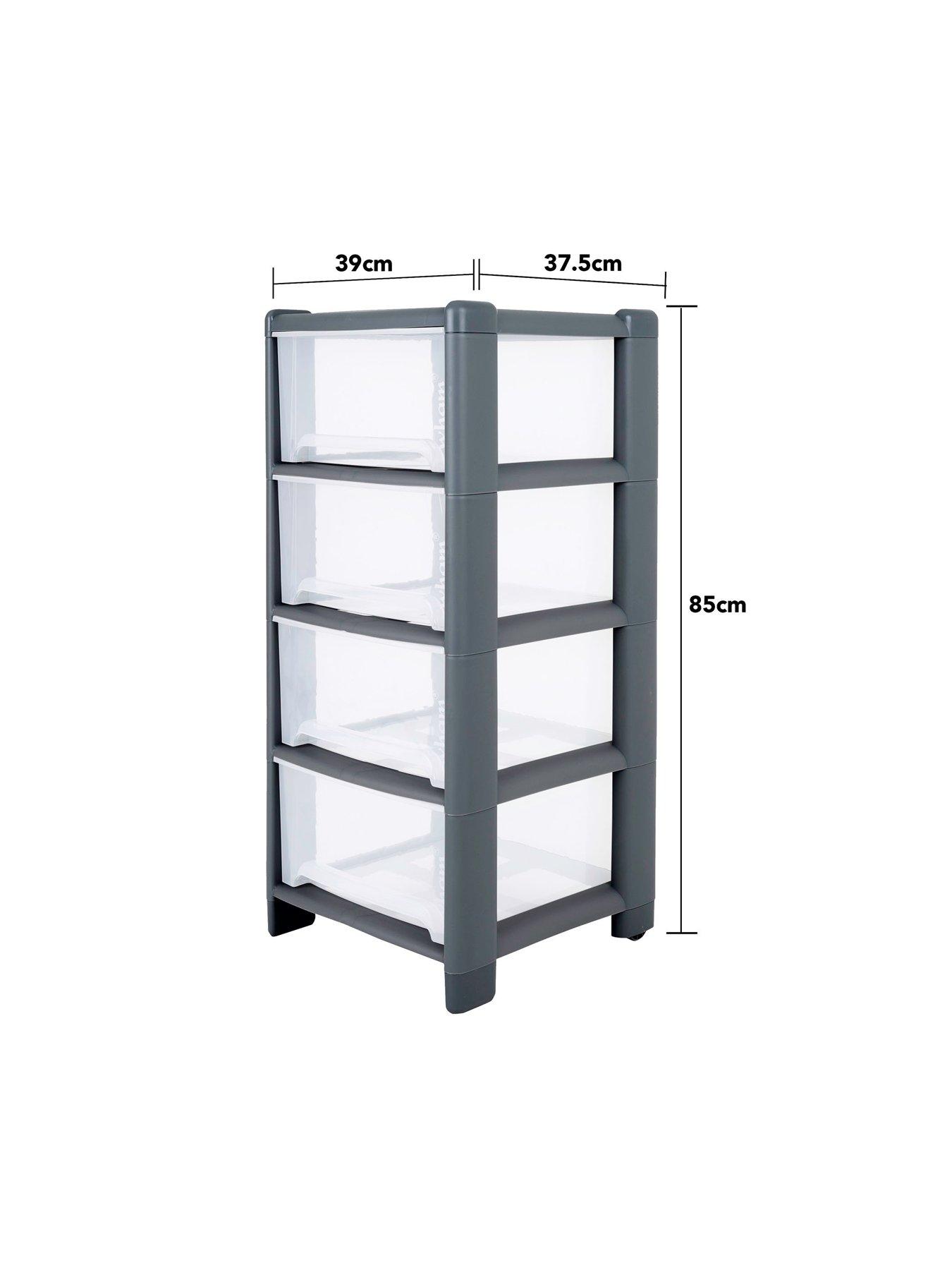 Wham Deep 4-Drawer Storage Unit in Graphite – 39 x 39 x 79.5 cmWhether keeping important documents filed away or simply keeping all your clutter in one spot, this 4-drawer storage unit by Wham is an affordable storage solution that’s ideal for use all around the home.Made from durable, hard-wearing plastic, 4 drawers sit within the graphite frame, each with a capacity of 20 litres. Large enough to lie A4 sheets of paper flat, the drawers are all transparent so you can see exactly what’s inside each one. This unit comes complete with feet to keep it in one spot, however rear wheels are also included to provide a little more flexibility on where it’s kept while also ensuring maximum stability.