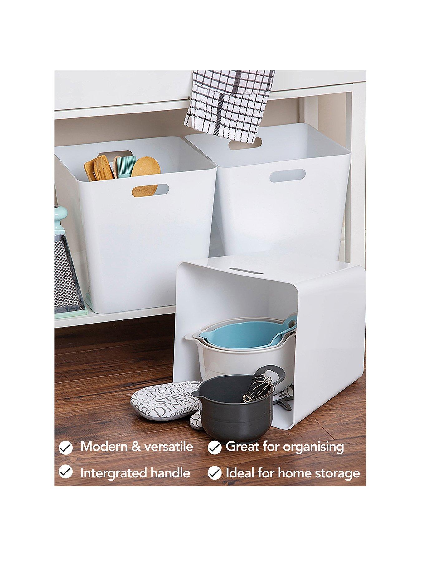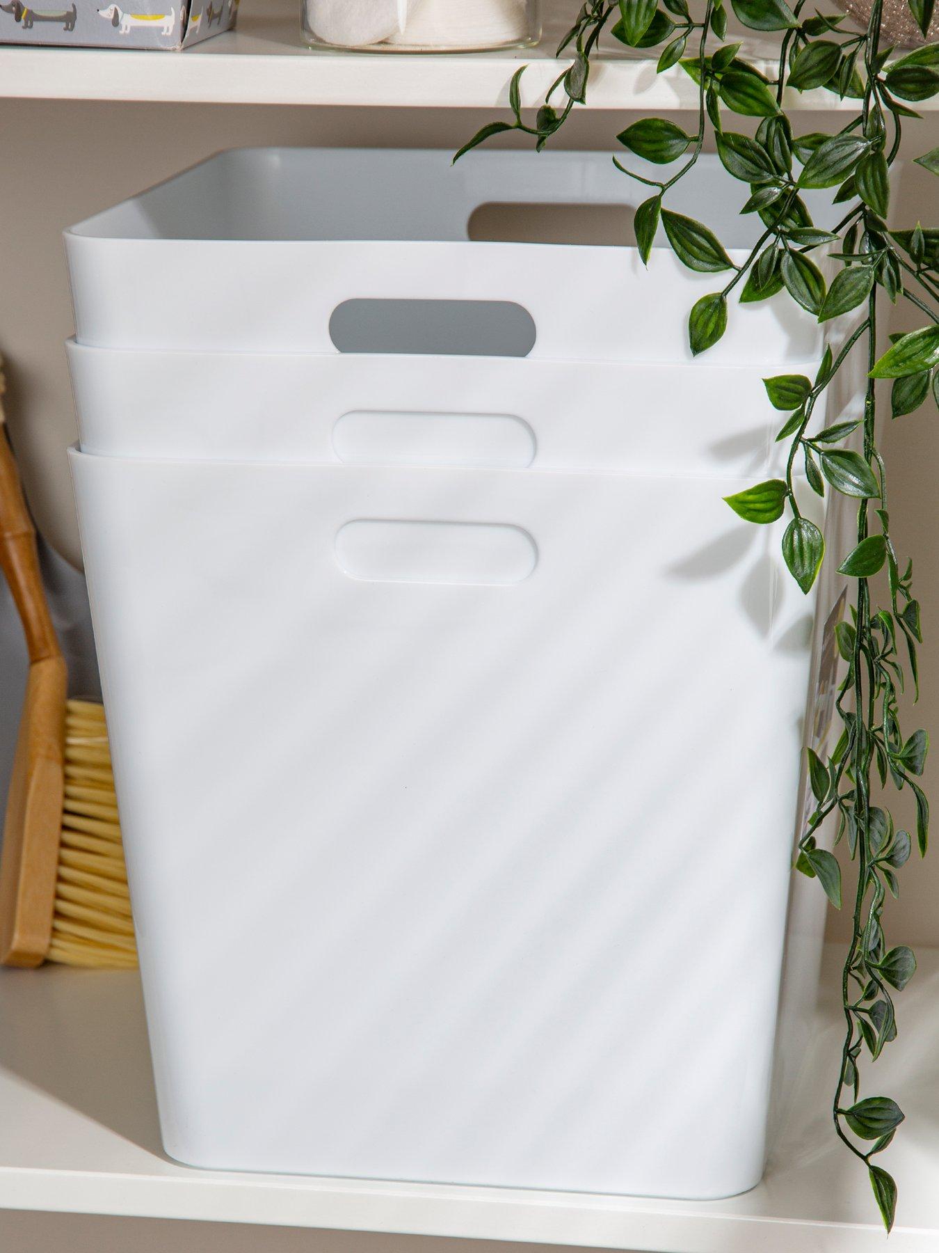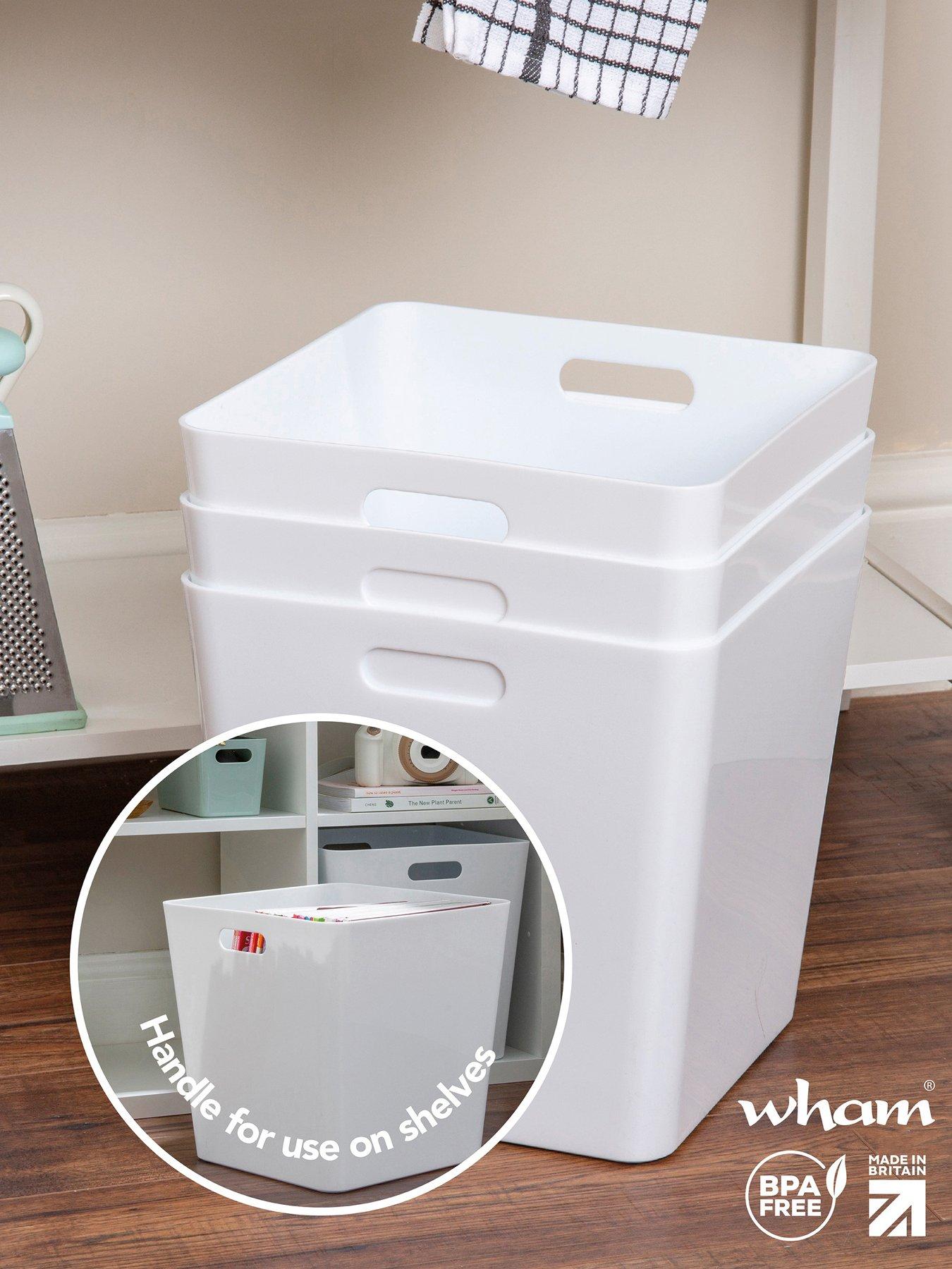 Wham Set 3 Studio Cube BasketsStudio 15.01 Cube Basket. A handy set of 3 contemporary style cube baskets designed to fit in open square shelf unts. Useful to tidy away those items you don't want on display but need easy access. The integral handle makes it easy to slide baskets from shelves. Stylish and contempory with a high gloss finish. White