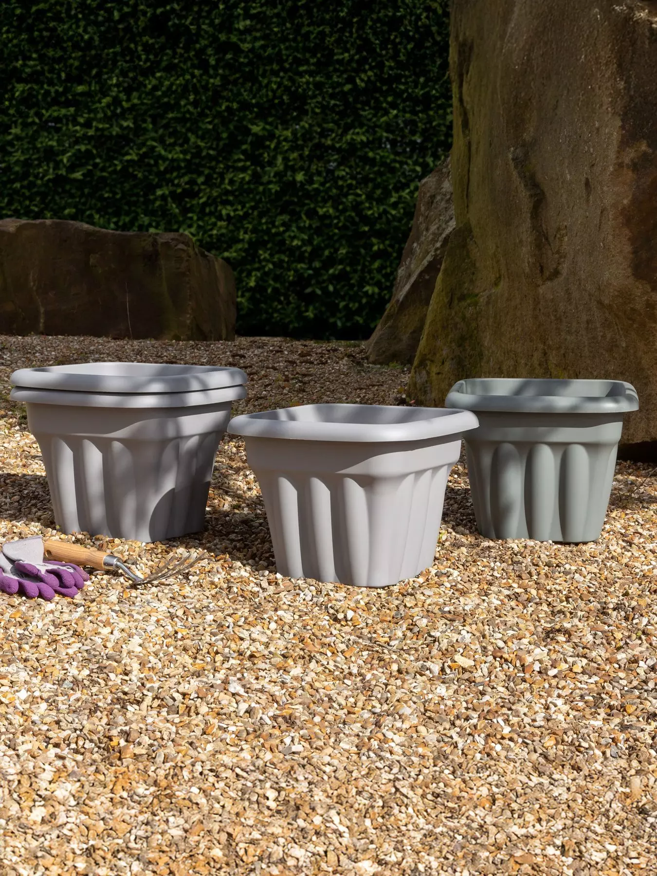 Set of 4 Traditional 33cm Square Planters in Upcycle Grey. This planter is suitable for both indoor and outdoor use being weather resistant and lightweight. Approx 16L Capacity.- Depth: 33 CM