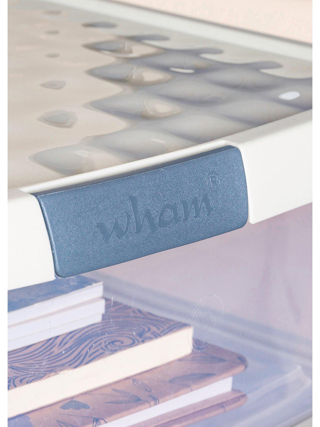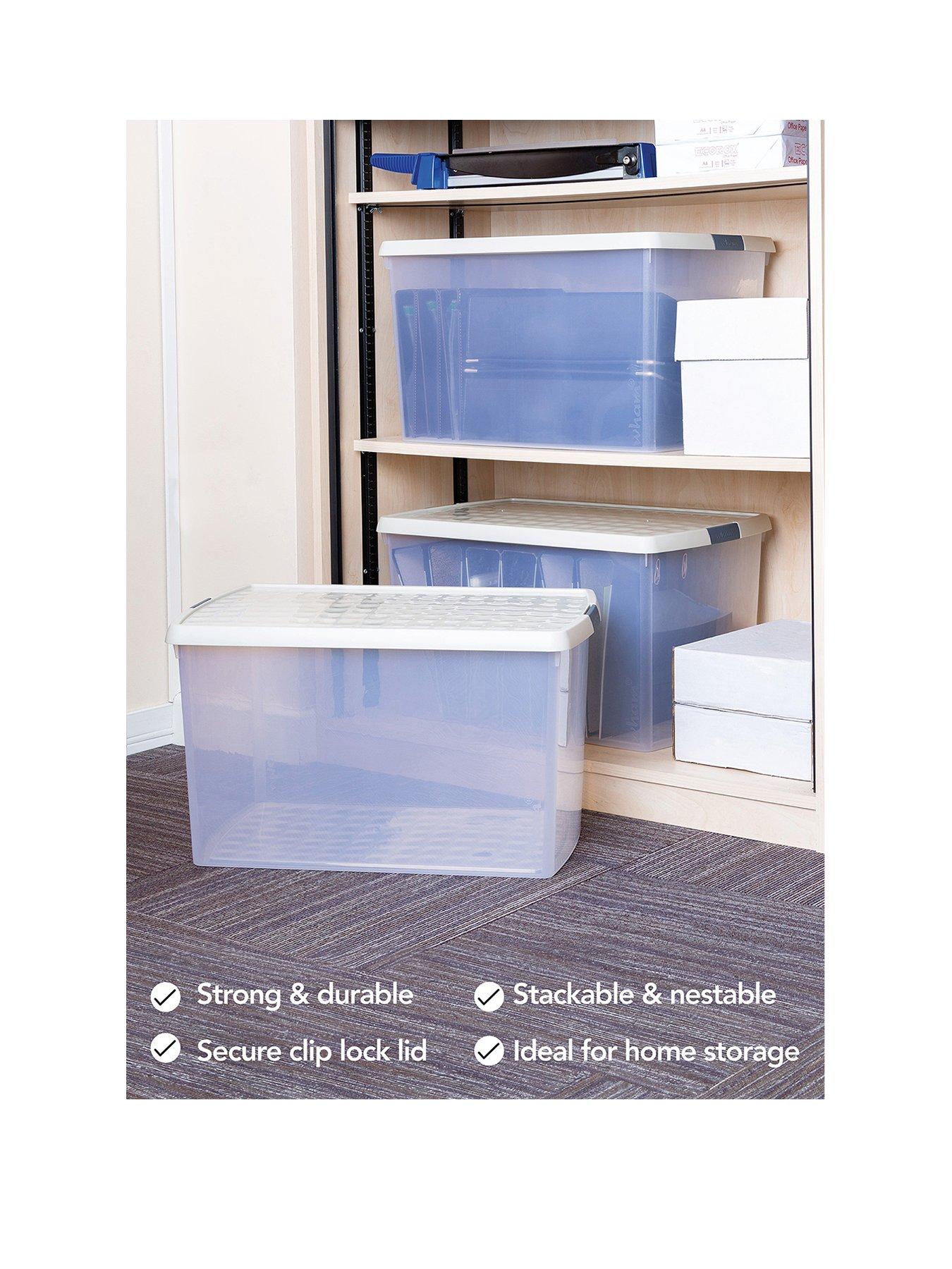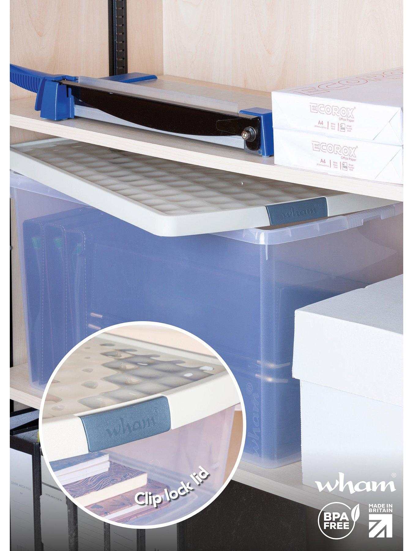 Wham Set of 3 62L Clip Top Rectangular Box & LidWham Clip offers space saving solutions to simplify and arrange every room in your home or workplace. With a clear base to easily view contents, use them to sort and store toys, clothes, household textiles & bedlinen, photographs, travel keepsakes, crafting supplies and more. Stack them to maximise your storage space, pop them on shelves, in cupboards and wardrobes. Wham Clip storage boxes feature a unique 'clip lock' closure to securely lock the lid in place. The clip features the Wham brand and forms part of the lid. Simply place the lid on top of the base and push the clips down to lock. To open, gently ease the clips in an upward motion. Wham Clip is manufactured by What More UK from 1st grade materials and to a durable, high specification. We use the finest quality materials. All our1st grade plastic boxes are BPA free, making them ideal for food storage. Innovative space saving storage solutions for your home and workplace. Wham Clip is designed to organise your everyday life. Declutter and arrange space to its full potential. Wham Clip storage boxes neatly nest together when not in use and can also stack safely when required. 62L Capacity. DIMENSIONS: 59.5 x 39.5 x 33.5cm (EXTERNAL) / 52.5 x 32.5 x 33cm (INTERNAL). Made in Britain.