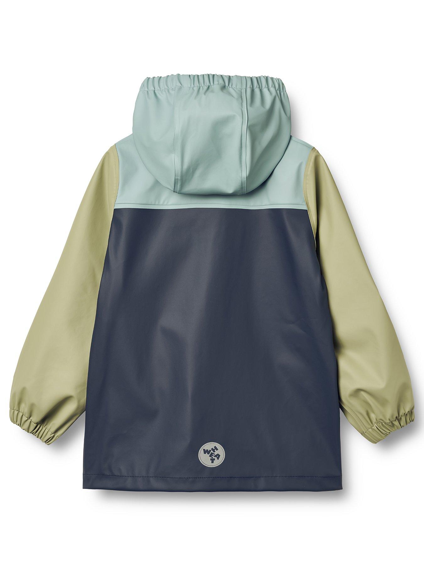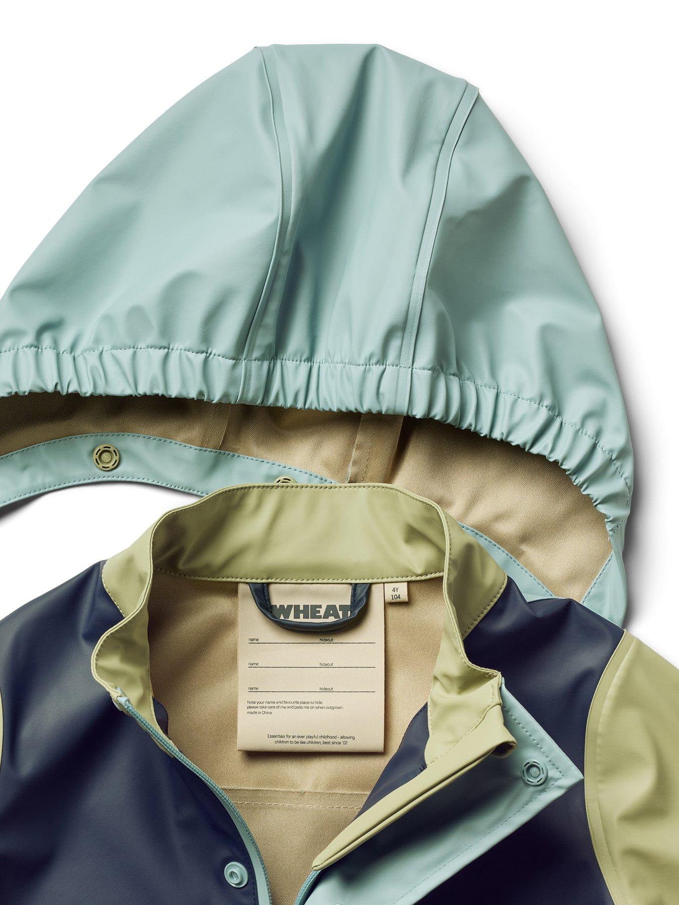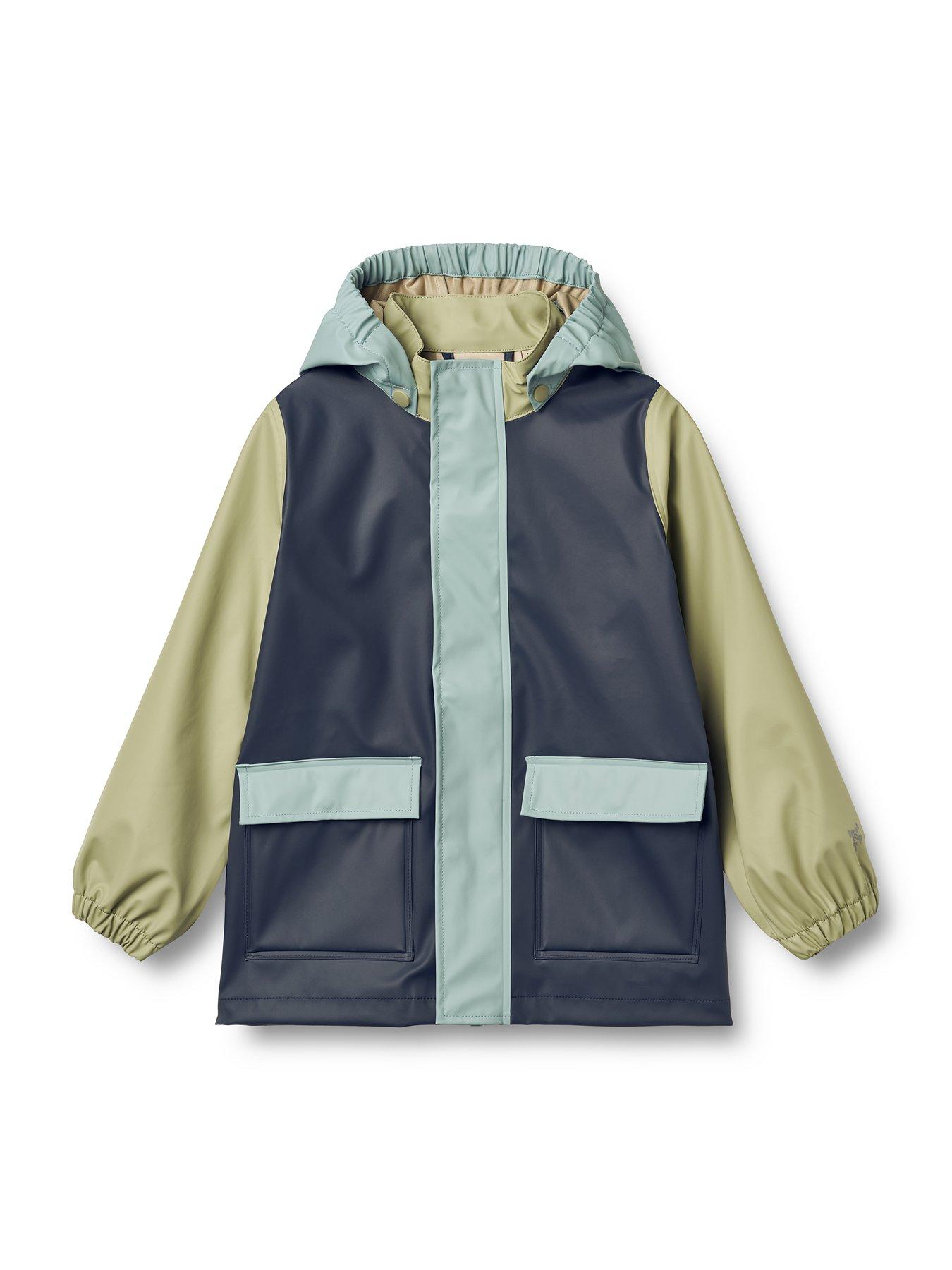 Wheat Boys Colourblock Rain Jacket - NavyPractical rain jacket with color block in waterproof and durable material for children.Wheat's practical rainwear is an essential part of your child's wardrobe. It is made in a super soft and lightweight material that makes it comfortable for your child to wear and move in. It's waterproof and dirt resistant and is therefore easy to clean with a wet cloth after a muddy afternoon on the playground. The rain jacket has a detachable hood, pockets, elastics at the cuffs and waterproof zipper. The jacket has matching trousers or overalls, so you can get the complete rainwear set.