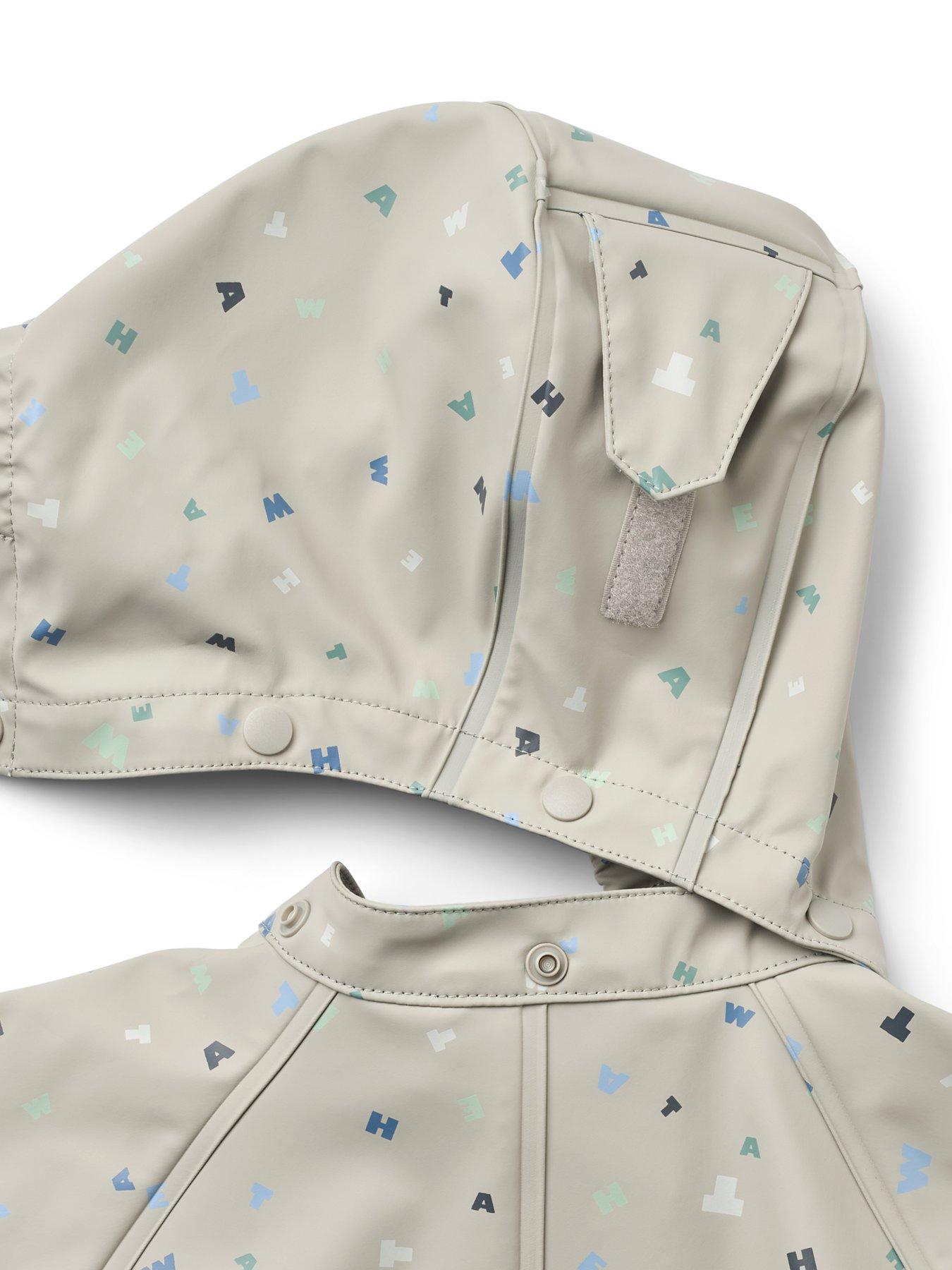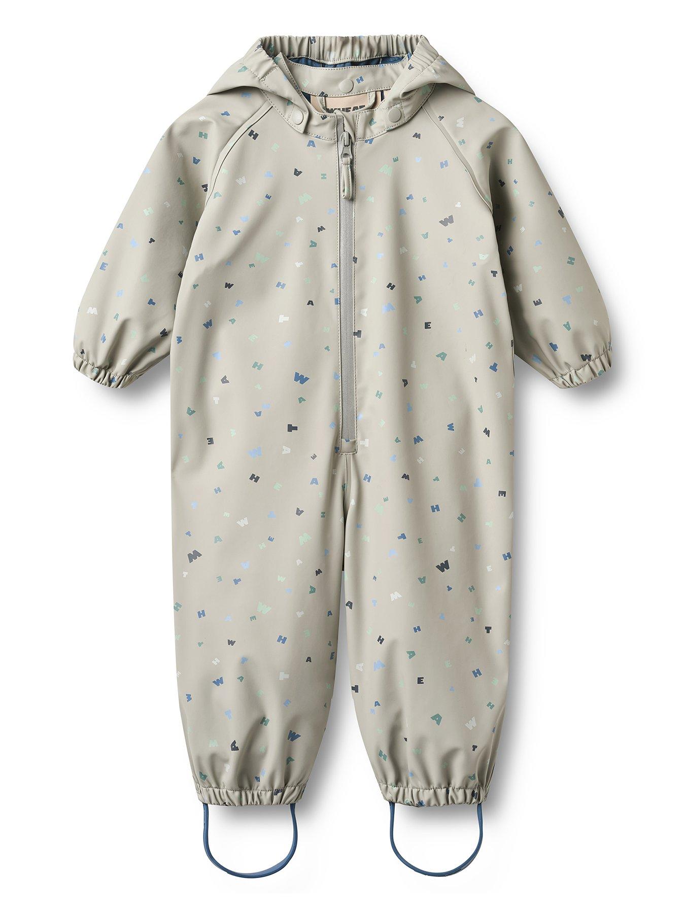 Wheat Boys Mike Letters Printed Rainsuit - GreyPractical rainsuit with print in a lightweight and waterproof material for babies.Our practical rainwear is an essential part of your childs wardrobe, as it is made in a super soft and lightweight material that makes it comfortable for your child to wear and move in. Its waterproof and dirt resistant and is therefore easy to clean with a wet cloth after a muddy afternoon on the playground. The suit is perfect for long walks and visits to the playground during the everchanging seasons. --- - Waterproof: 8.000 mm - Welded seams - Water-borne PU (Polyurethane) - Flourine free water and soil repellent finish - PFC-free (water-repellent finish without harmful fluorochemicals)