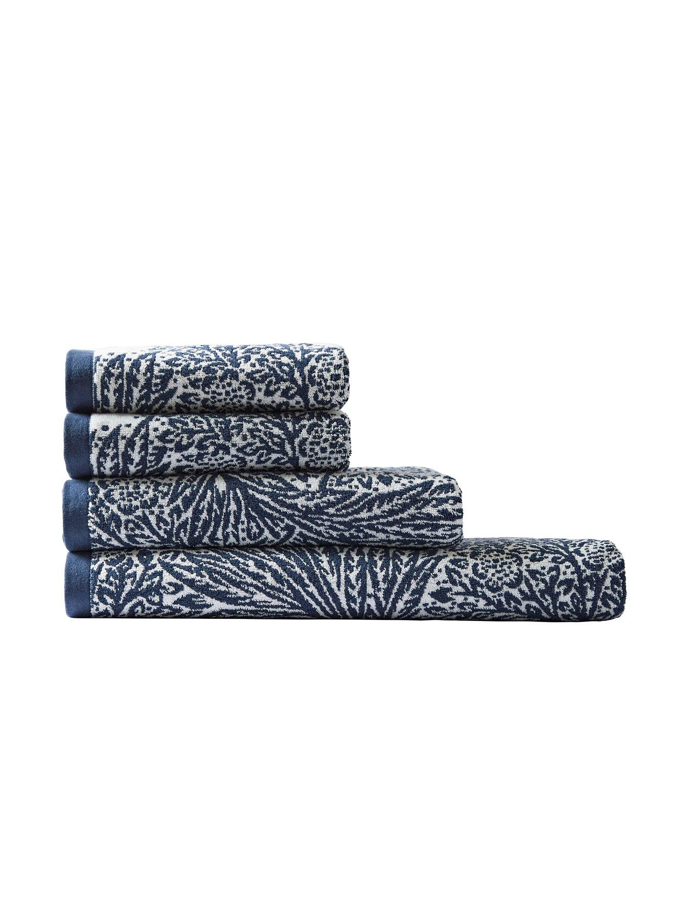 William Morris at Home Marigold 100% Cotton 50x90cm Hand TowelRich Prussian blue and fresh cream cotton yarns are woven together to translate William Morris's iconic two-colour, Marigold pattern onto these luxuriously soft towels. Bold marigold flowers among willow-like leaves are set against a background of smaller foliage, the towel edges are finished with a co-ordinating rich, plain border detail. - Rich Prussian blue and fresh cream cotton yarns are woven together to translate William Morris' iconic two-colour Marigold pattern.- Luxuriously soft, 100% cotton towels. - Co-ordinating and rich coloured plain border detail.