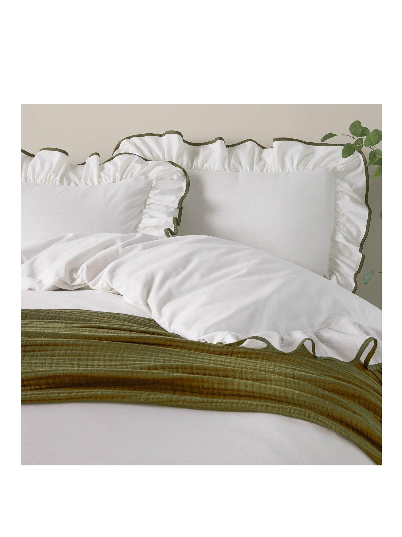 Wylder Blousey Duvet Set OliveTransform your bedroom into a sanctuary of understated elegance with the Blousey Cotton Ruffle Duvet Cover Set. Crafted from 100% cotton sateen with a luxurious 180 thread count, this duvet set feels exquisitely soft against the skin while offering breathability for year-round comfort. The refined simplicity of its plain design is elevated by a ruffled trim on the duvet and pillowcases, delicately finished with a subtle piped detail in contrasting tones. Perfect for layering with textured throws and cushions, it effortlessly combines a relaxed charm with modern luxury, creating a tranquil yet stylish retreat you'll love coming home to.