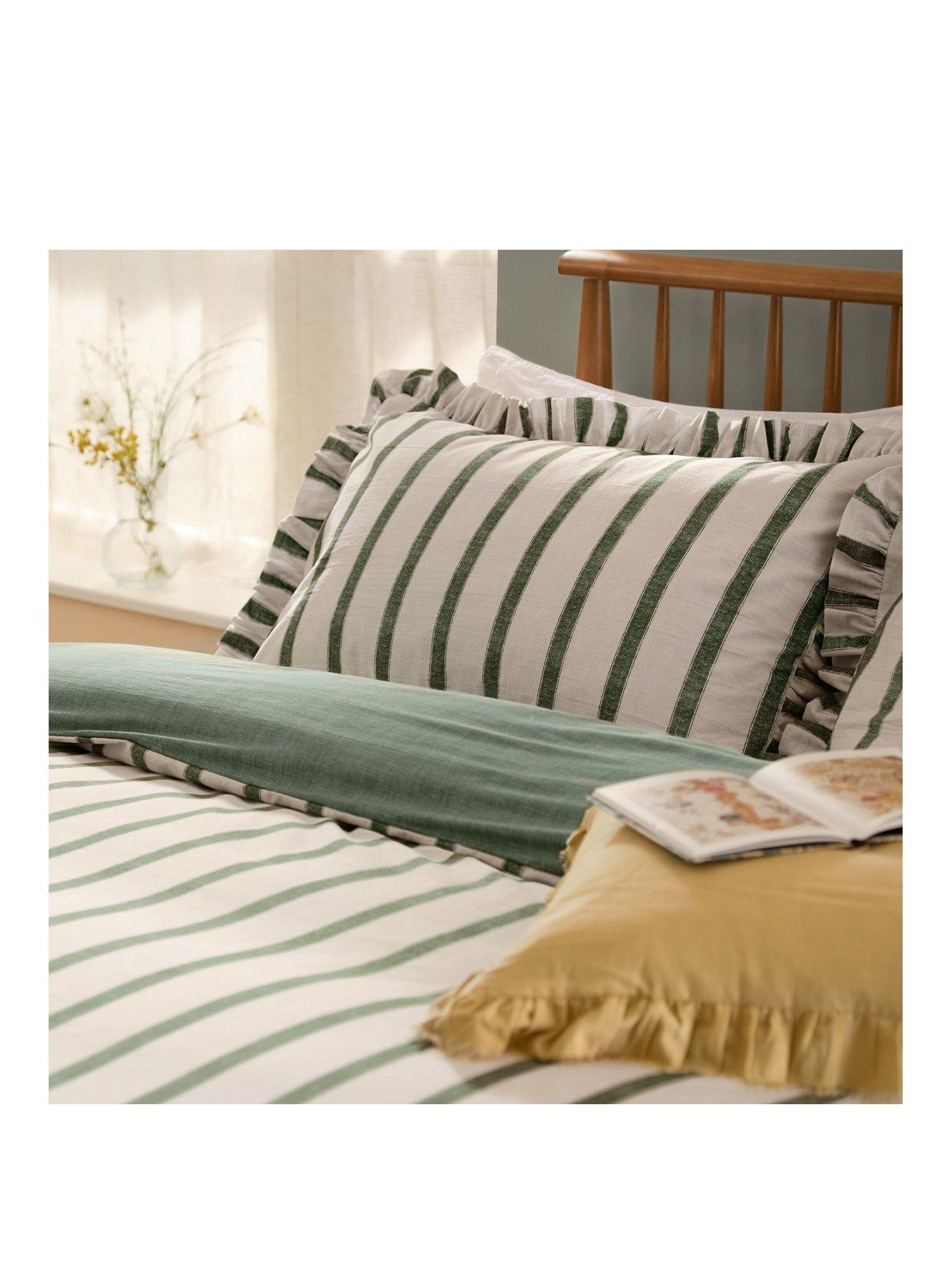 Wylder Connie Duvet Set MossMade from soft, cotton-rich fabric, the Connie Duvet Cover Set features a chic stripe ruffle trim and a refined linen-look stripe design. Its style showcases bold stripes on one side and a plain colour-matched reverse, making it adaptable to various decor styles. Perfect for creating a serene yet sophisticated atmosphere, this premium duvet set combines enduring comfort and style for a truly polished finish.