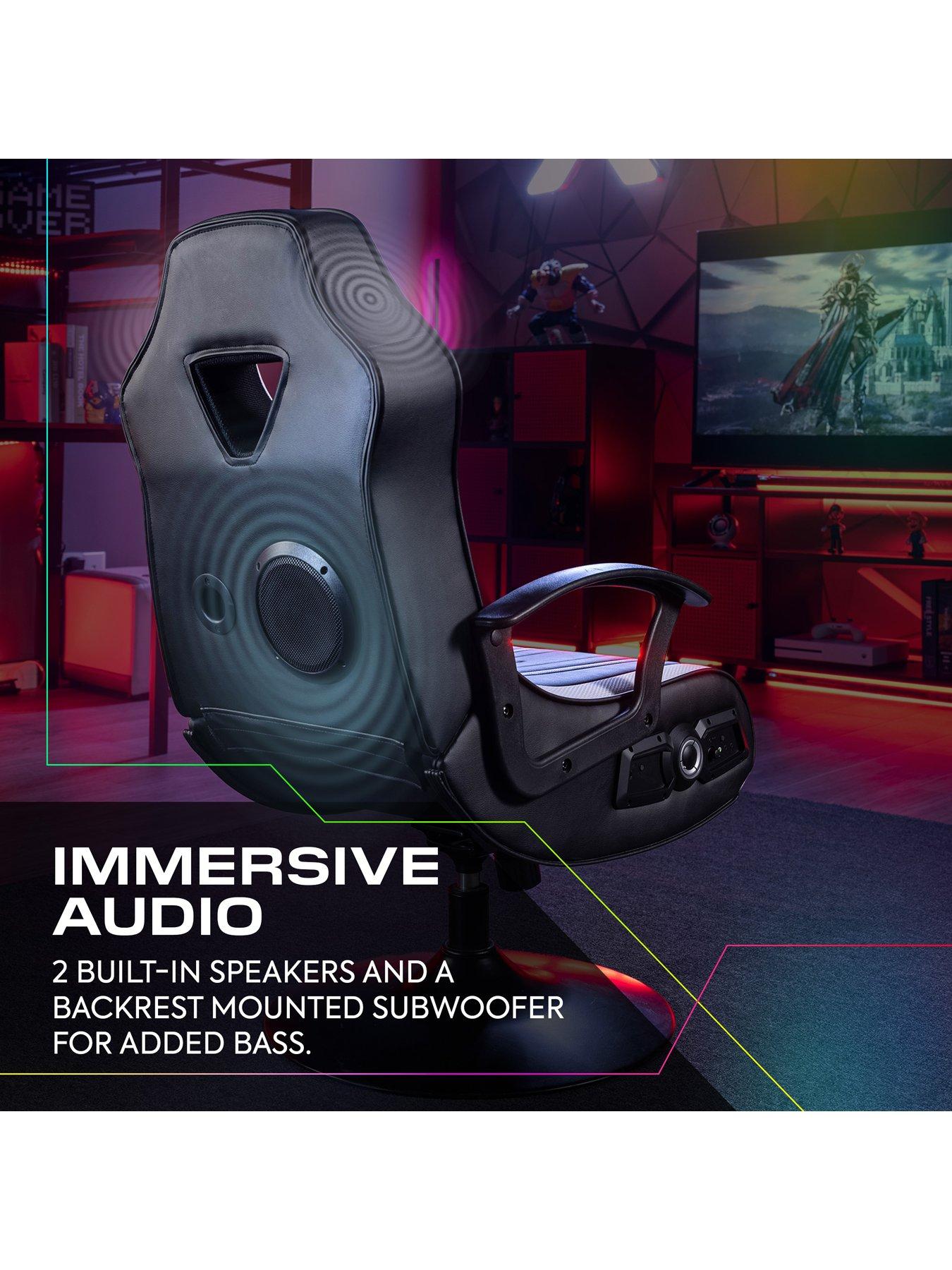 X Rocker Aries RGB Stereo Audio Pedestal Gaming chair with App-Controlled RGB lightPerfect for long hours of gaming, the Aries RGB is perfectly sized for kids, teens and growing gamers, ensuring a natural seating position for console gaming.The Cool RGB lighting can be totally customised to fit your style with your own unique glow and pattern! Choose from over 200 different colour modes, patterns and light effects, including a sound-reactive option for something truly special. The Aries RGB features 2 headrest mounted speakers and a backrest mounted subwoofer that allow you to feel the action in your favourite games, movies and music with impactful vibration that reacts to the audio. Game for hours thanks to a generous foam padded interior and rich faux leather material, designed to support a correct seating posture no matter how long the gaming sesh! Ready to go right from the box, simply unfold the Aries RGB add the armrests and base, plug it in to your favourite games console or mobile device and youre ready to go! When you're all done, simply fold it down and store it away to ensure a clean and tidy gaming space. |