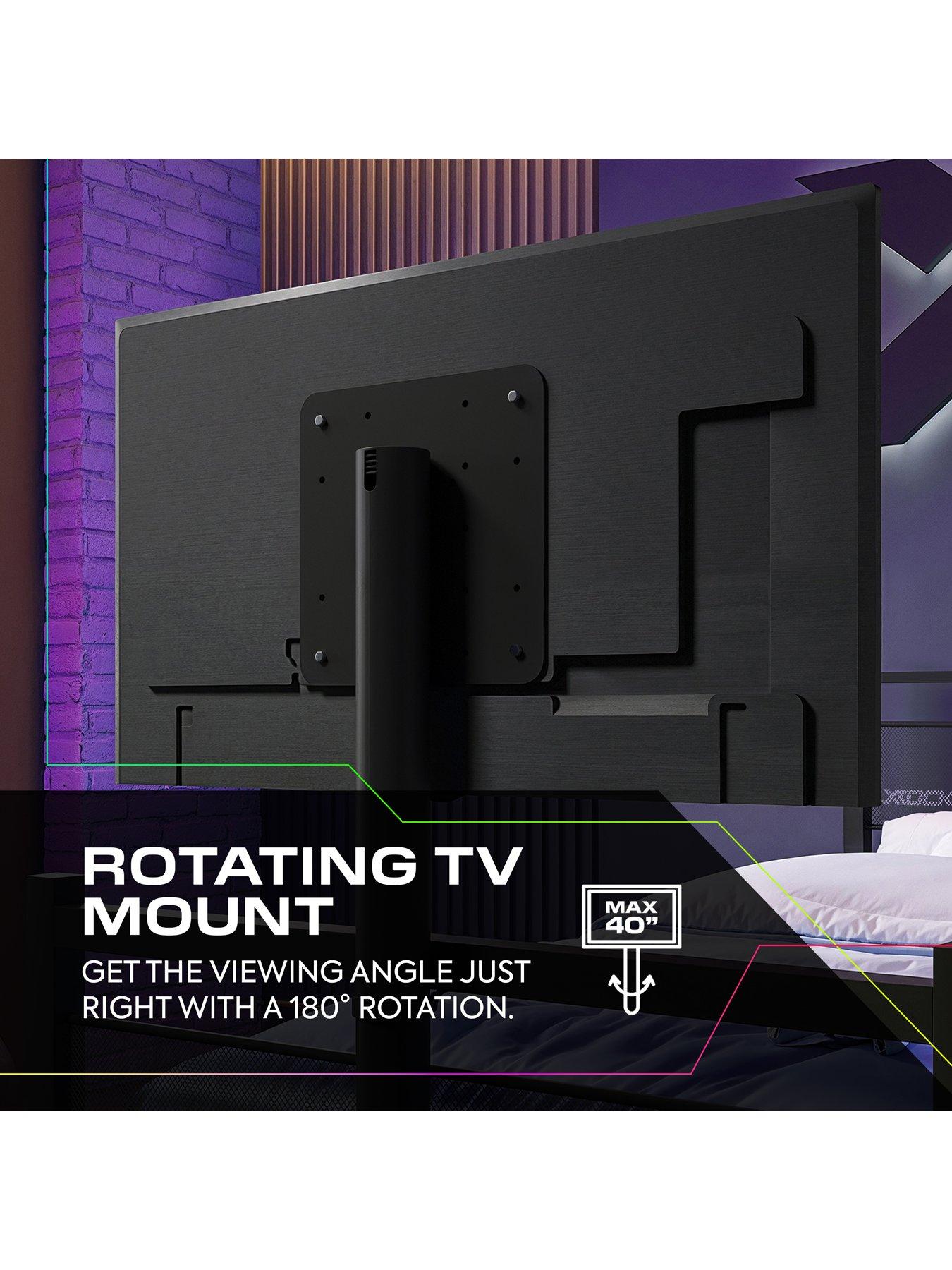 X Rocker Basecamp Single Bed App Controlled LED LightElevate your bedroom to the next level with the Basecamp RGB TV Gaming Bed - a sleek, space-saving bed built for kids and teens who live and breathe entertainment. Whether battling through their favourite titles or kicking back with a film, the Basecamp RGB TV Bed turns your bedroom space into something truly special with the adjustable rotating TV platform. Securely holding screens up to 40", the Basecamp gives you the ideal viewing angle to enjoy your favourites. Keep your room nice and tidy with the underbed mesh storage tray, perfect for the latest gen consoles and tv boxes, keeping them cool during even the most intense gaming sessions. Equipped with Neo Motion Sync LED technology, you can customise your vibe with over 200 lighting modes, effects, and sound-reactive settings - all controlled via the app. Sync the lighting across compatible Neo Motion products and watch your room come to life in perfect harmony. Whether you're battling through your favourite titles or kicking back with a film, the Basecamp RGB Bed turns your bedroom into a next-level entertainment station.Mattress, bedding, and accessories not included unless stated.