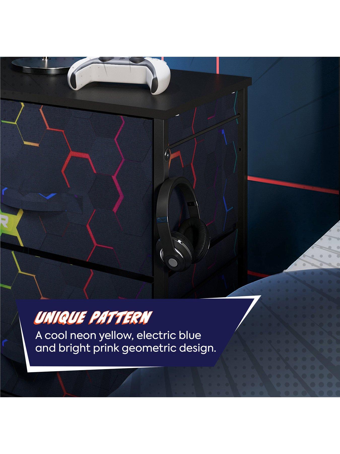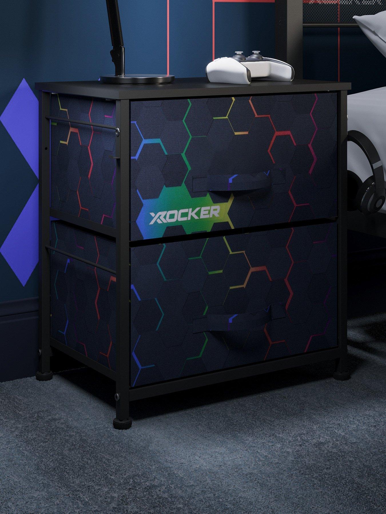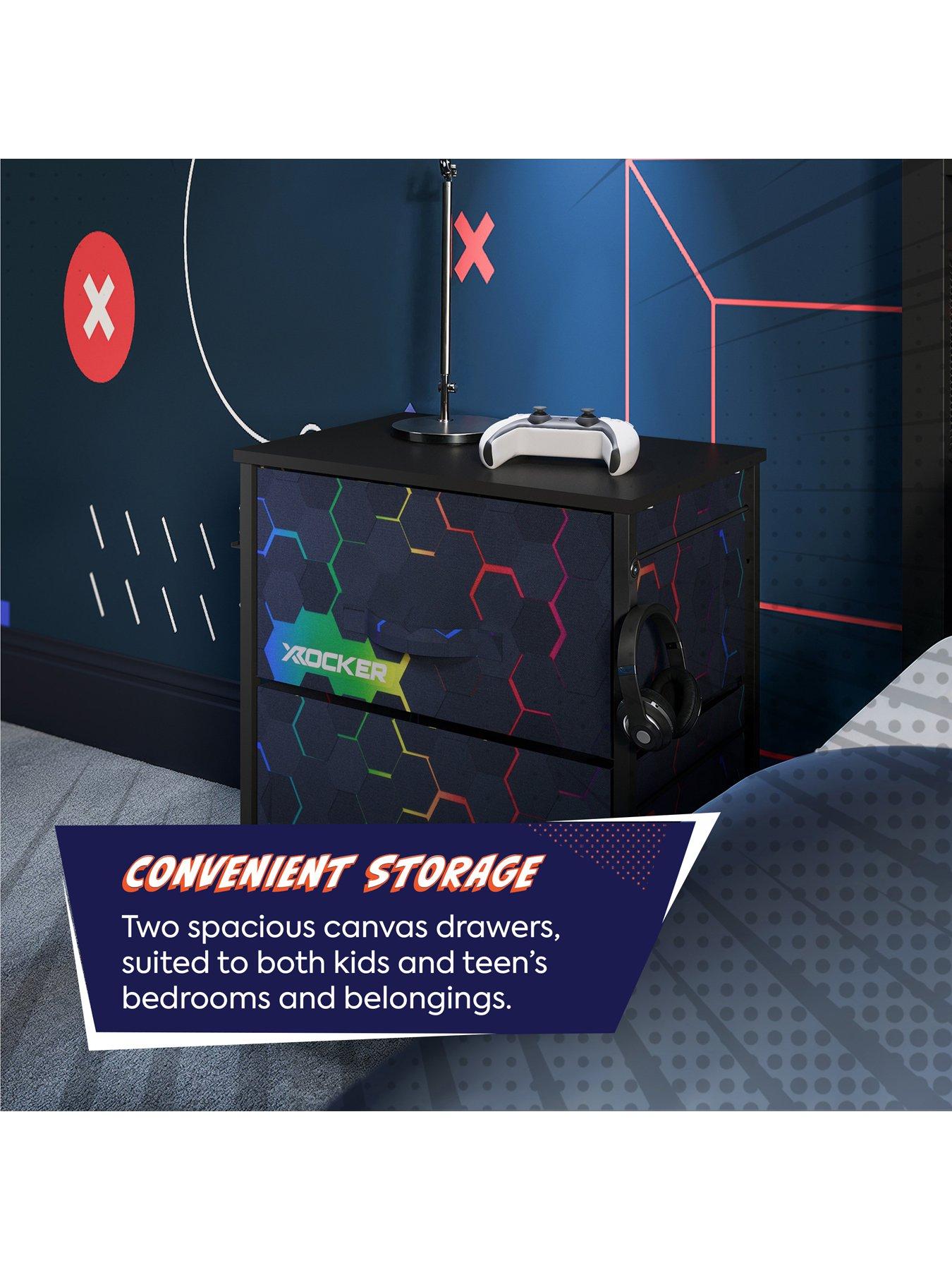 X Rocker Hex Canvas BedsideKeep your space neat, safe, and stylish with the Hex Print Canvas Bedside-a practical storage solution with a fun, modern twist-a perfect companion piece for a kid or teens bedroom. Designed with growing gamers in mind, the bedside features two lightweight yet durable drawers, perfect for storing everything from headphones and controllers to books, clothes, and cozy blankets. The sleek black wooden top offers the ideal spot for displaying collectibles or a gaming headset, while the sturdy steel frame with built-in back support and wall attachments keeps things stable-even during the most energetic play sessions. Easy to assemble and compact enough to fit in bedrooms or playrooms, the Hex Print Bedside helps kids stay organised while giving parents peace of mind. A smart, stylish way to keep clutter under control-so your young gamer can focus on the fun.