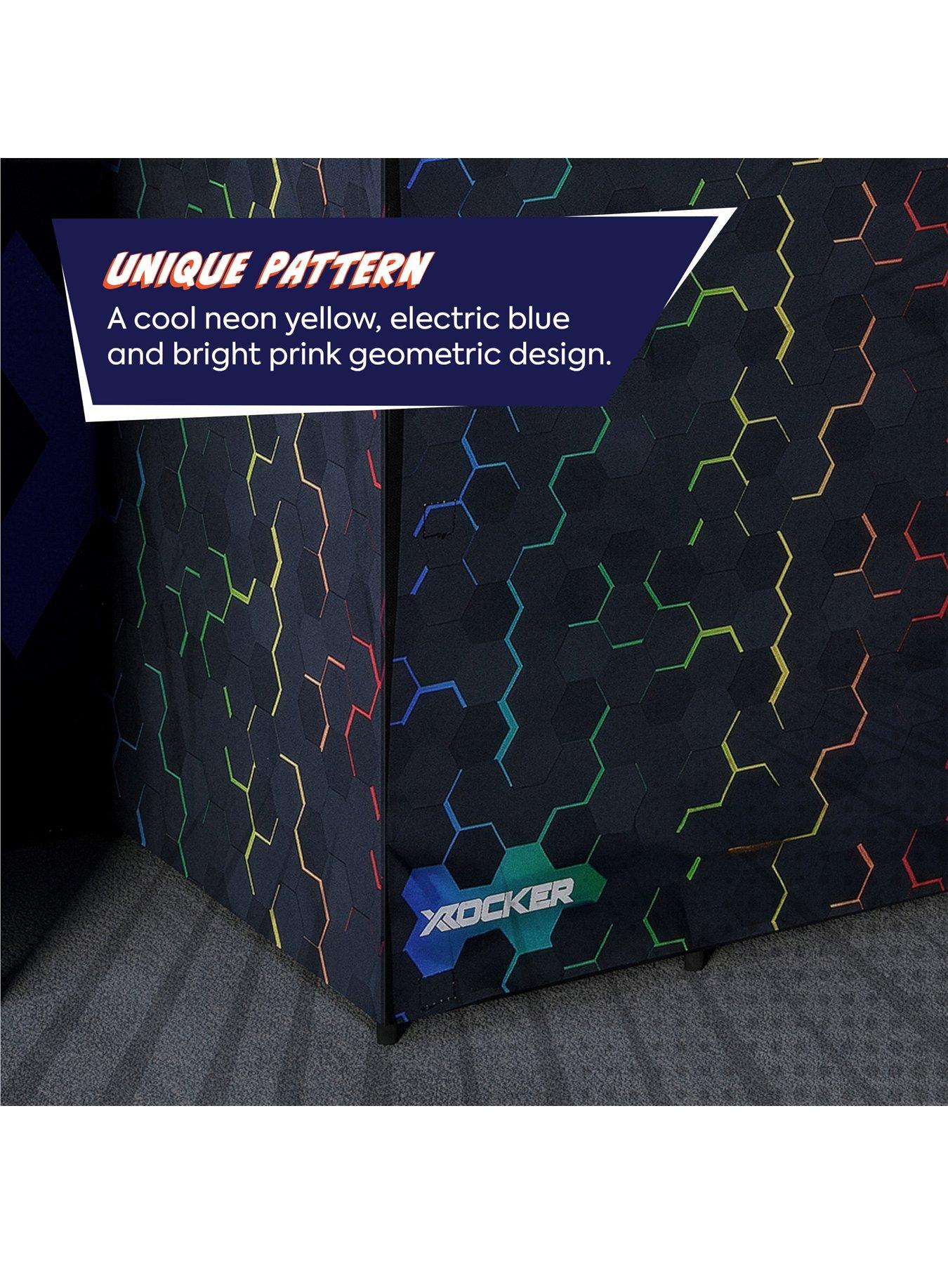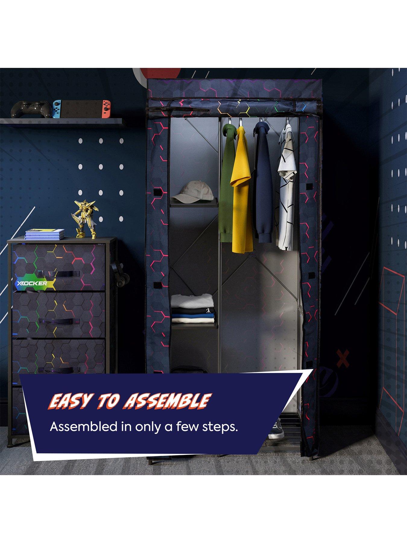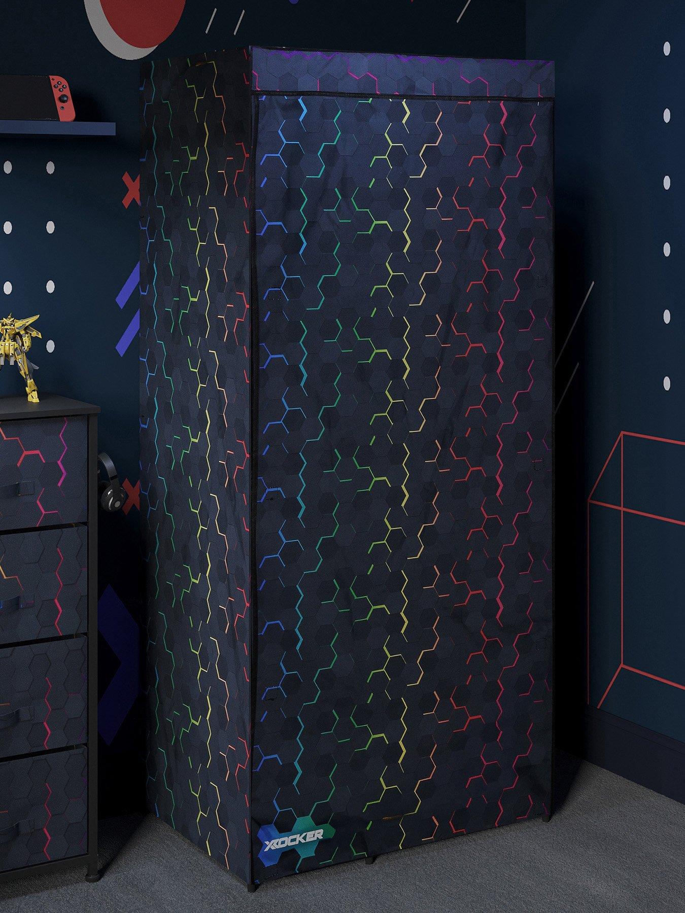 X Rocker Hex Canvas WardrobeKeep your space neat, safe, and stylish with the Hex Print Canvas Wardrobe-a practical storage solution with a fun, modern twist-perfect for a kid or teens bedroom. Designed with growing gamers in mind, this wardrobe features three durable shelves and a hanging space for plenty of clothes, perfect for storing everything from shirts and socks to books, accessories, and cozy blankets. The sleek black wooden top offers the ideal spot for displaying collectibles or a gaming headset, while the sturdy steel frame with built-in back support and wall attachments keeps things stable-even during the most energetic play sessions. Easy to assemble and compact enough to fit in bedrooms, or playrooms, the Hex Print Wardrobe helps kids stay organised while giving parents peace of mind. A smart, stylish way to keep clutter under control-so your young gamer can focus on the fun.