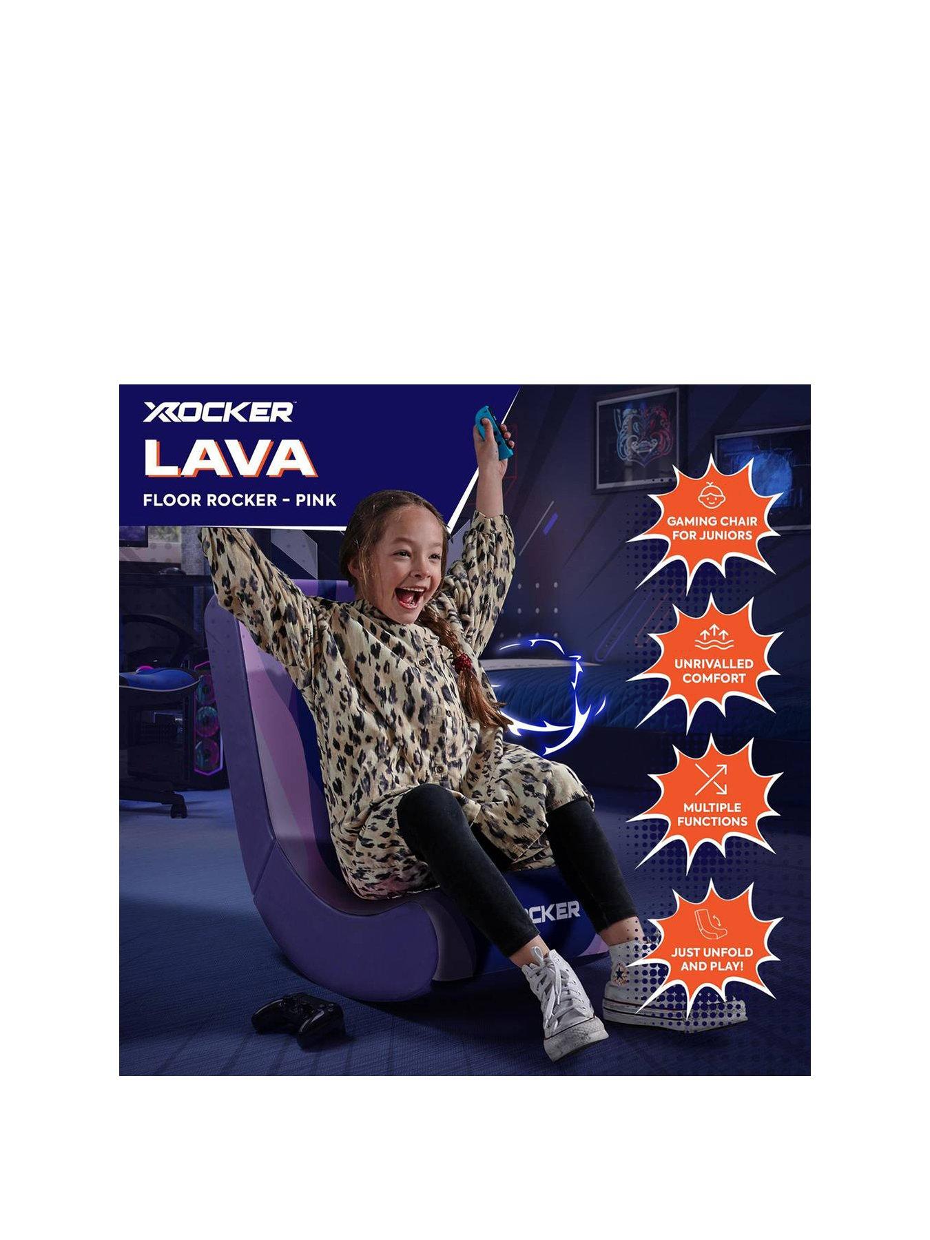 X Rocker Video Rocker Gaming Chair for Kids - Lava PinkDesigned with young gamers in mind, the Video Rocker offers a safe and supportive seating option that kids will love when gaming for hours at a time. Its low-to-the-ground, stable rocking base encourages natural movement all the while keeping a comfortable and supportive seating position. Featuring a vibrant lava-print design, the Video Rocker adds a playful touch to any bedroom, playroom, or family space. Whether gaming, watching movies, or just relaxing with friends, this chair provides hours of ergonomic comfort-without taking up too much space. When they're all done, simply fold up the Rocker and store it away!