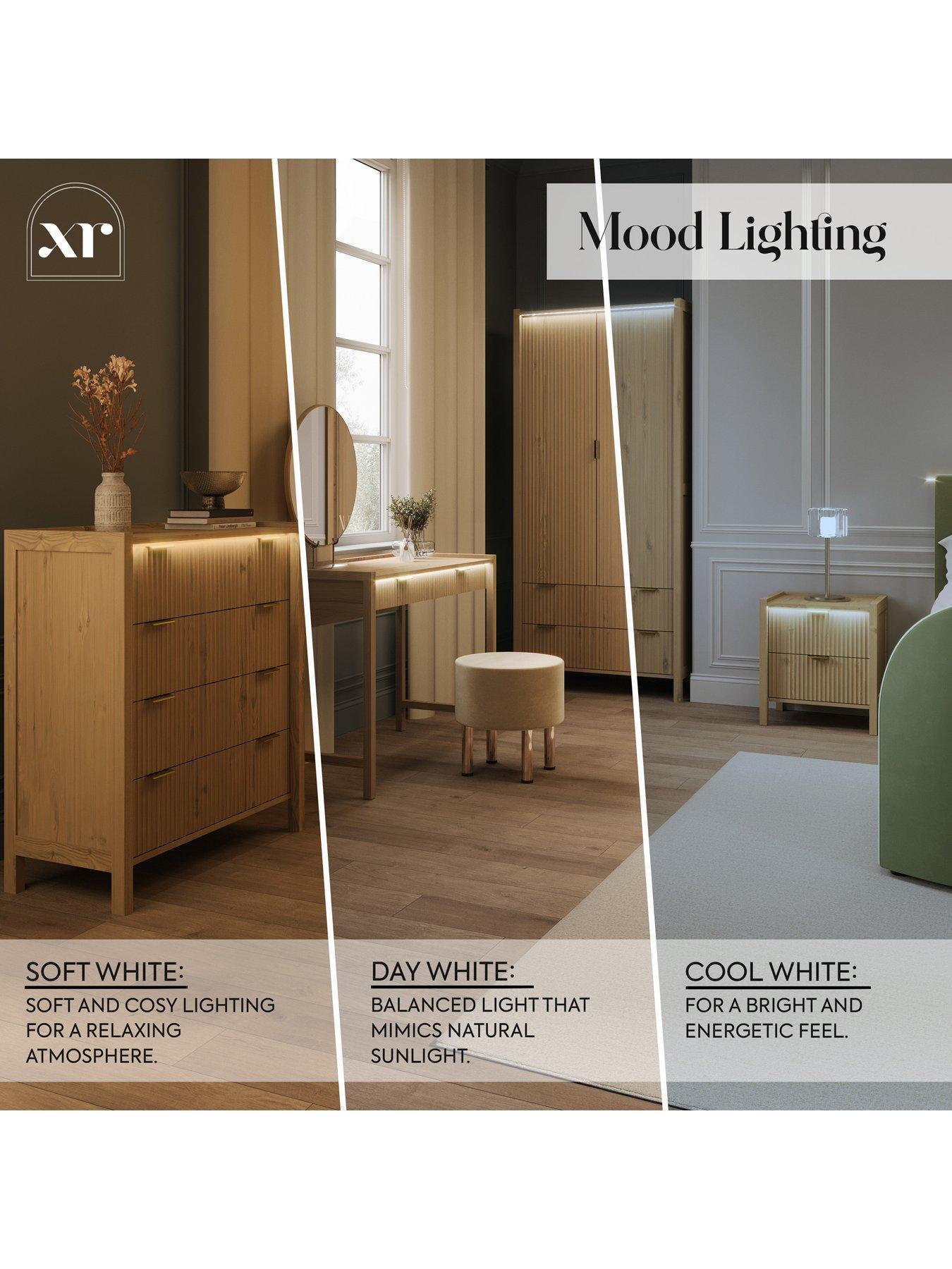 XR Living Dakota Dressing Table With App Control Lights - OakThe Dakota dressing table in a warm wild oak effect finish combines natural texture with modern functionality. Designed with integrated lighting, it features touch-button or app-controlled LEDs that softly illuminate from the front top edge. The gentle glow cascades down over the fluted drawer front, highlighting its elegant detailing and creating a calm, ambient atmosphere, perfect for winding down at the end of the day.